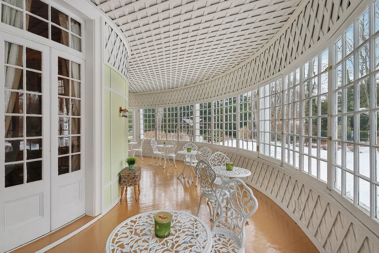 The interior showcases a grand foyer, a formal living room with floor-to-ceiling curved glass windows and a wood-burning fireplace, and a formal dining room with its own fireplace and access to a charming latticed solarium. Culinary enthusiasts will appreciate the custom kitchen featuring high-end Sub Zero, DCS, and Kitchen Aid stainless steel appliances, opening to a bright breakfast area and a family room with vaulted ceilings and a skylight. The primary suite is a sanctuary, complete with curved windows, a wood-burning fireplace, a marble bathroom with a steam shower and Jacuzzi tub, and an expansive walk-in closet.