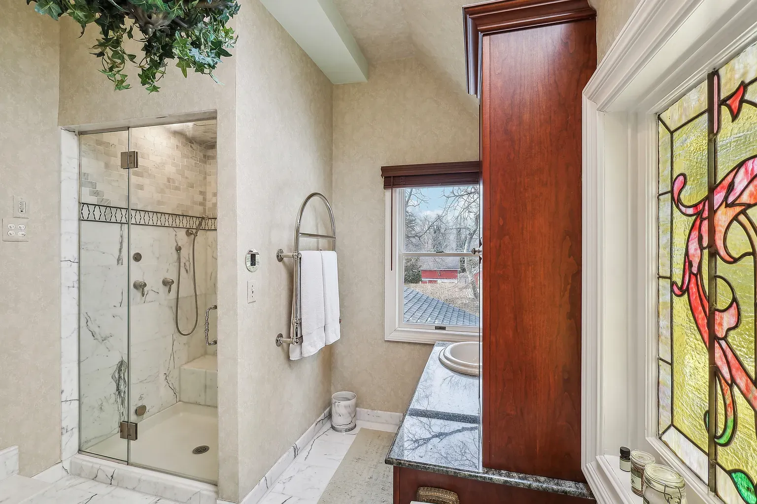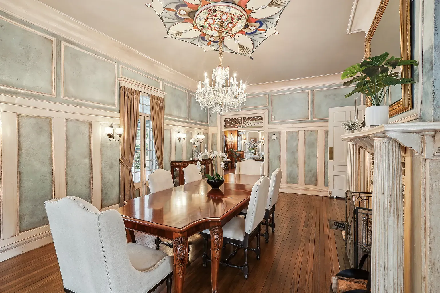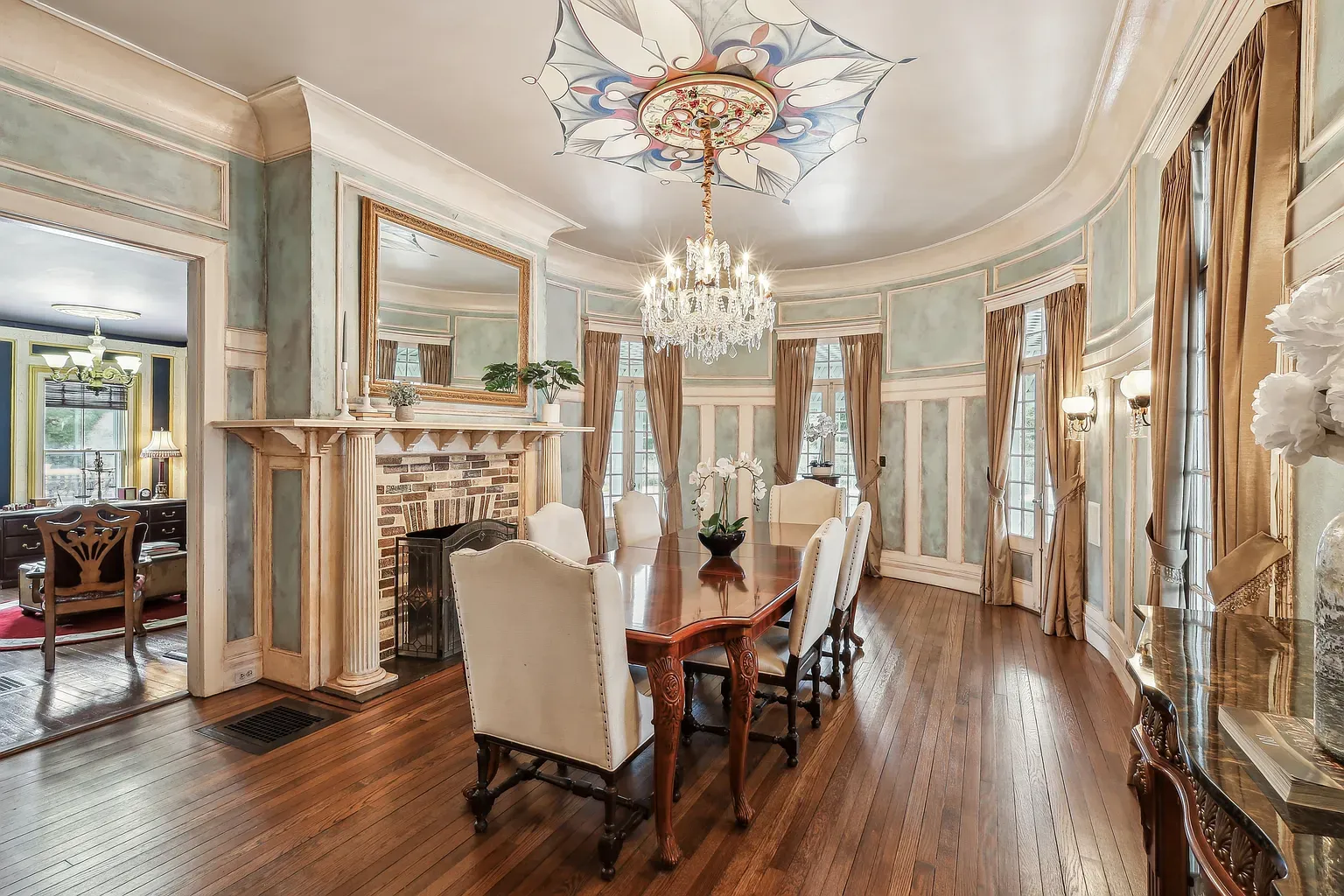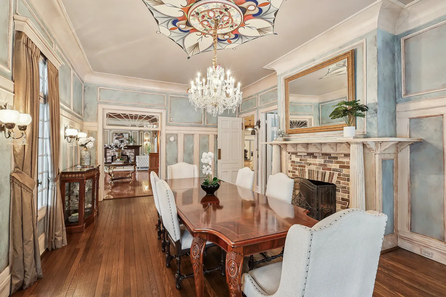 From the moment you enter through the secure gates and up the new paver driveway to the front parking circle, you’ll be captivated by the refined grandeur, featuring a wrap-around porch, a stunning grand entry foyer with hand-carved oak woodwork, coffered hand-painted ceilings, and intricate Tiffany-style stained-glass windows.