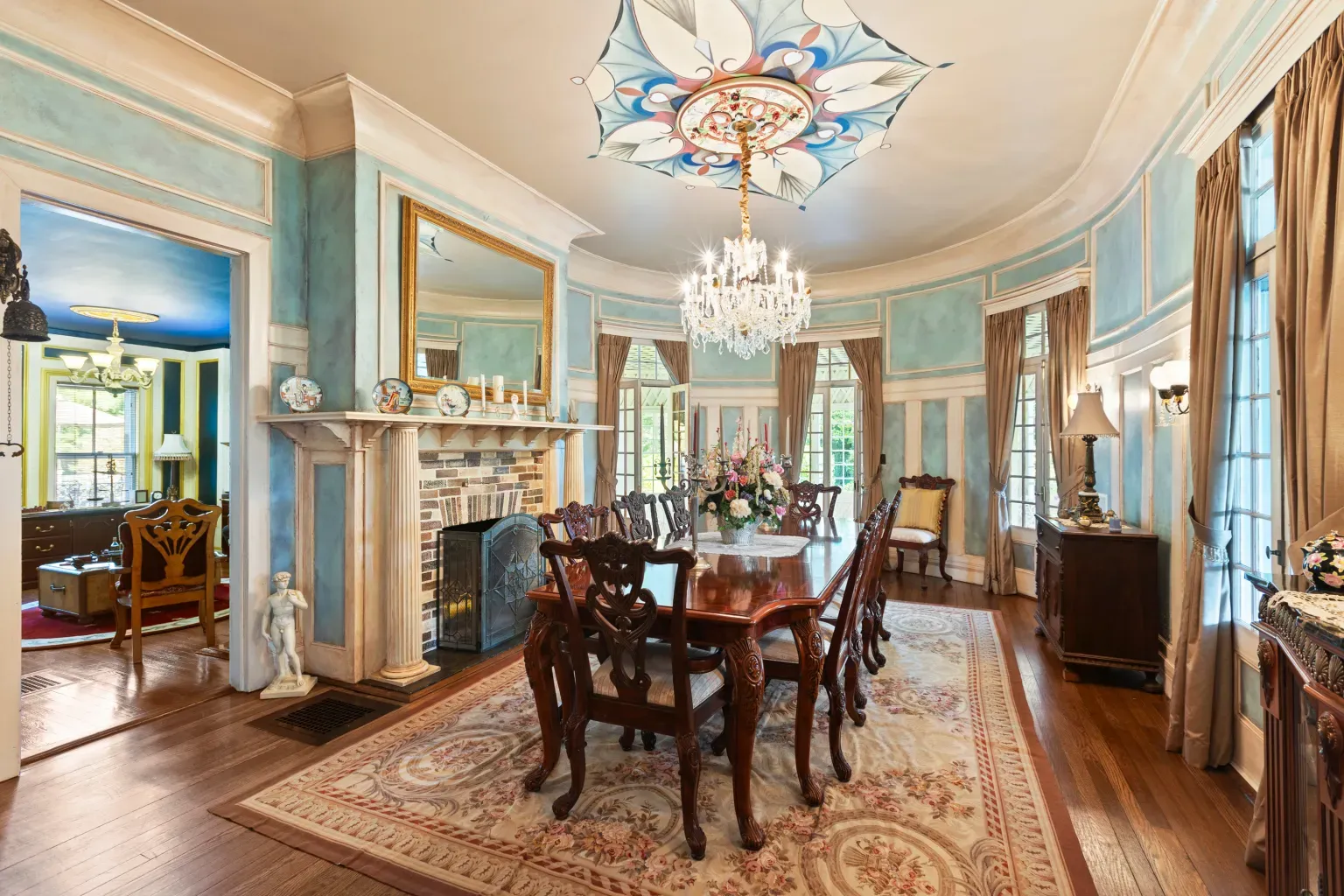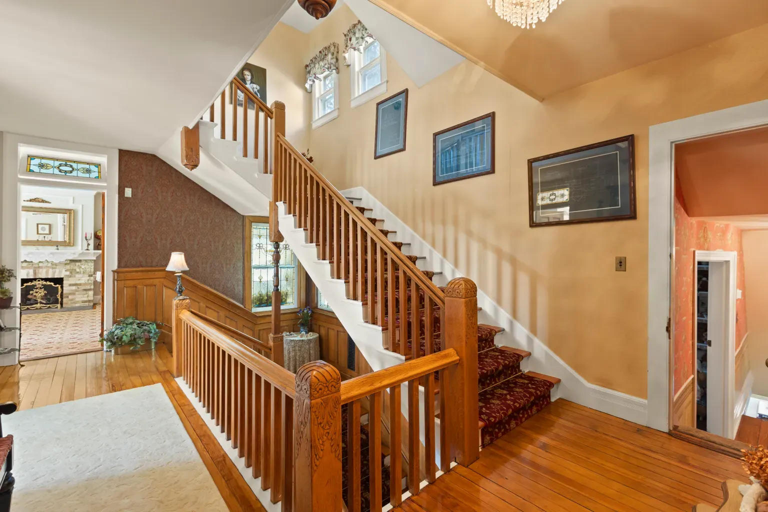 The grand entry foyer boasts exquisite hand-carved oak woodwork, coffered ceilings, and Tiffany-style stained-glass windows, setting a tone of refined luxury.