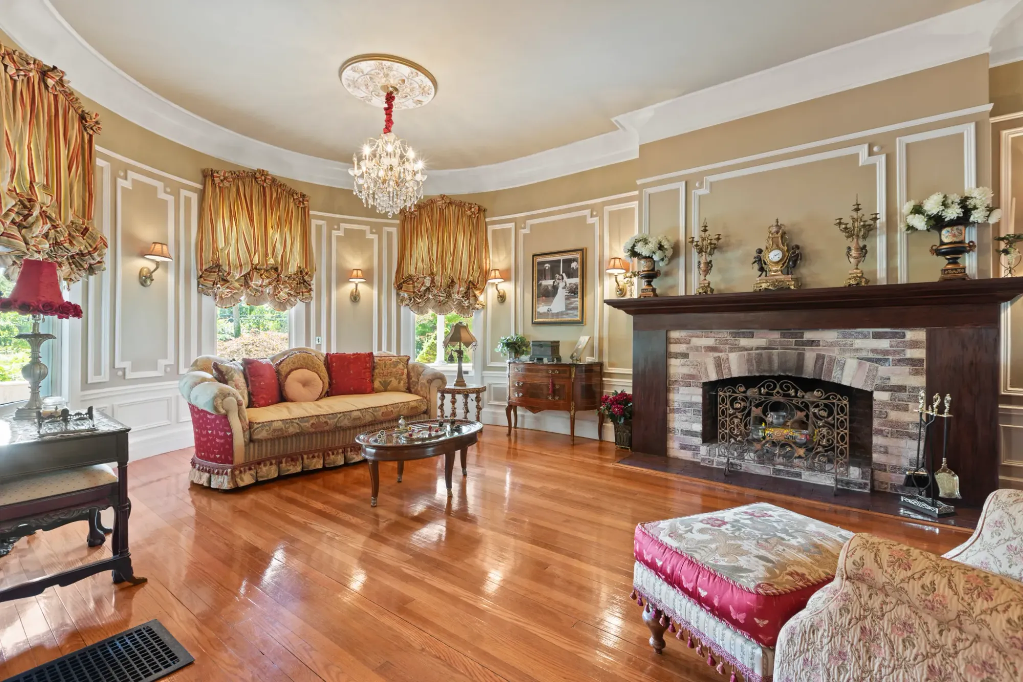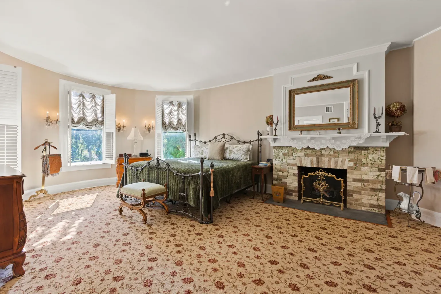 The primary suite is a private sanctuary, complete with a wood-burning fireplace, a spa-like marble bathroom with a steam shower and Jacuzzi tub, and an expansive walk-in closet. A library with a fireplace and a front balcony offers additional space for relaxation and enjoying the breathtaking grounds.