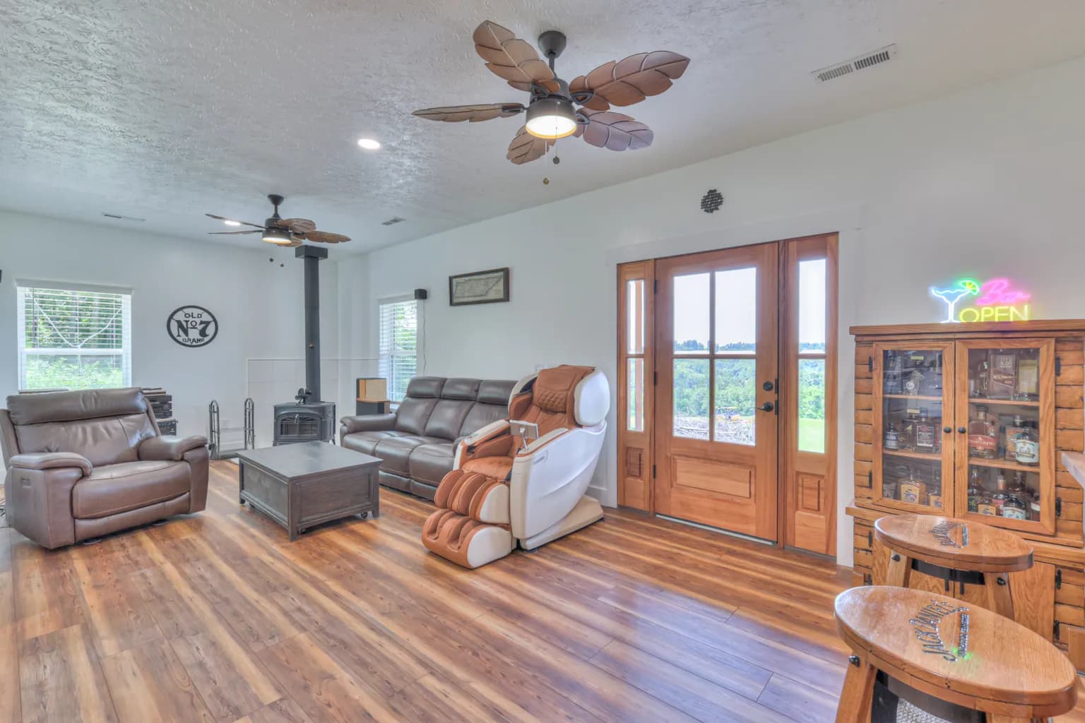 The property ensures peace of mind with a whole-house generator and a comprehensive water filtration system. Spanning 32 acres, the land is 90% fenced, cattle-ready, and features rolling hills with a balanced mix of pasture and mature woods. Additional structures include two cabins, one serving as a chicken coop and the other as a shooting lodge, alongside a shooting range, a water storage system, and a solar-ready setup.