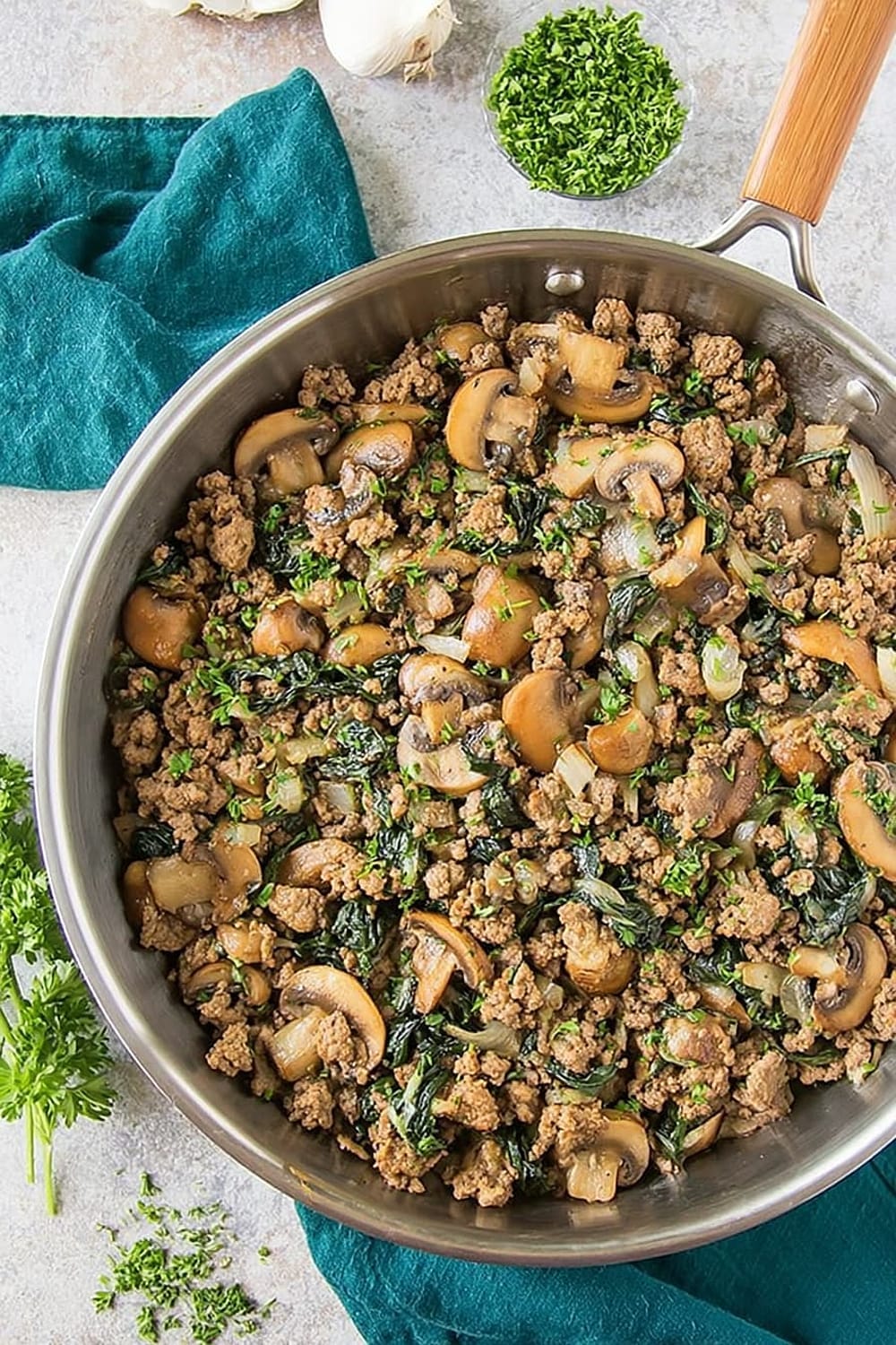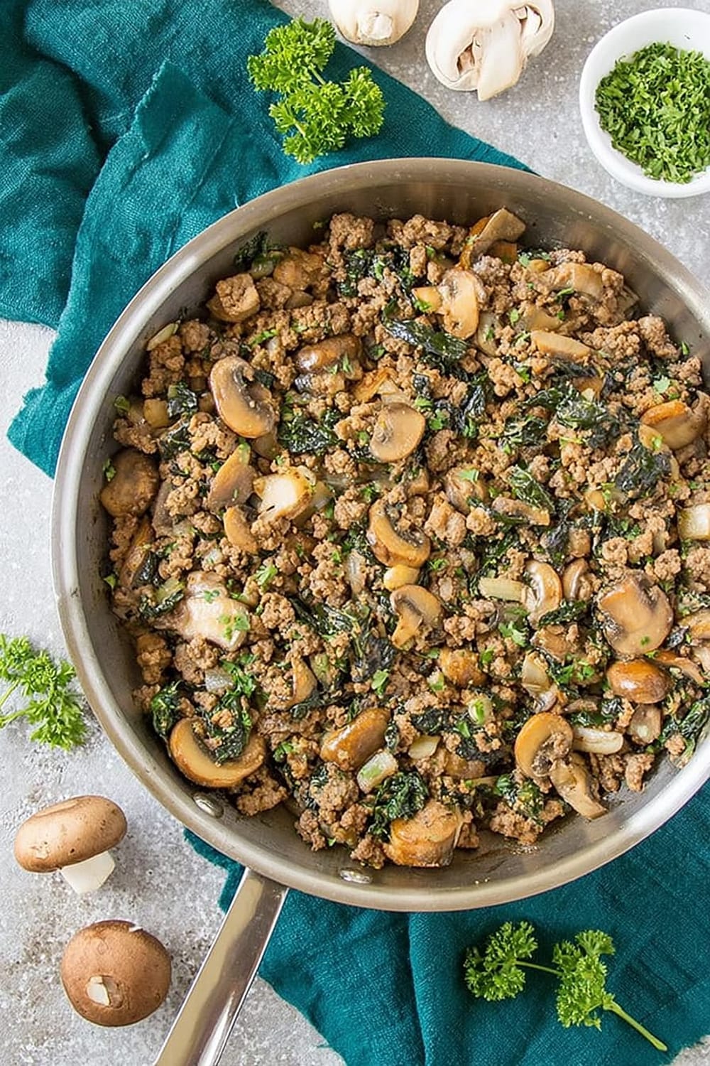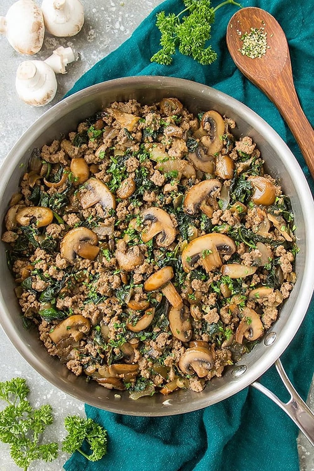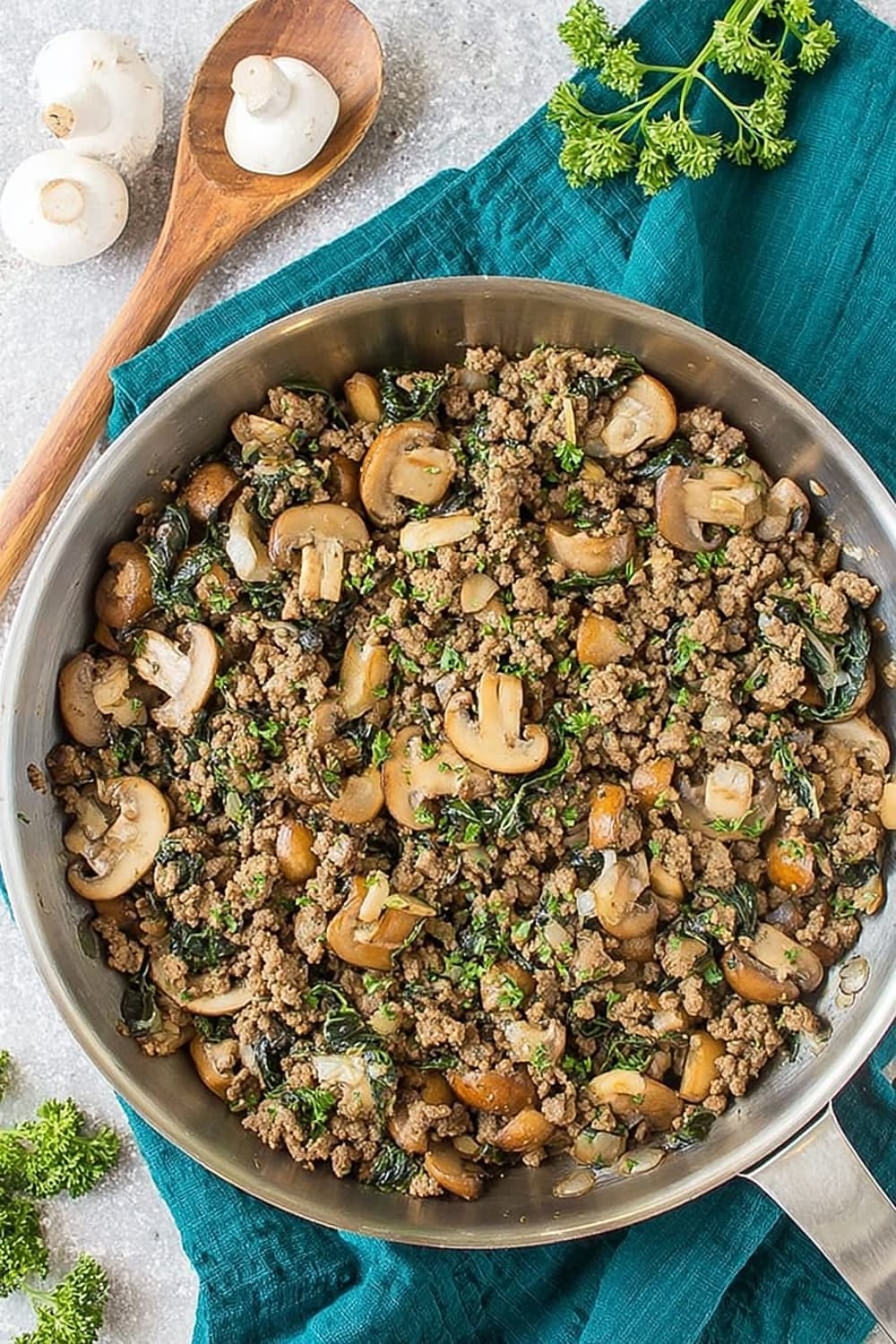 Picture this: savory ground beef mingling with earthy mushrooms while caramelized onions add their sweet magic to the party, all happening in one glorious cast iron skillet.