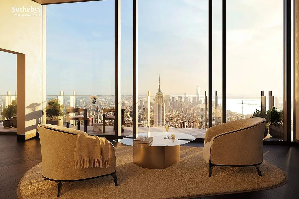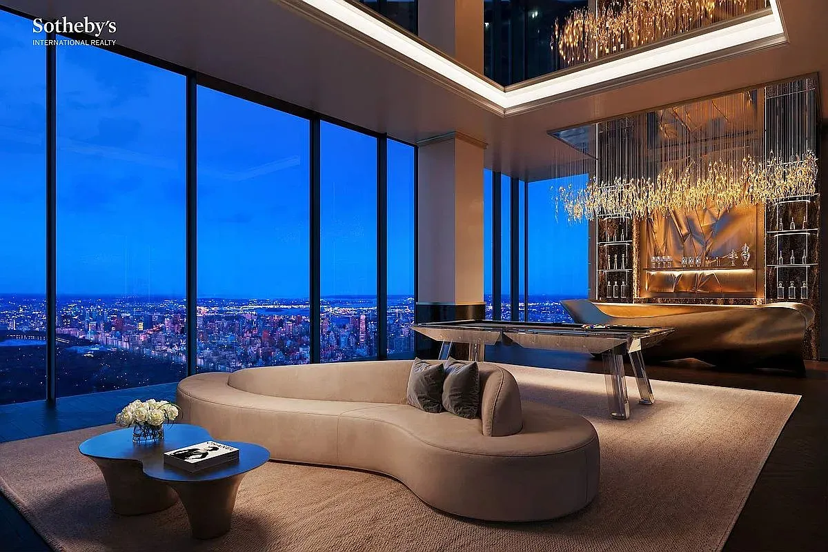 The residence boasts 360-degree views encompassing Central Park, the Manhattan skyline, and both rivers, providing an incredible backdrop to the luxuriously appointed interiors.