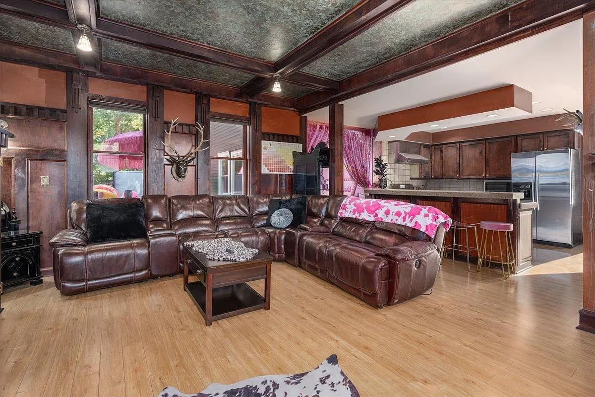 The leather sectional in this cozy living area is perfect for movie nights, and I love how it opens up to the kitchen. Plus, those wooden beams add so much character!