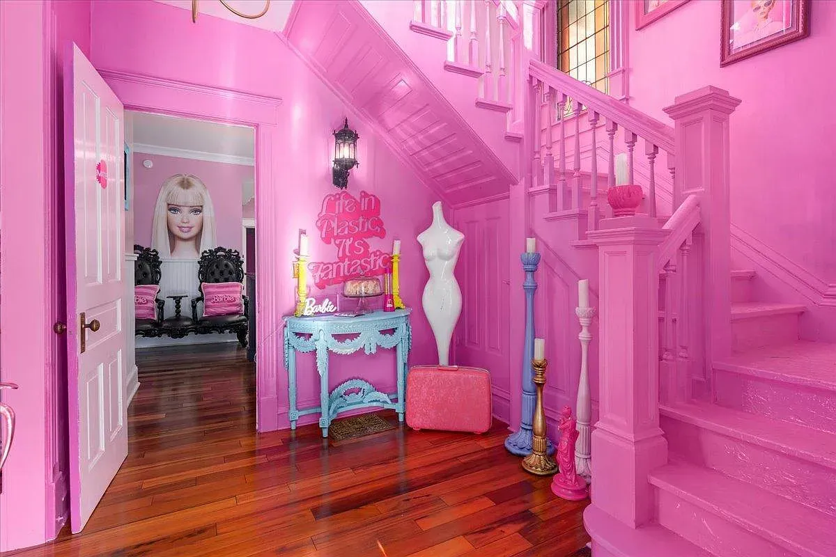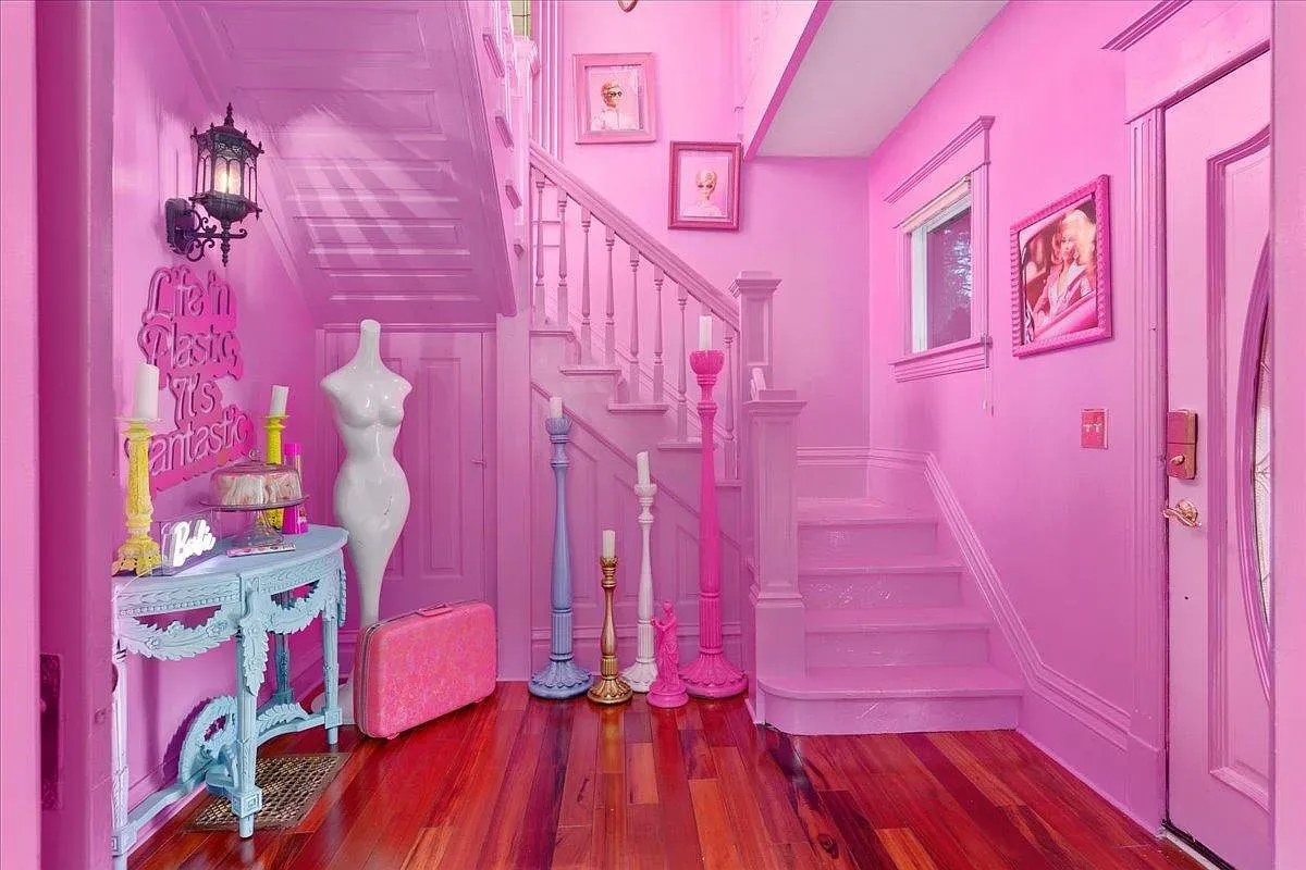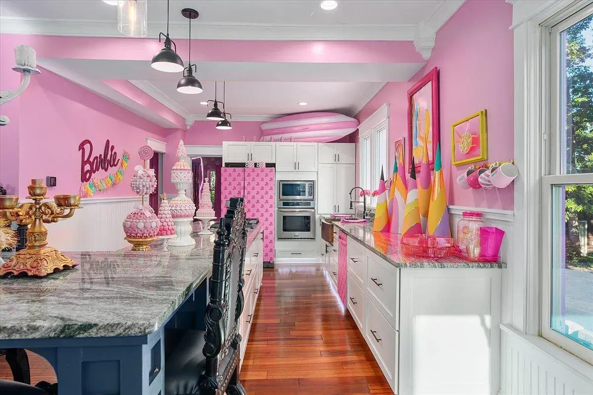 Here’s the kitchen, and it’s definitely a fun pink paradise! The vibrant colors make it feel cheerful and inviting. You’ll notice the quirky Barbie decor on the walls—it really adds a playful touch. Plus, there’s plenty of counter space
