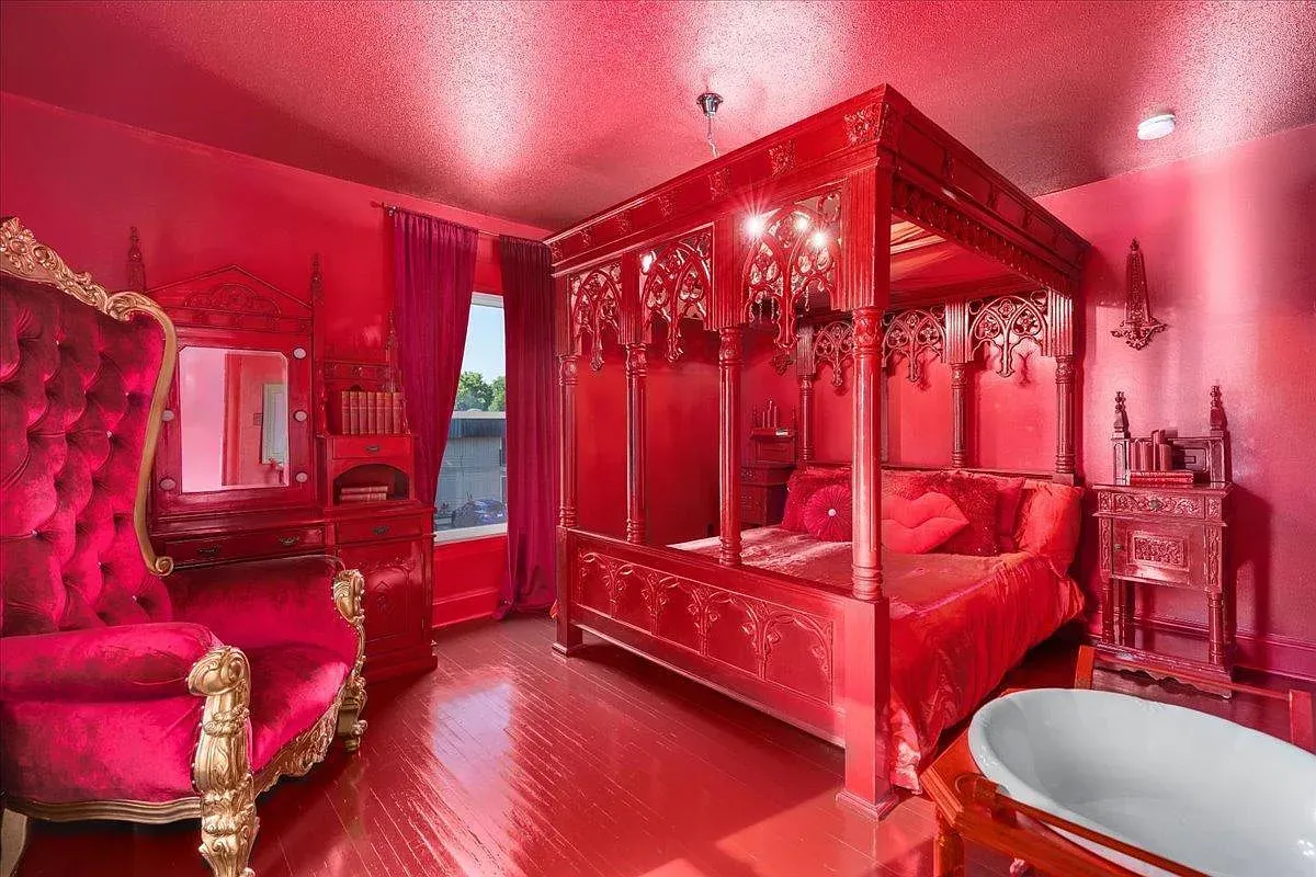 Welcome to this striking red bedroom! The four-poster bed really stands out, doesn’t it? Plus, that vintage chair adds a nice touch. It almost feels like stepping into a fairy tale!