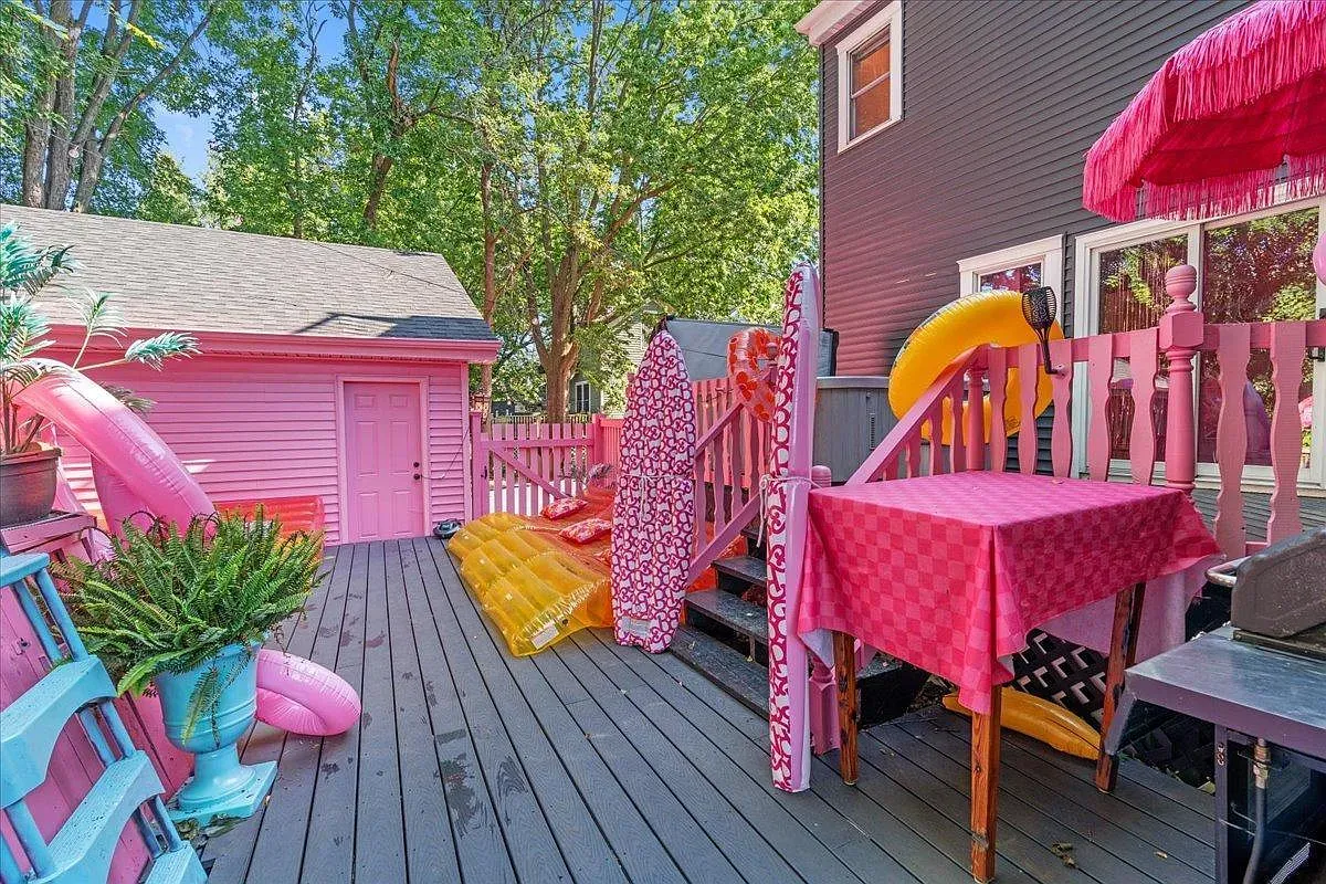 Here’s the backyard setup, and it’s perfect for summer fun! You’ve got tons of colorful floats and a nice spot for lounging. That cheerful pink vibe really makes it feel like a little oasis!