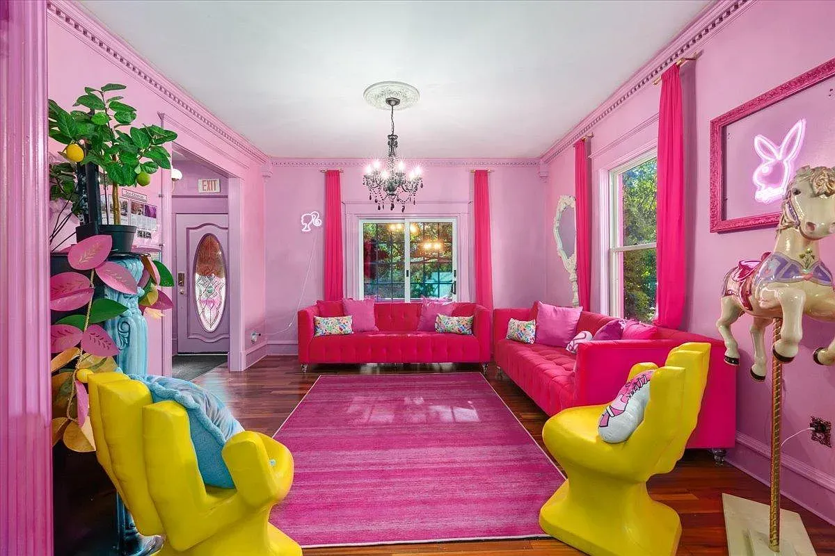 Welcome to the living room! It’s a fun burst of color with that bright pink sofa and playful decor. The quirky art pieces really make it feel lively, and the dining area just off to the side looks perfect for gatherings!