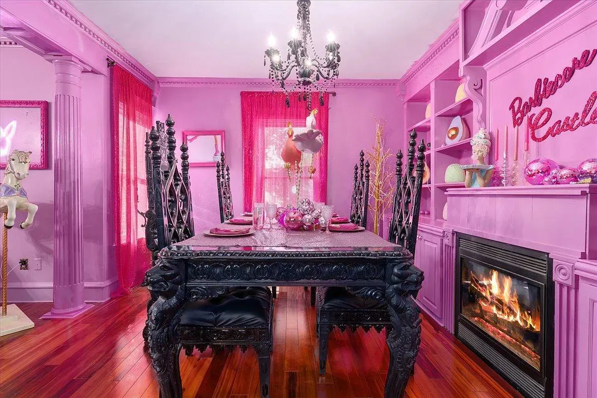 Welcome to the dining room! It’s got this vibrant pink color that really makes it stand out, and just look at that black carved table—it’s such a unique touch. The chandelier adds a nice elegance, and there’s even a cozy little