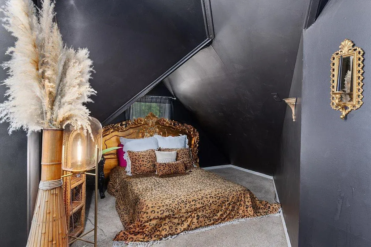 Here’s the craziest bedroom! The bright blue walls really pop and give it such a fun vibe. Plus, that unique ceiling shape adds so much character. And can we talk about that awesome bed? Perfect for anyone who loves a playful