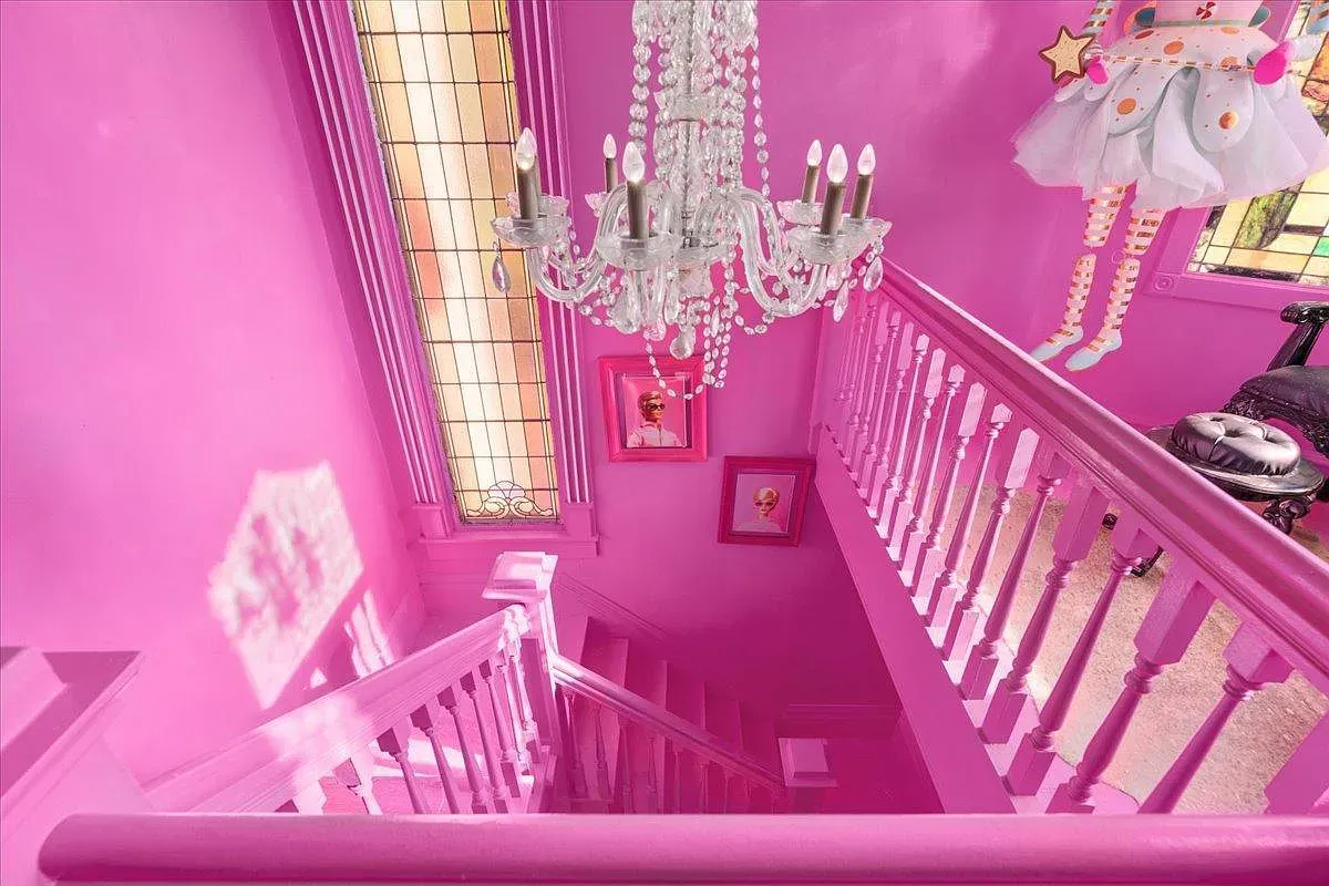 The second level comprises four bedrooms, while the third level hosts three additional bedrooms, including a dedicated movie room for cinematic enjoyment. Further enhancing the property’s appeal are the two striking pink staircases that add a distinctive character.