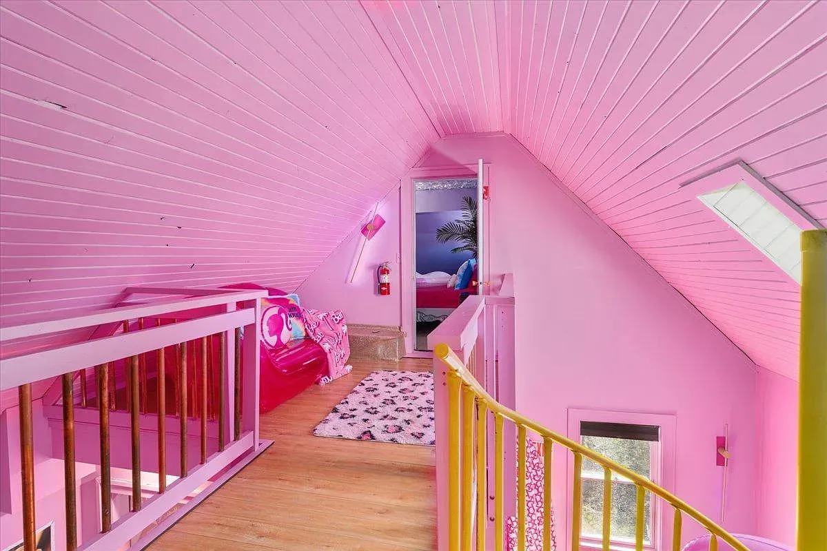 Welcome to the playful loft area! The vibrant pink walls really give it a fun vibe, and there’s enough space to hang out or let your creativity shine. Plus, the spiral staircase adds a great touch!