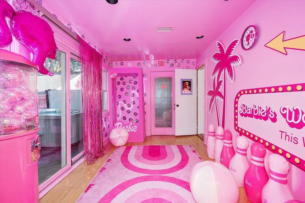 Welcome to this fun and quirky room! It’s all decked out in pink and has a real playful vibe with those bowling pins and the cute gumball machine. You can just feel the energy in here!