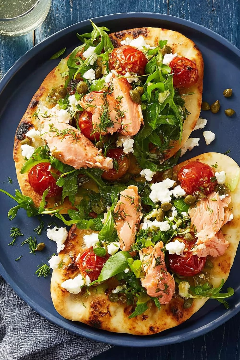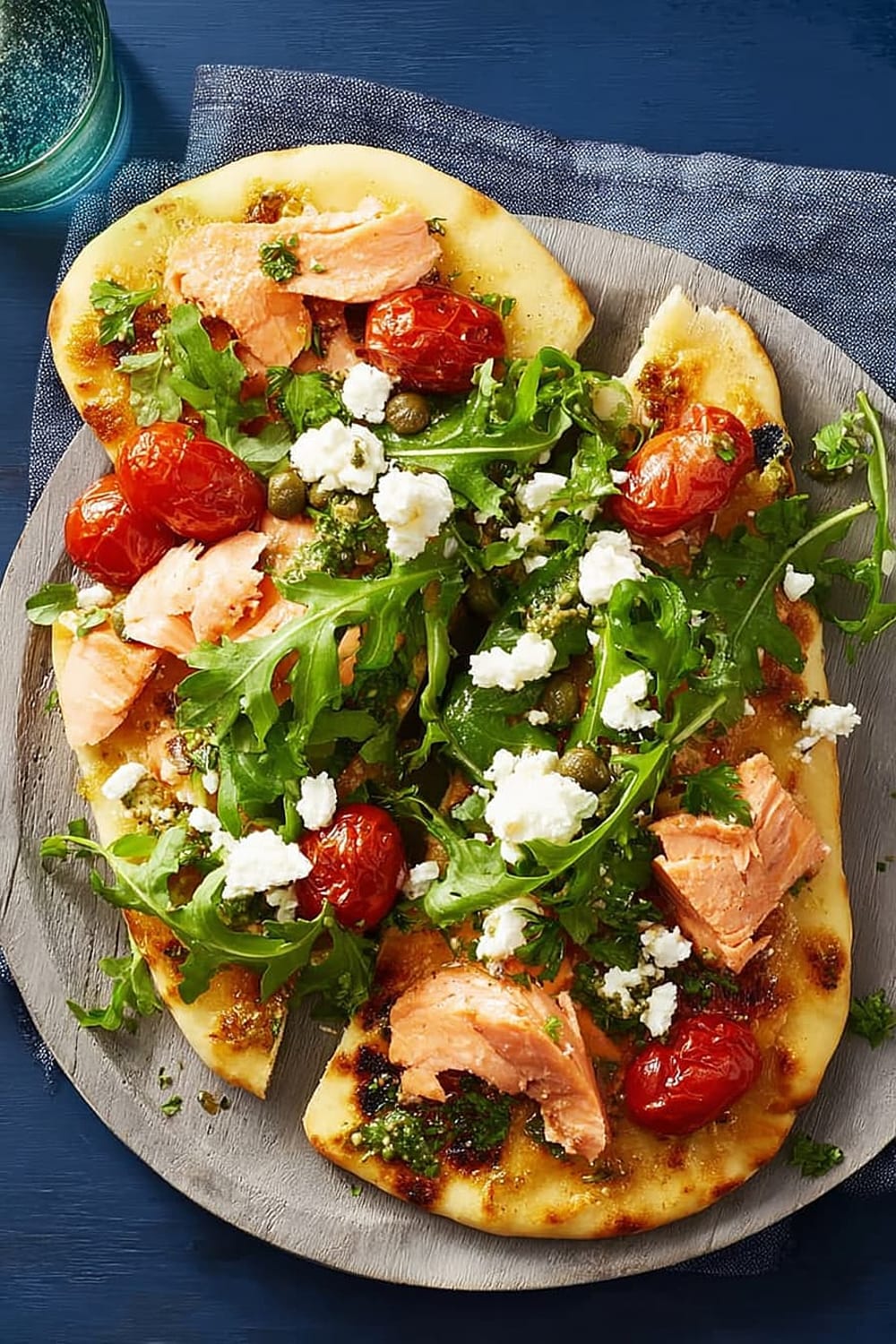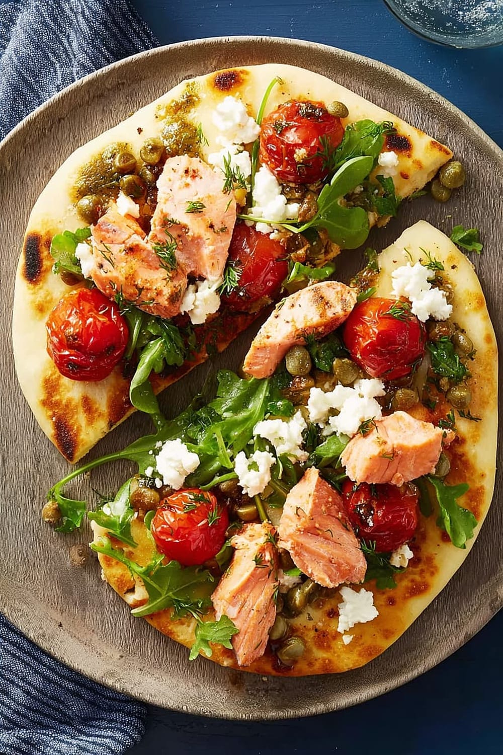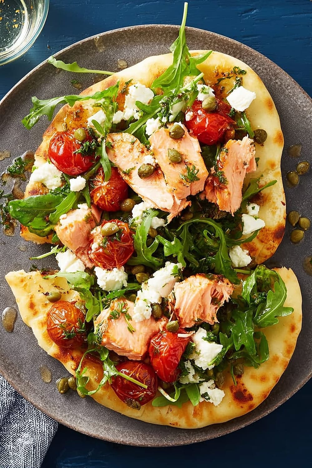 Picture this: flaky salmon that practically melts in your mouth, paired with burst cherry tomatoes that taste like little flavor bombs, all piled high on warm, pillowy flatbread.