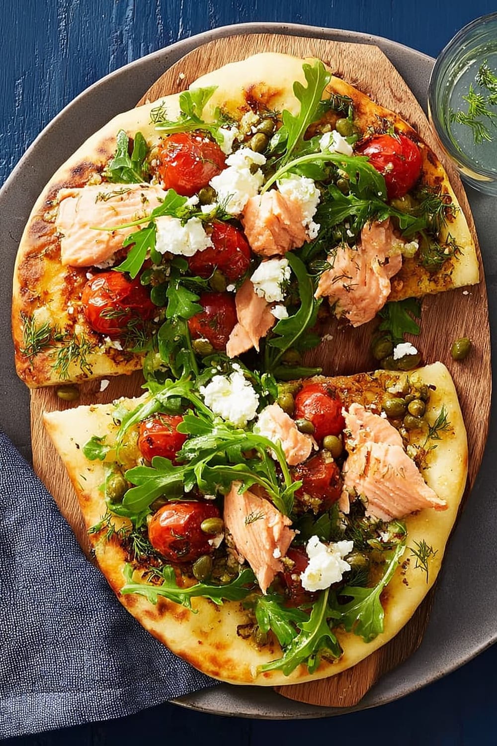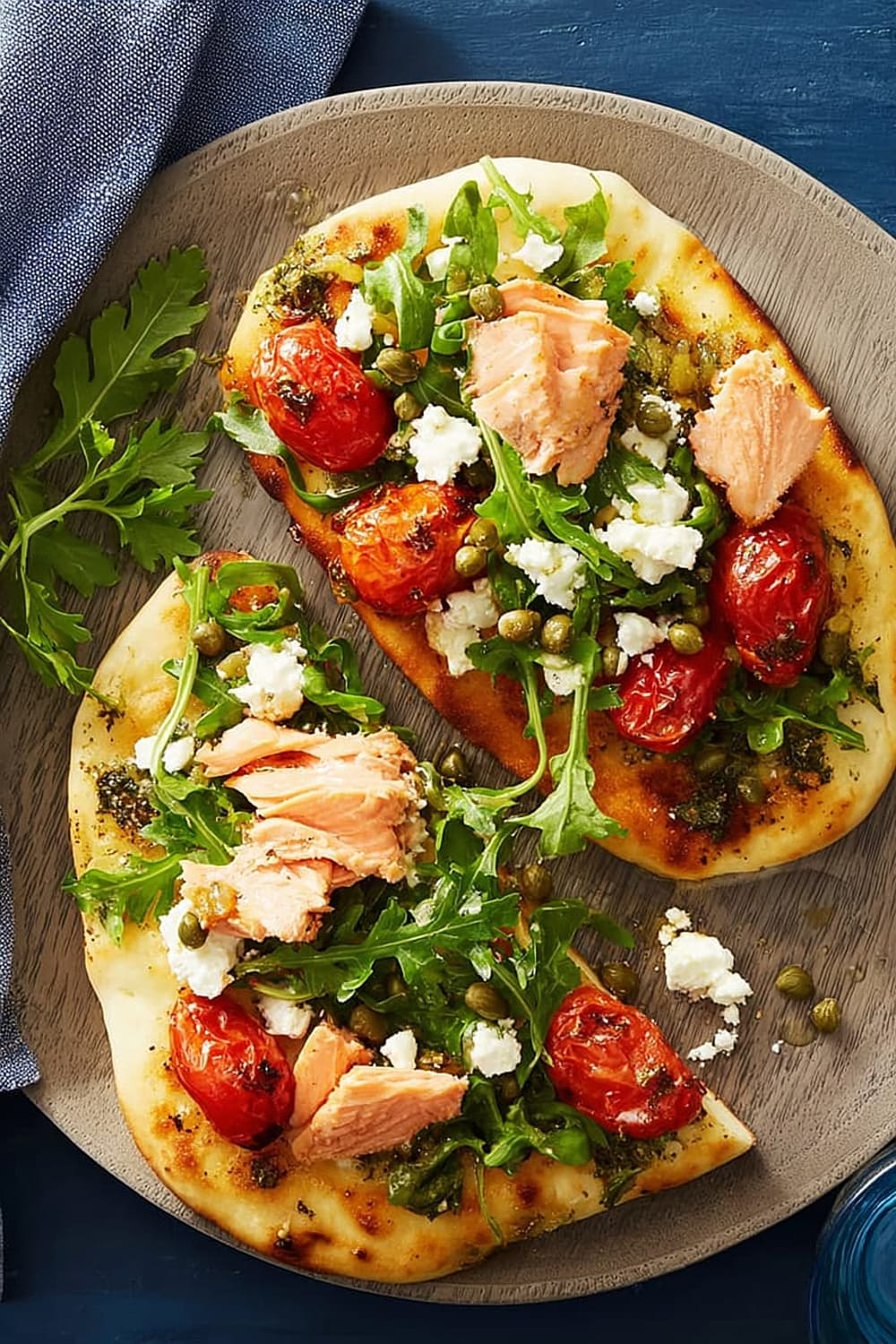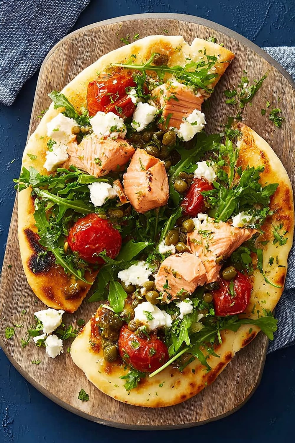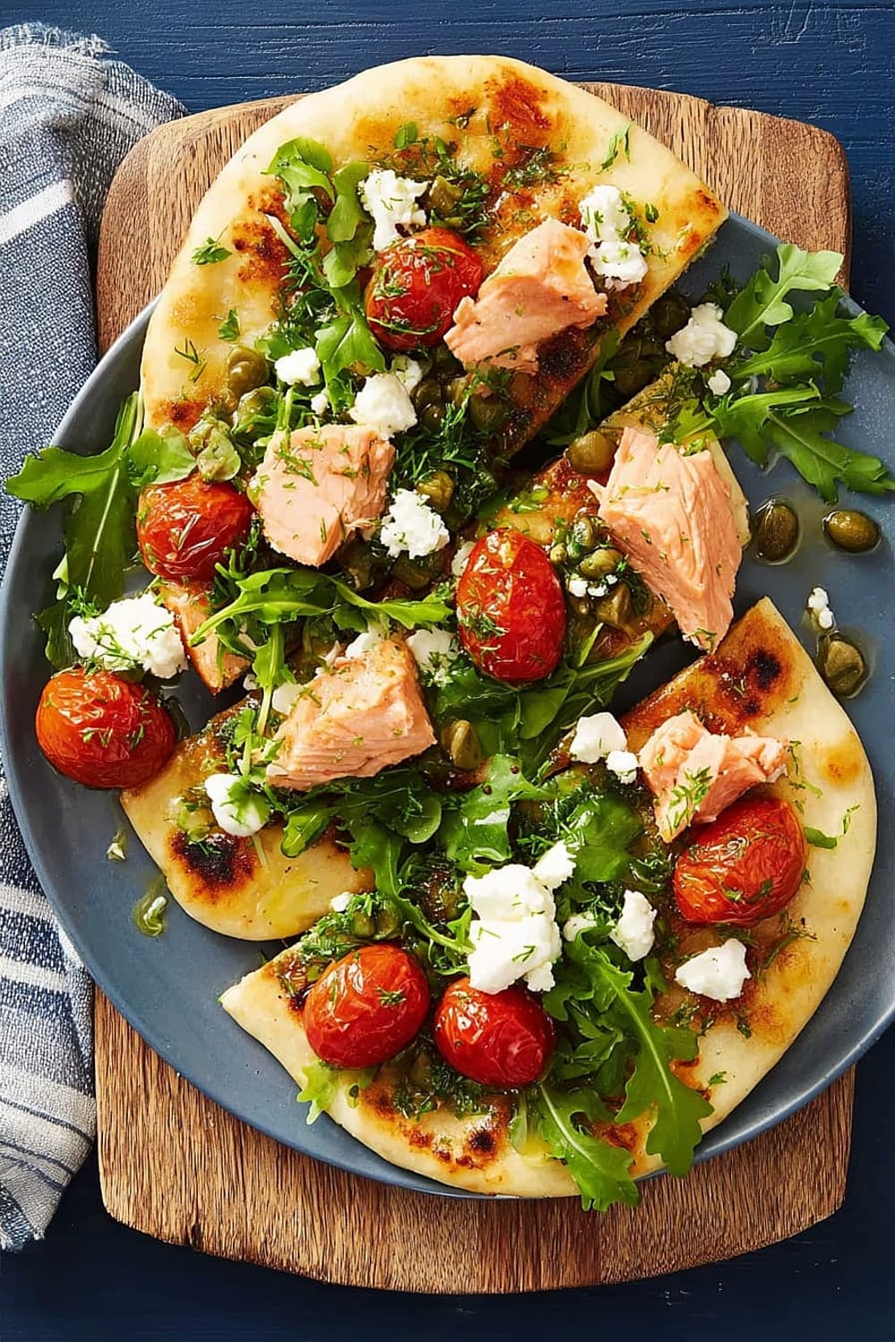 Picture this: flaky salmon that practically melts in your mouth, paired with burst cherry tomatoes that taste like little flavor bombs, all piled high on warm, pillowy flatbread.