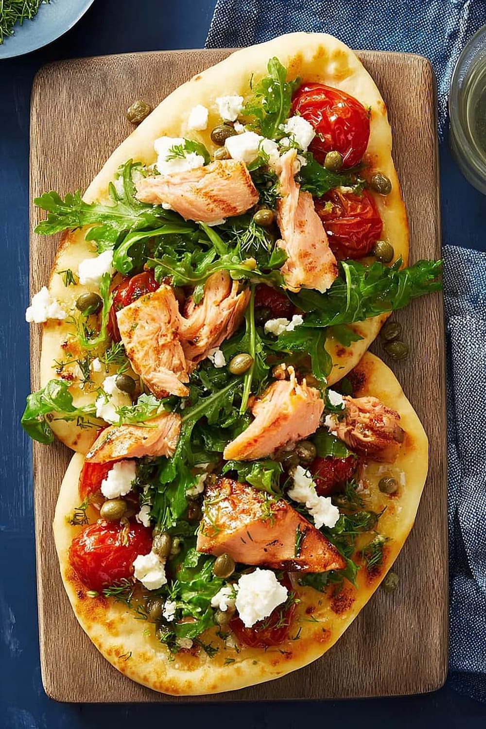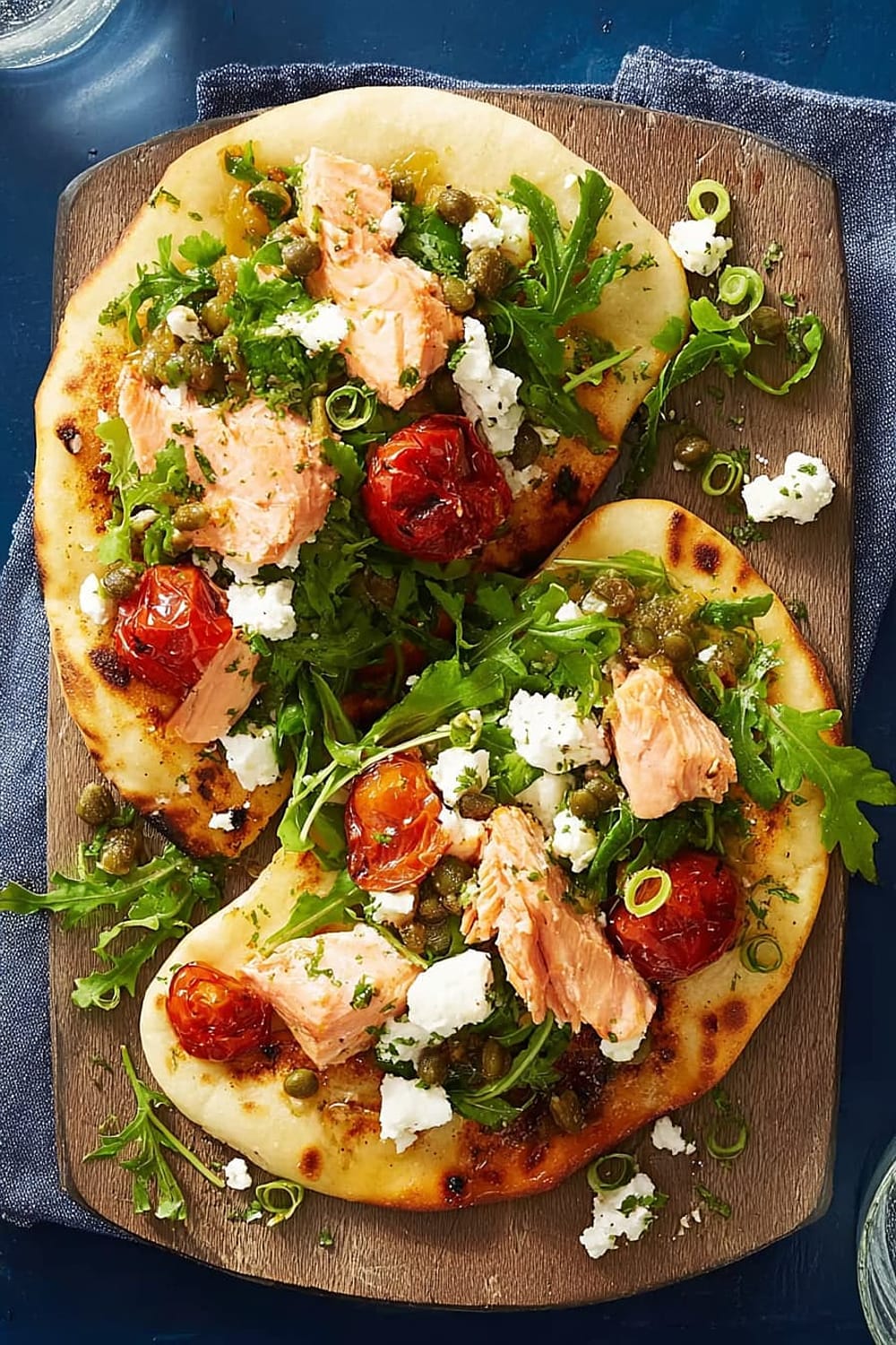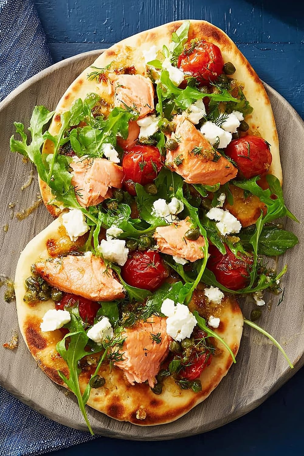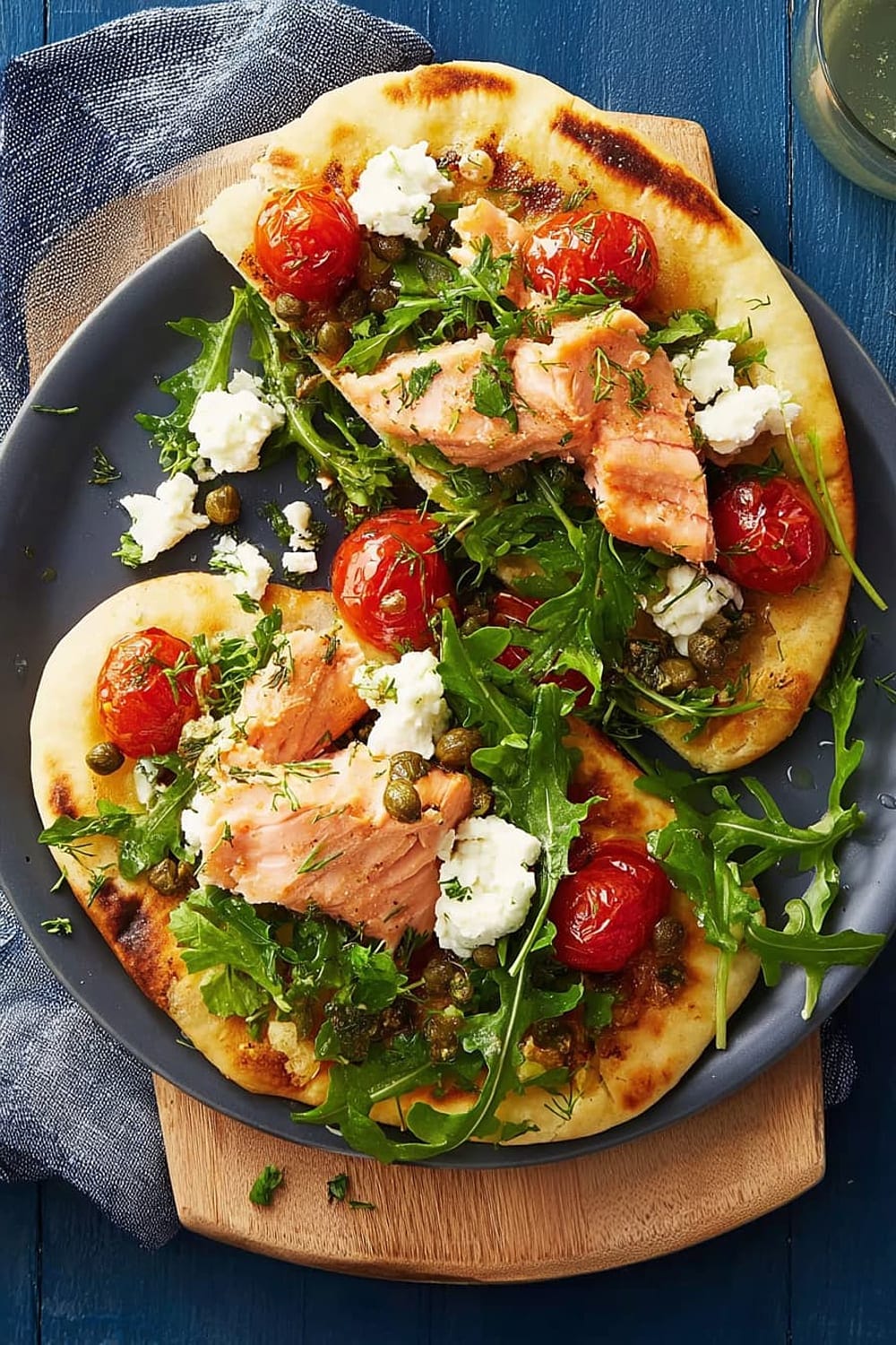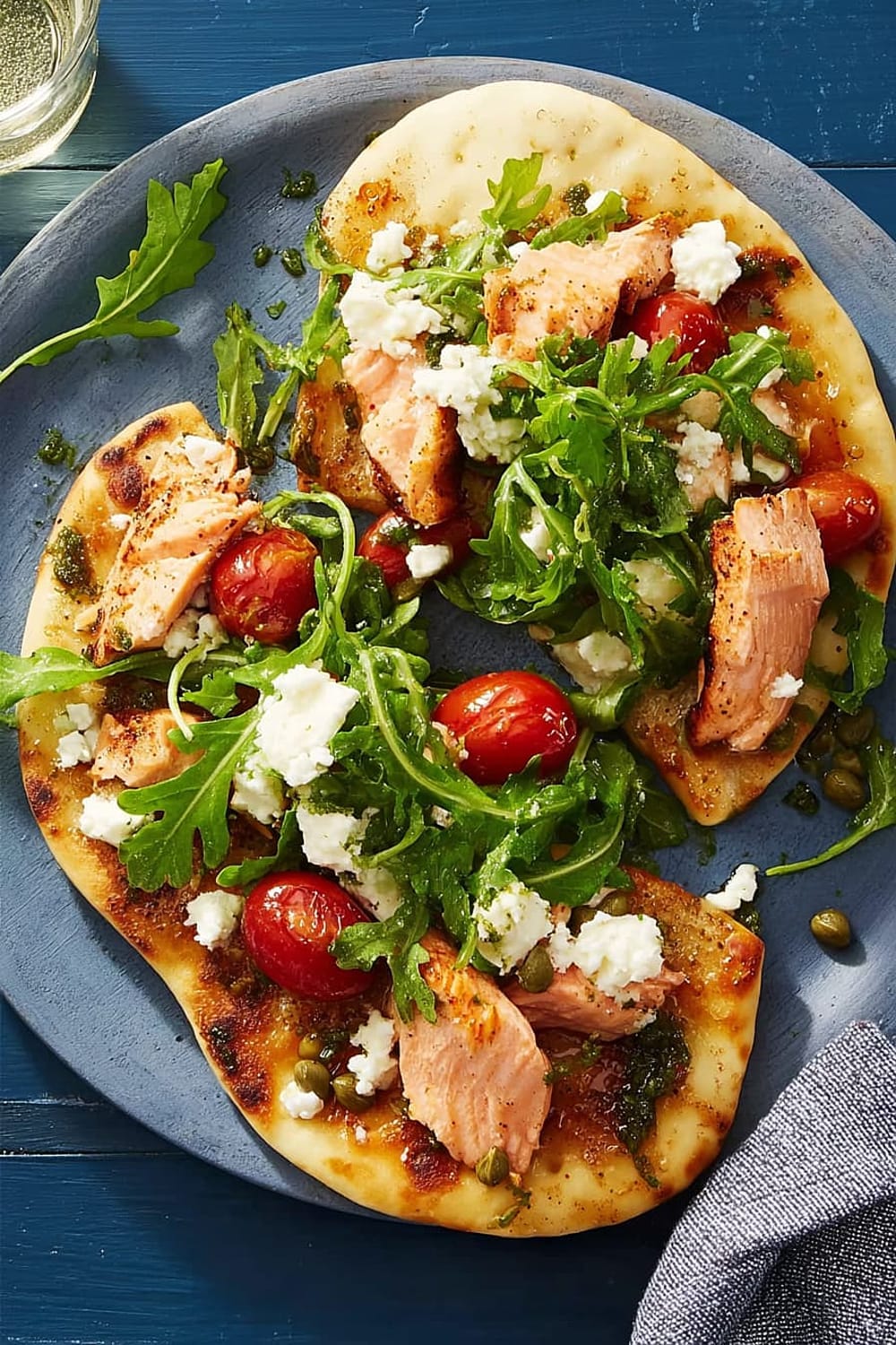 - 6 Spread a generous layer of labneh or Greek yogurt on each warmed flatbread, creating a creamy base. Top with the perfectly cooked salmon pieces and fresh arugula, then spoon the warm tomato mixture over everything. Finish with sliced scallions and crumbled feta if desired.