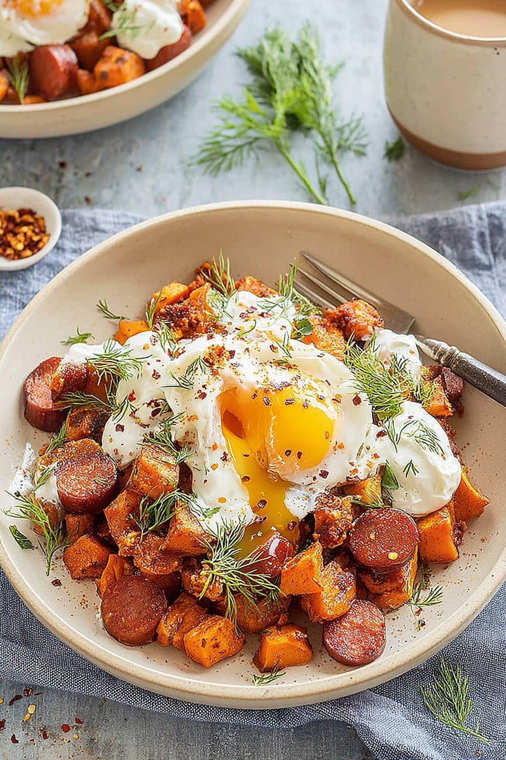 - 7 Transfer the hot sweet potato and chorizo hash to serving plates. Drizzle generously with the seasoned Greek yogurt, then top with the aromatic garlic chili butter. Finish with a generous sprinkle of fresh dill for a pop of color and herbaceous freshness.