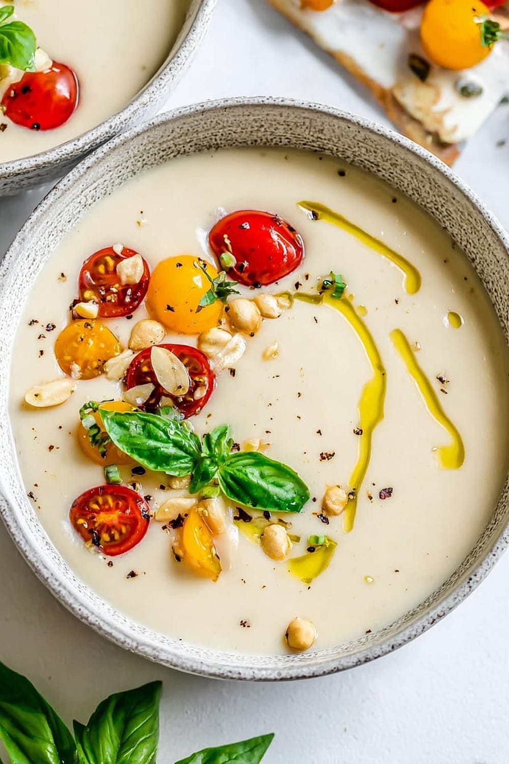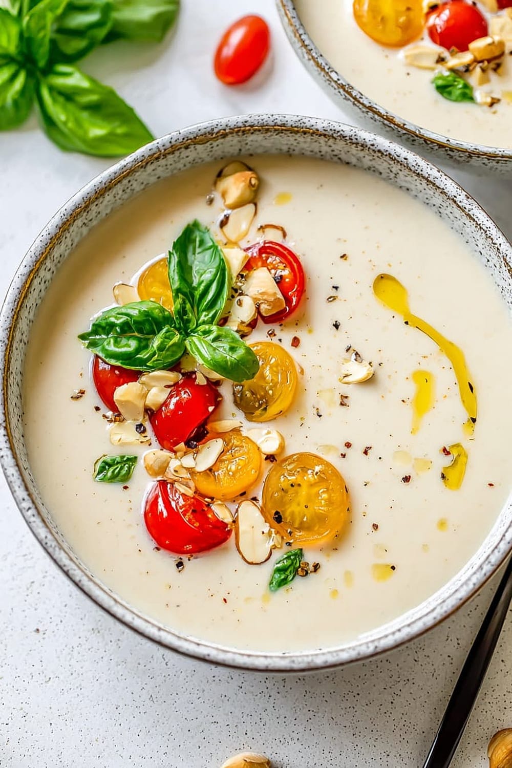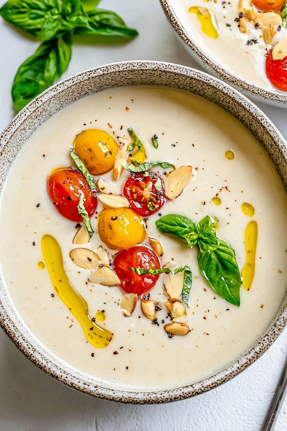 - 7 Pour the chilled ajo blanco into bowls and garnish with halved green grapes (traditional), grape tomatoes, or sliced fresh figs. Drizzle with additional extra-virgin olive oil and finish with a sprinkle of freshly cracked black pepper.