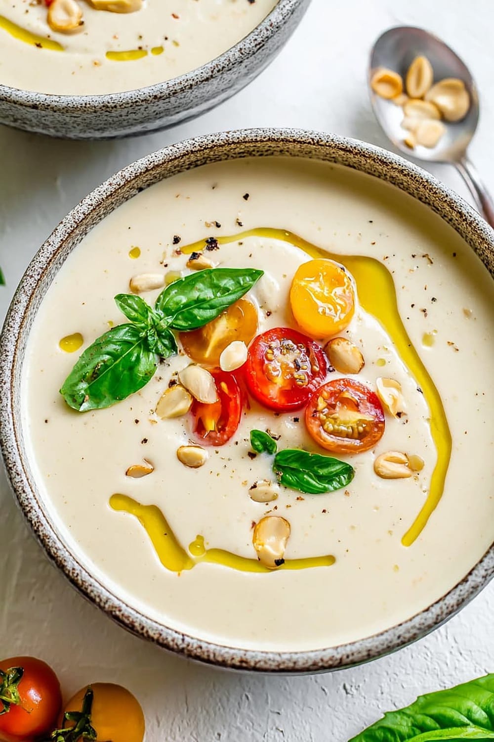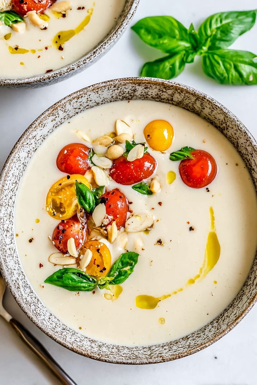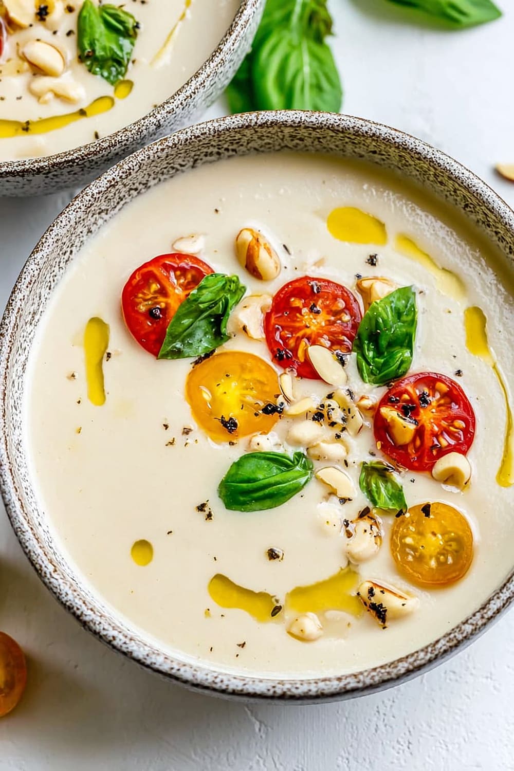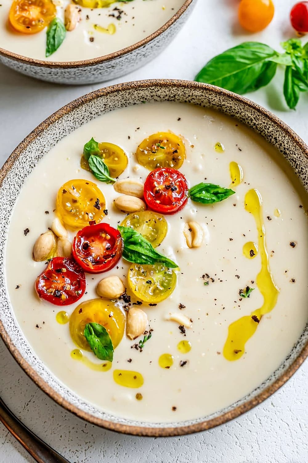 - 7 Pour the chilled ajo blanco into bowls and garnish with halved green grapes (traditional), grape tomatoes, or sliced fresh figs. Drizzle with additional extra-virgin olive oil and finish with a sprinkle of freshly cracked black pepper.