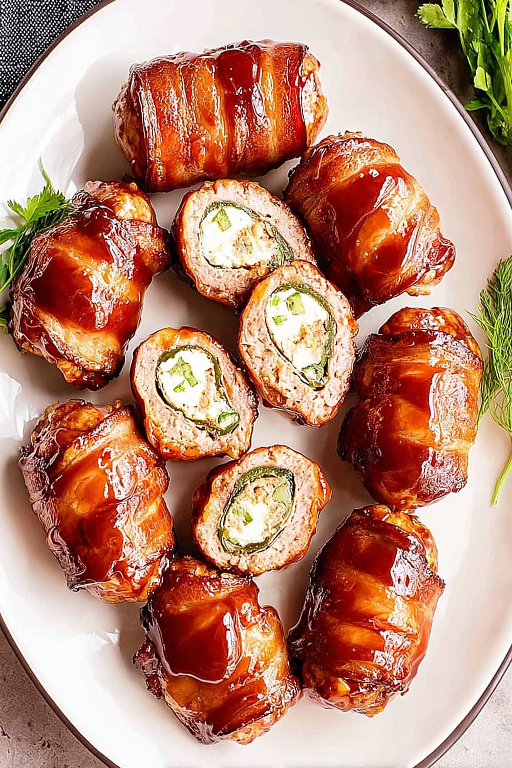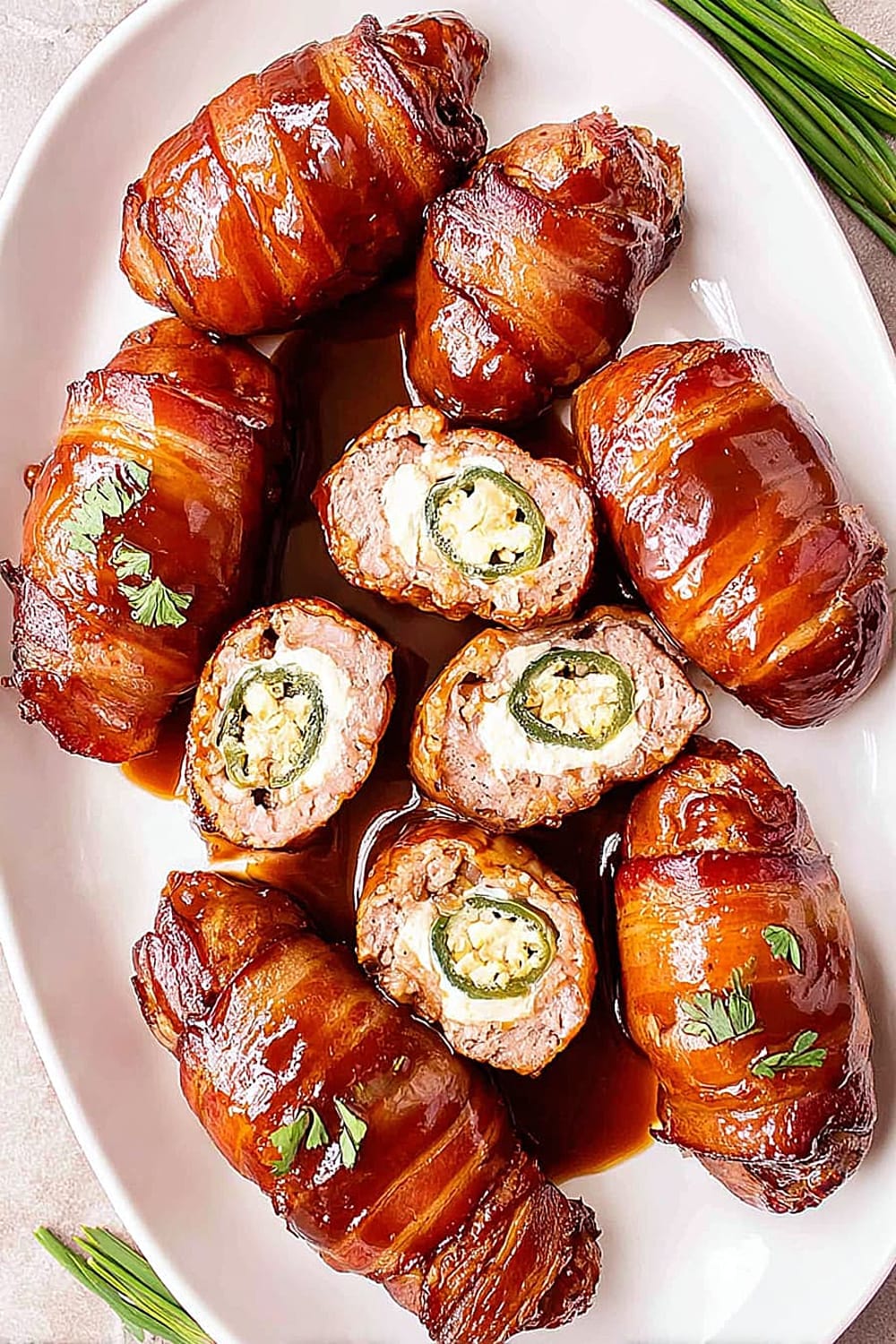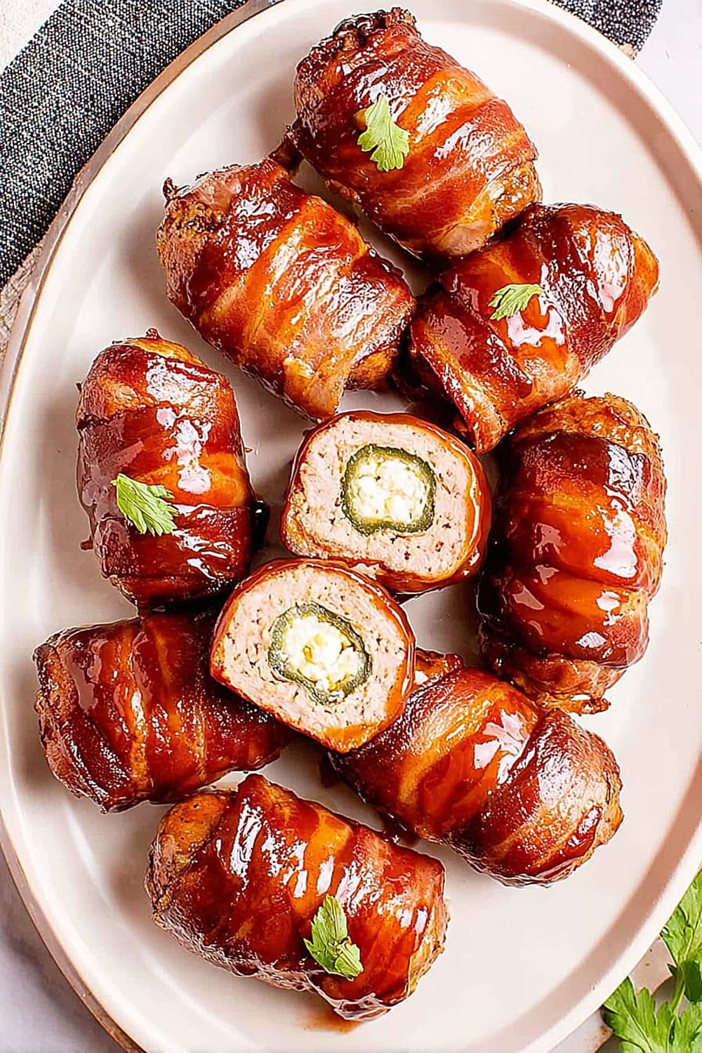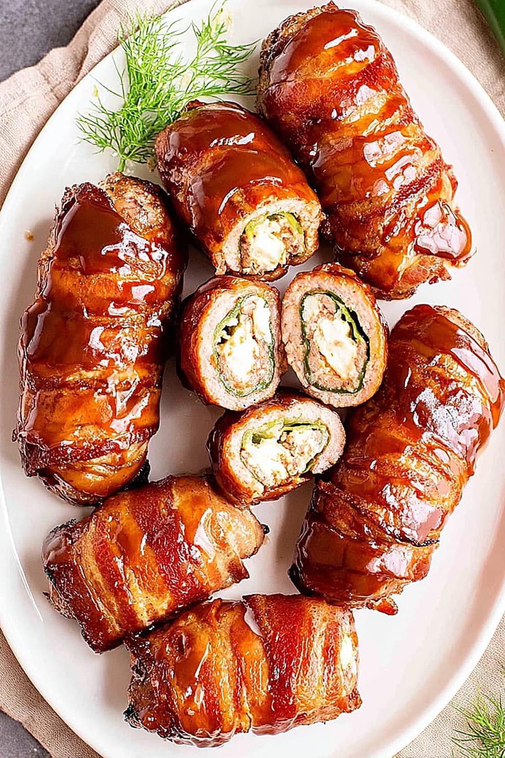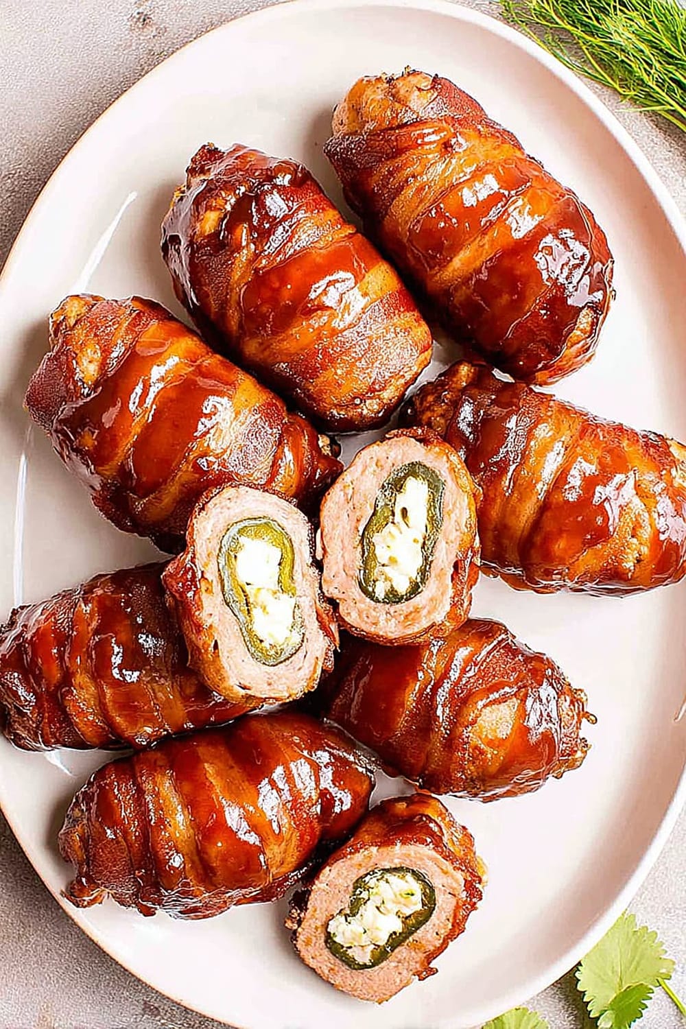 Picture this: creamy, spiced cheese filling nestled inside a perfectly hollowed jalapeño, wrapped in savory pork sausage, then hugged by crispy bacon and finished with a glossy barbecue glaze.