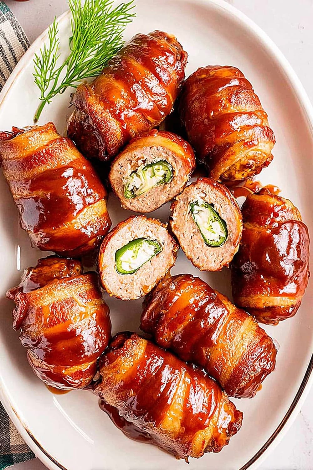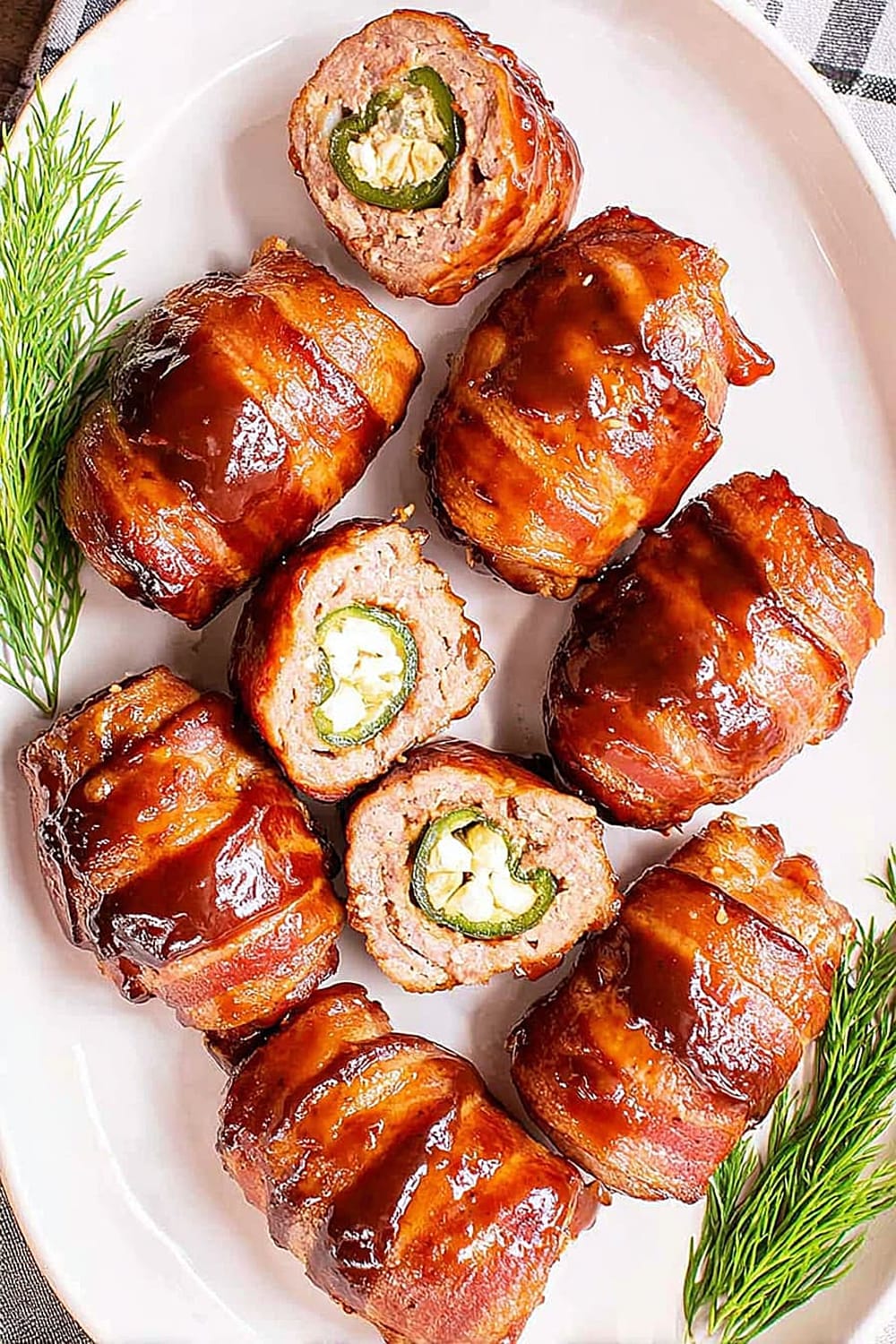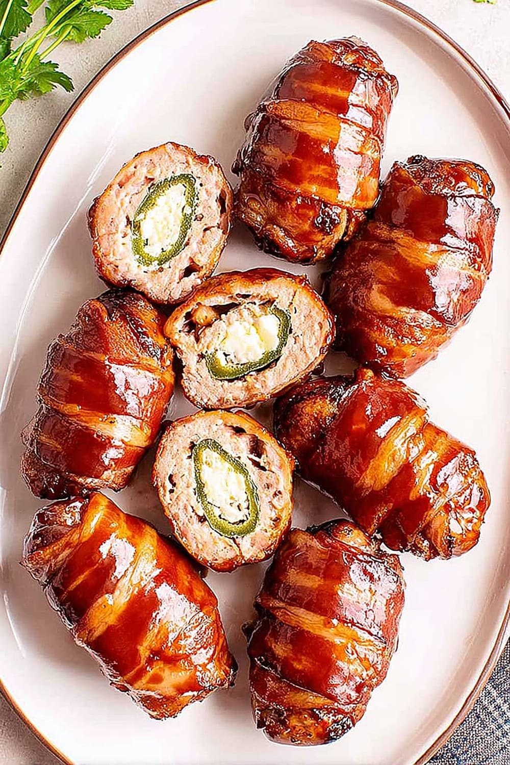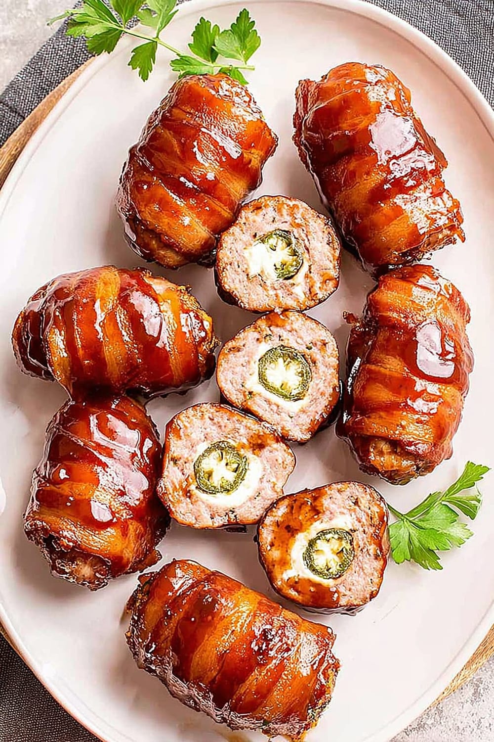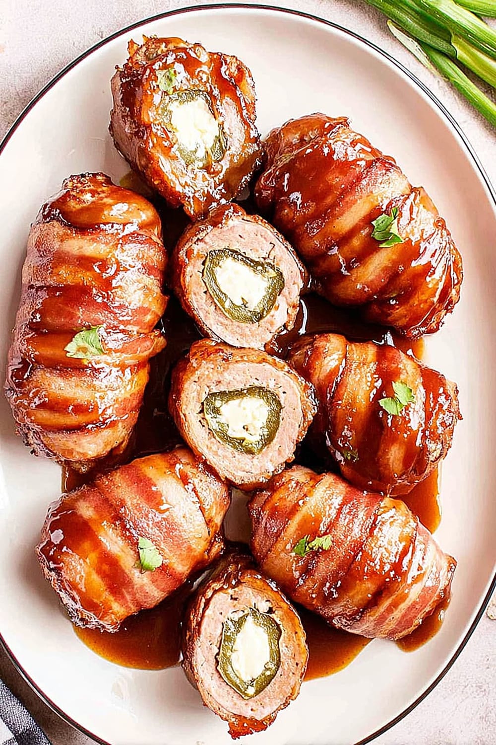 Picture this: creamy, spiced cheese filling nestled inside a perfectly hollowed jalapeño, wrapped in savory pork sausage, then hugged by crispy bacon and finished with a glossy barbecue glaze.
