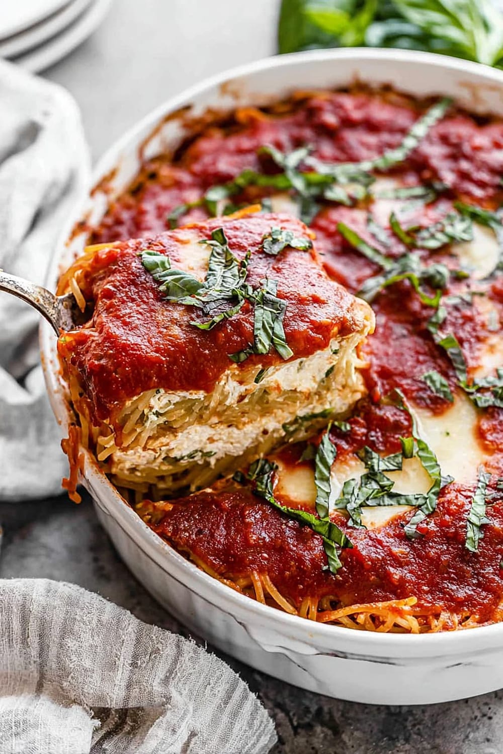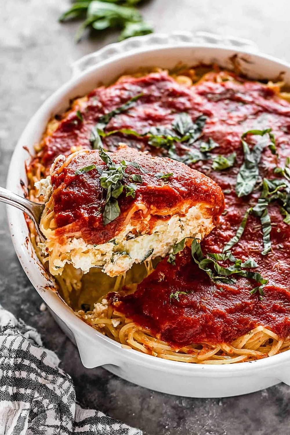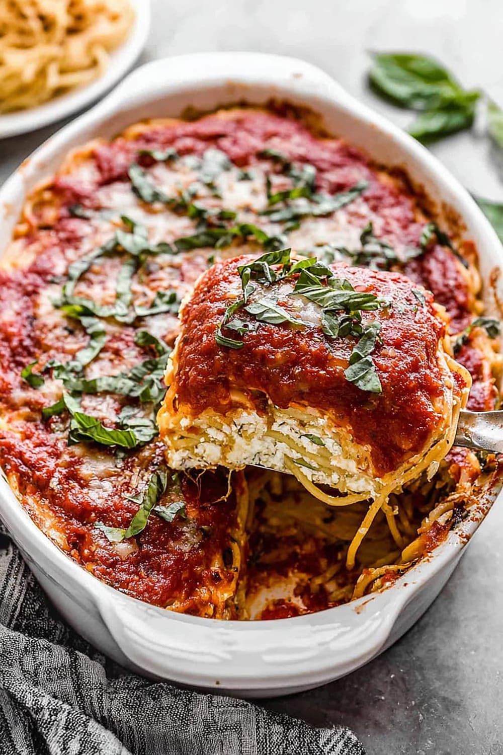 Picture this: tender spaghetti noodles mixed with buttery parmesan and fresh basil, forming a golden crust that gives way to creamy cottage cheese and rich marinara sauce.