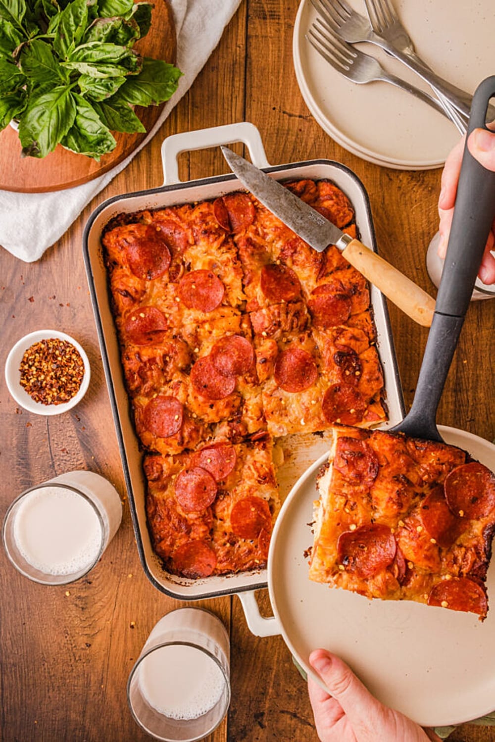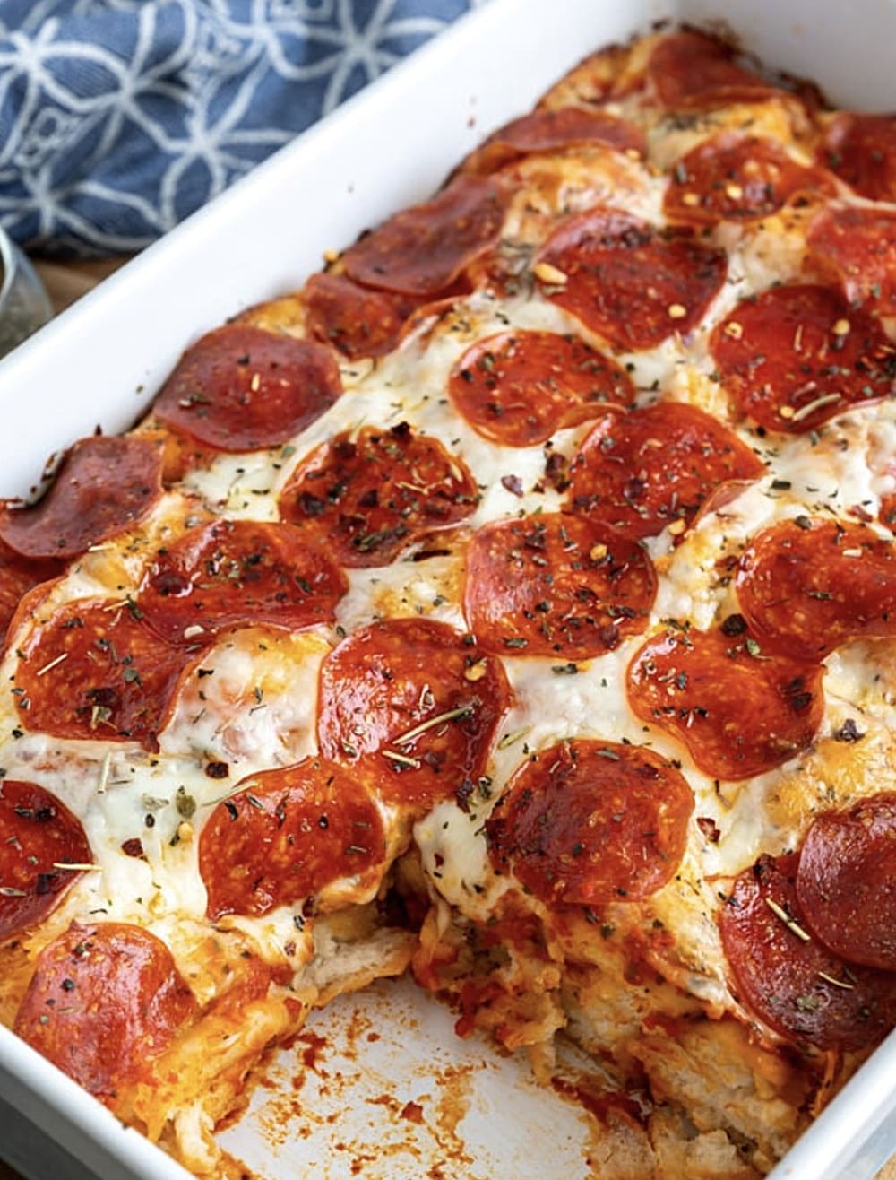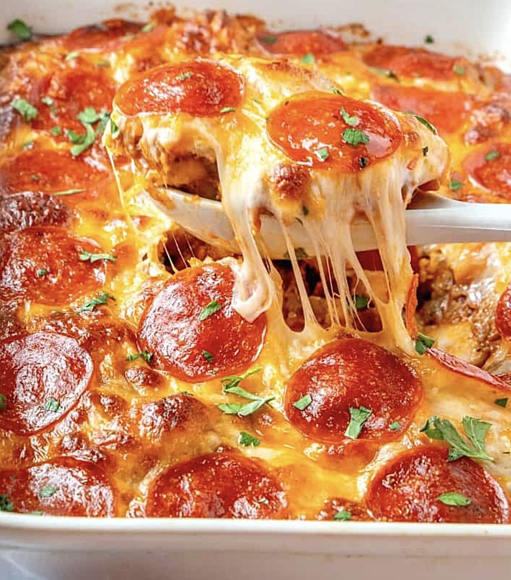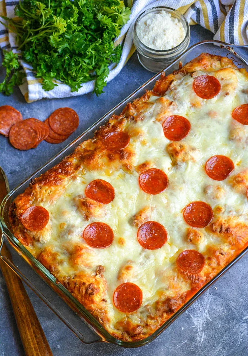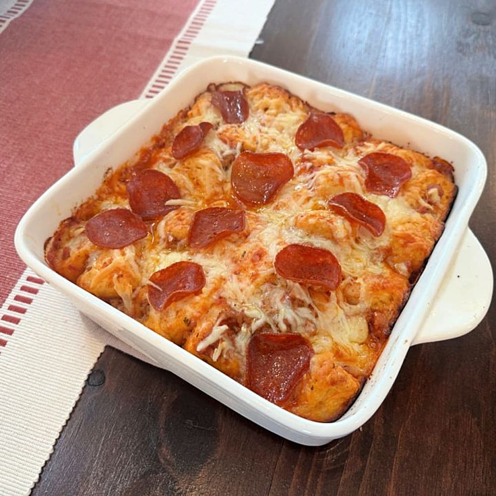 Picture tender, fluffy biscuit pieces swimming in rich pizza sauce, loaded with gooey melted mozzarella cheese and your favorite toppings, all baked together until bubbly and golden.