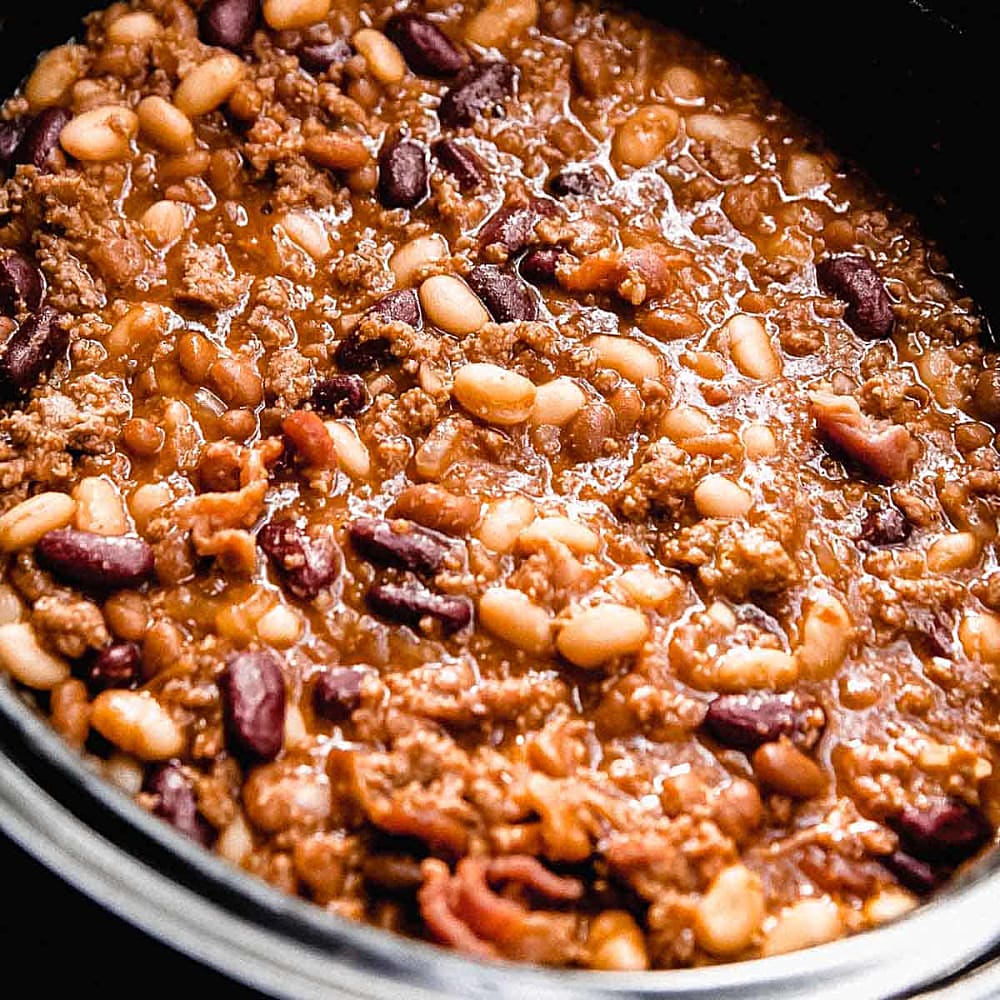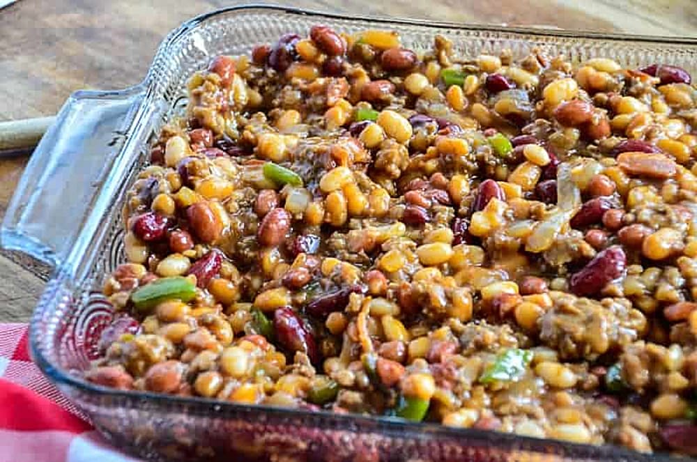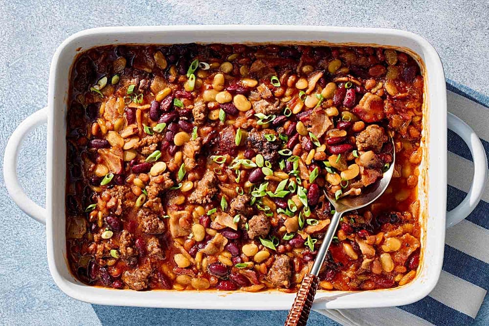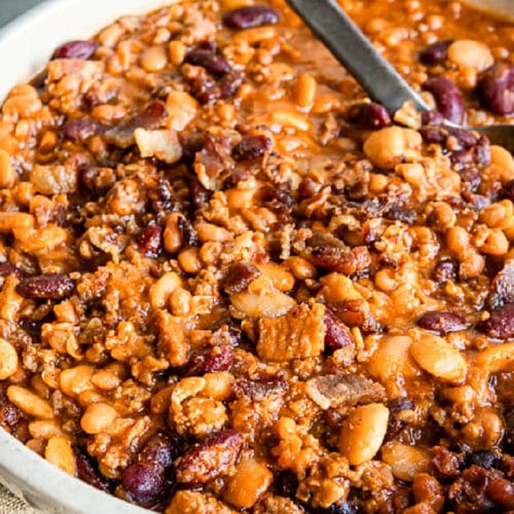 This hearty calico bean casserole combines three different beans with savory ground beef and crispy bacon in a sweet-tangy sauce that’s pure comfort food magic.
