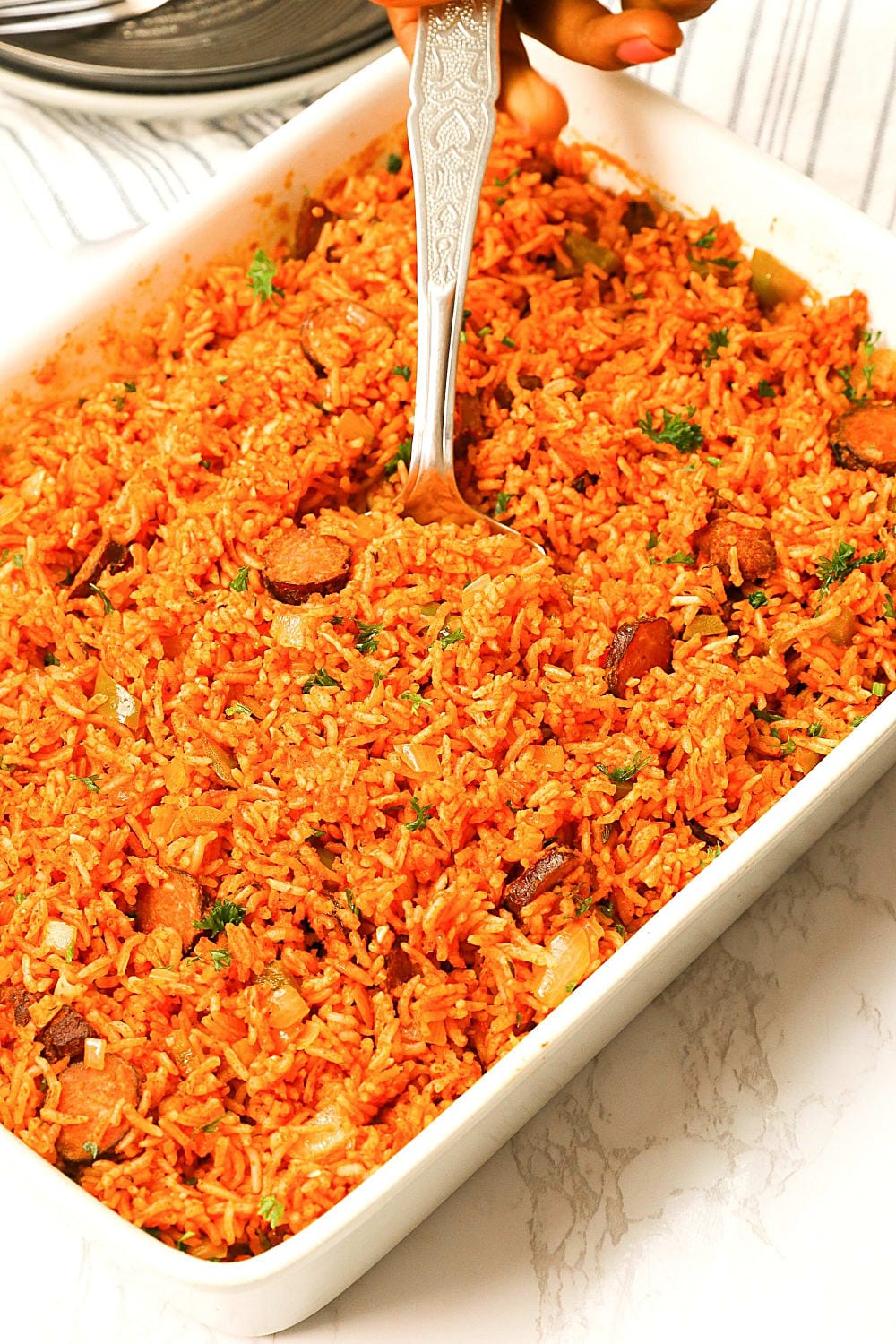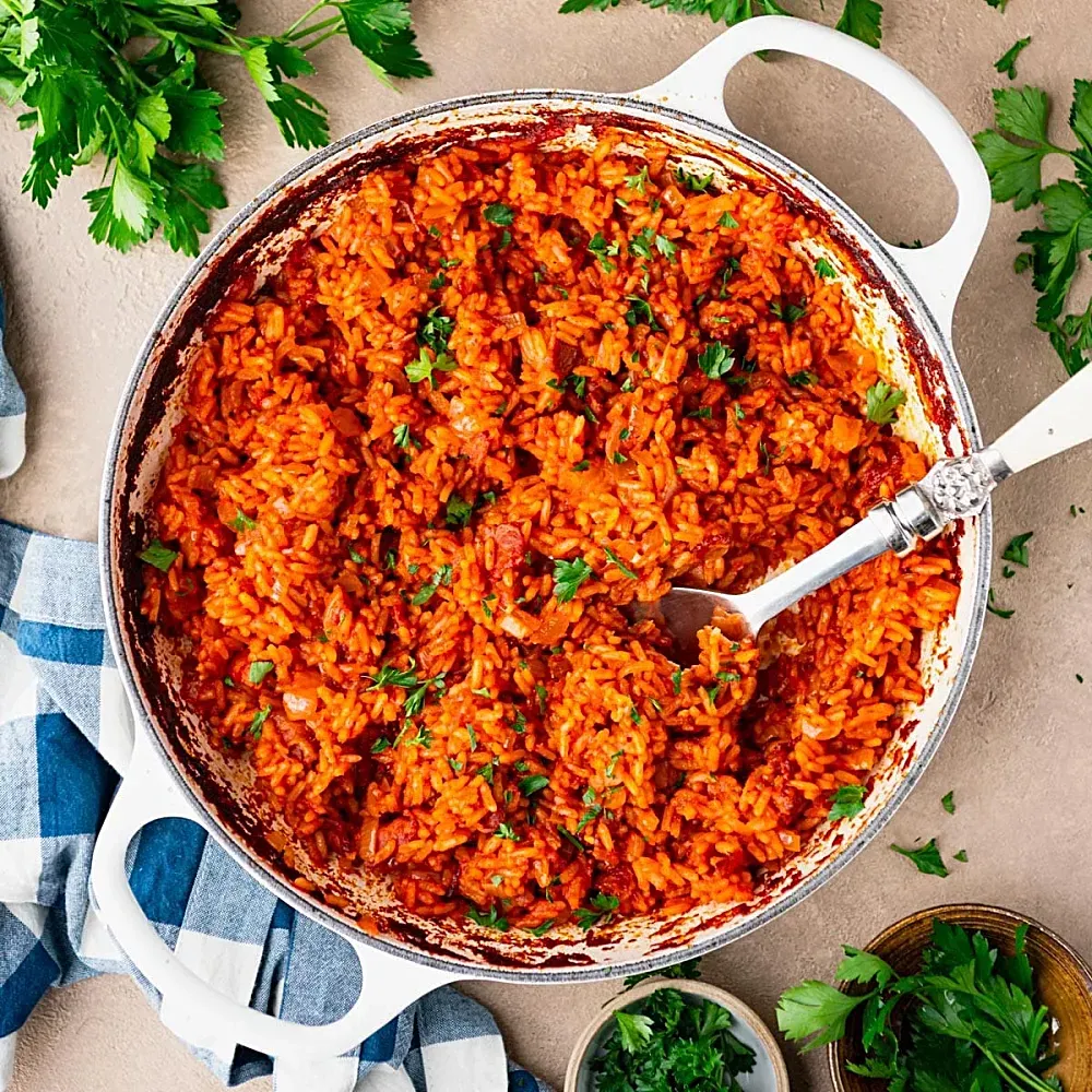 - Cover the dish tightly with aluminum foil and bake for 45 minutes. The rice should be tender and the flavors fully integrated. Let rest for 5 minutes before serving to allow the moisture to redistribute.
