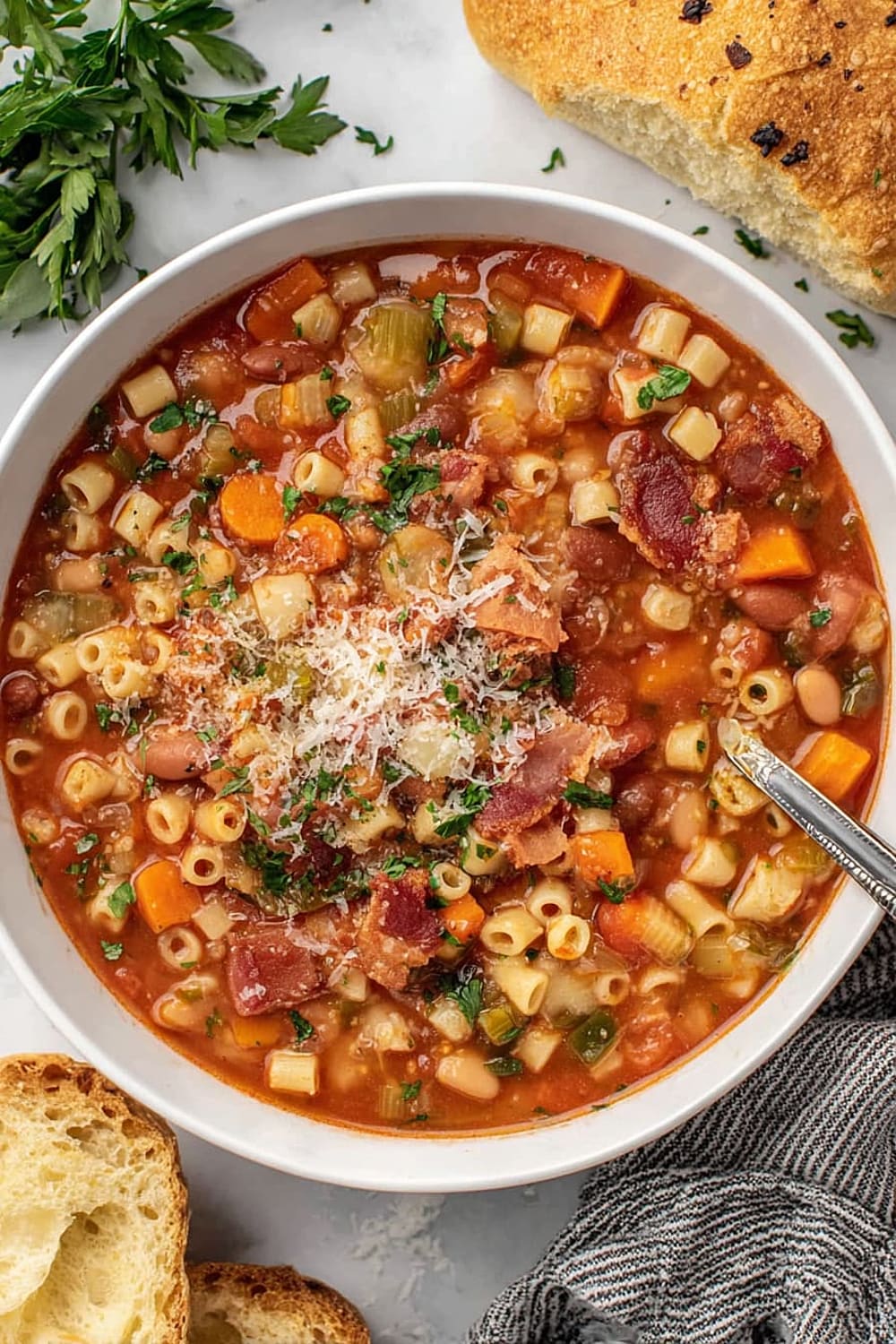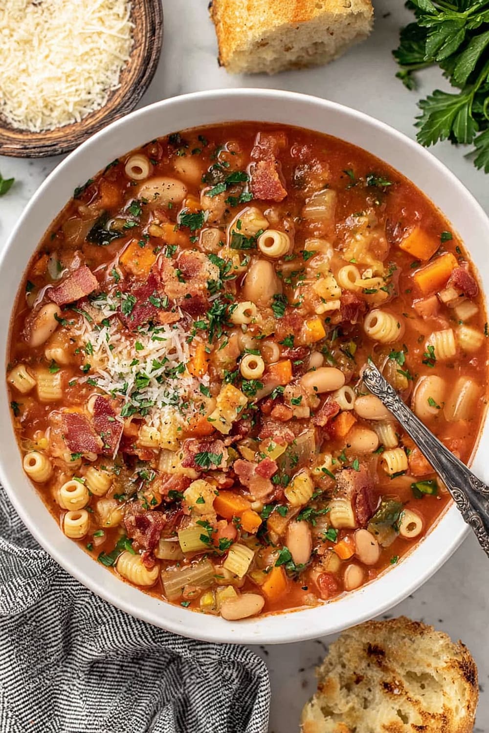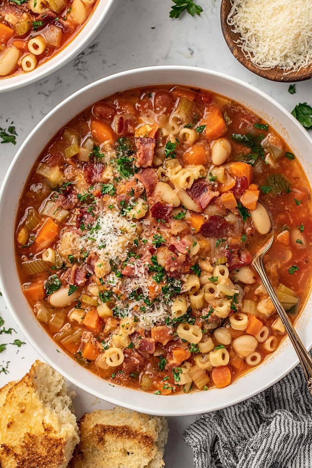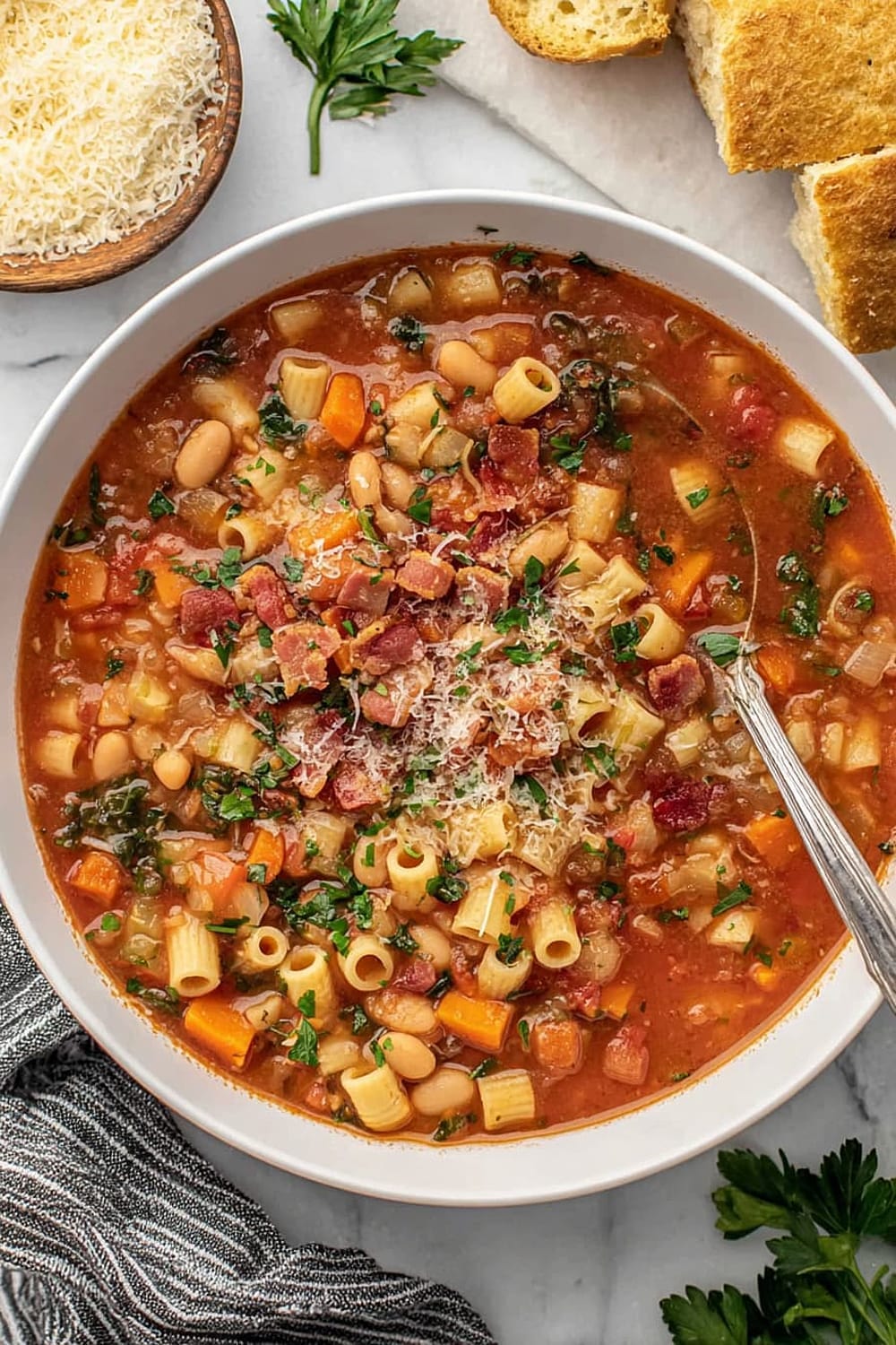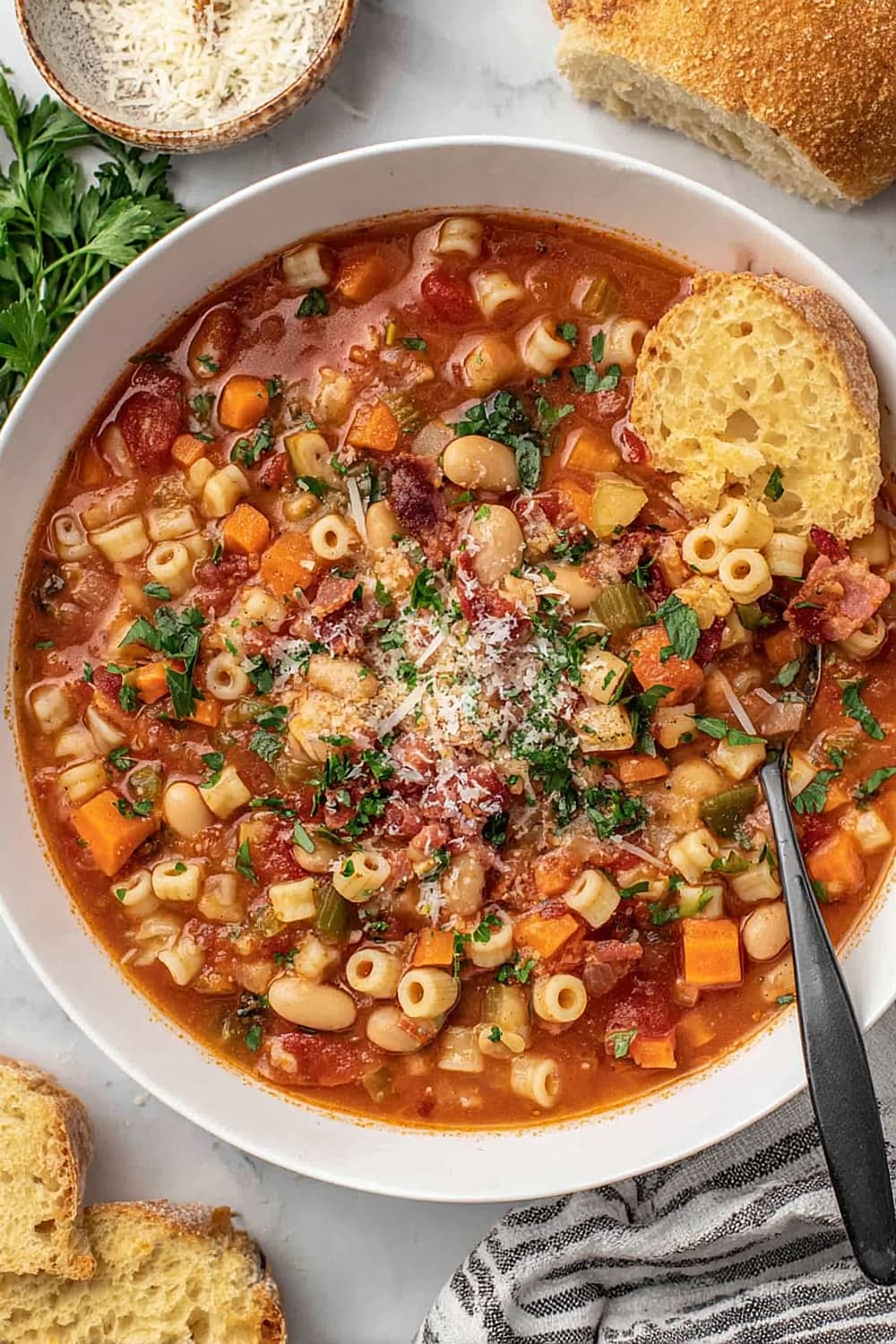 - 9 Serve in bowls topped with the reserved crispy bacon, any leftover chopped parsley, additional grated Parmesan cheese, fresh-cracked black pepper, and a side of warm, crusty bread for dipping.