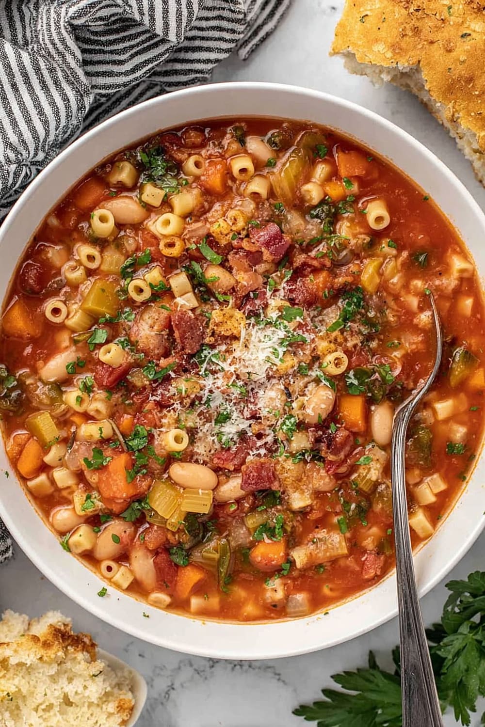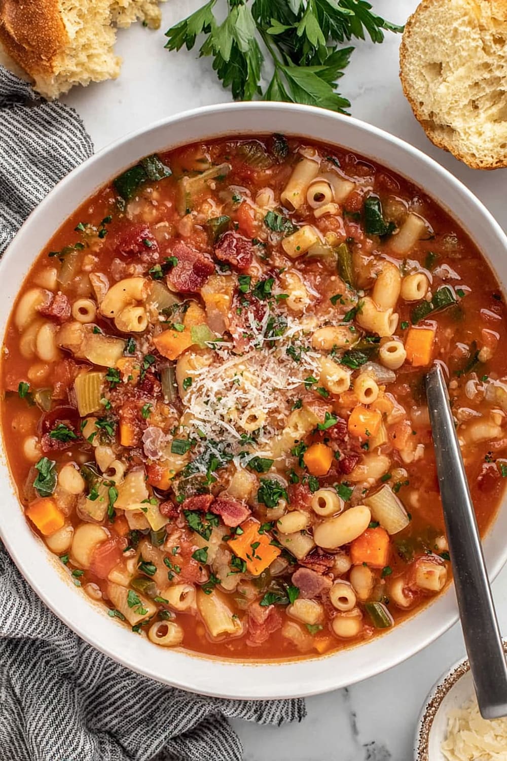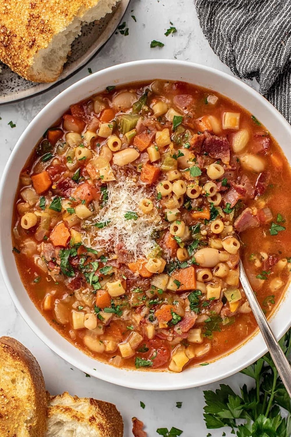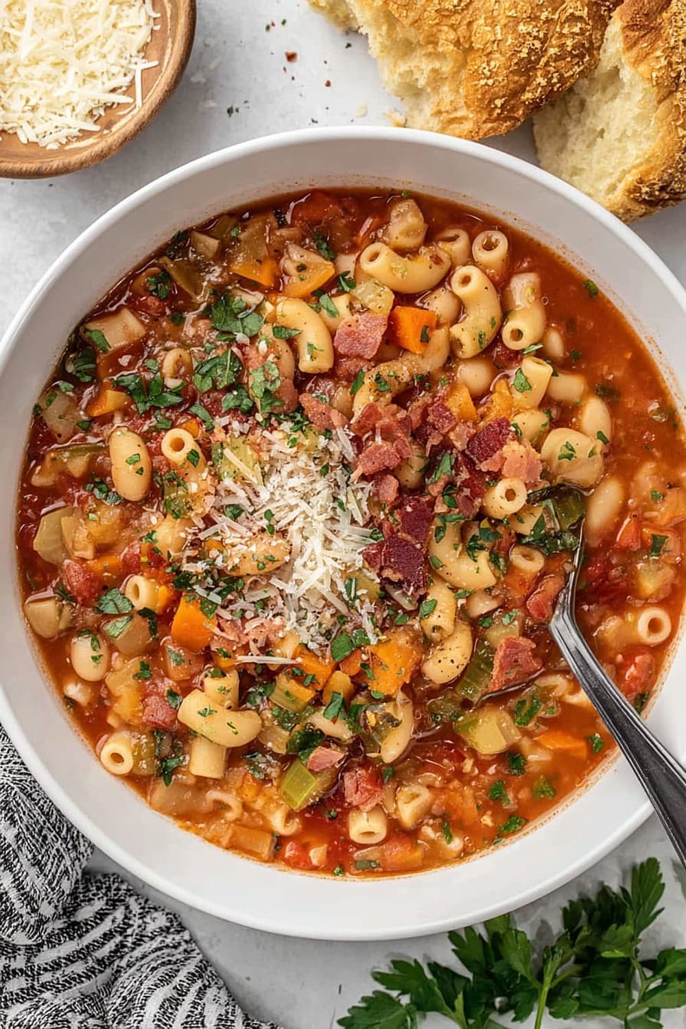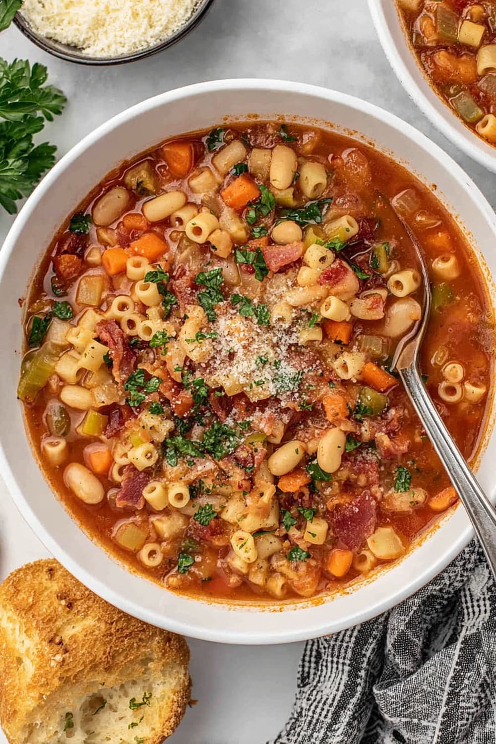 - 9 Serve in bowls topped with the reserved crispy bacon, any leftover chopped parsley, additional grated Parmesan cheese, fresh-cracked black pepper, and a side of warm, crusty bread for dipping.