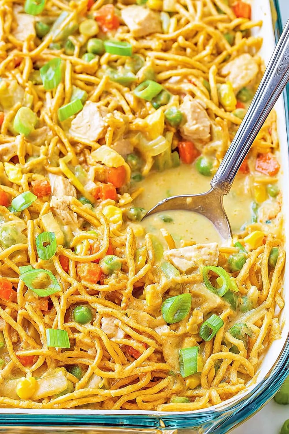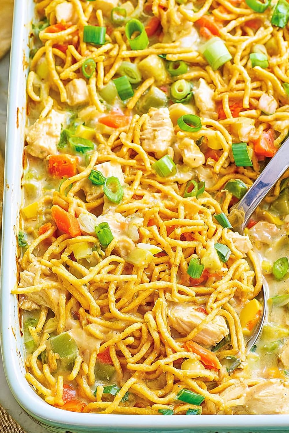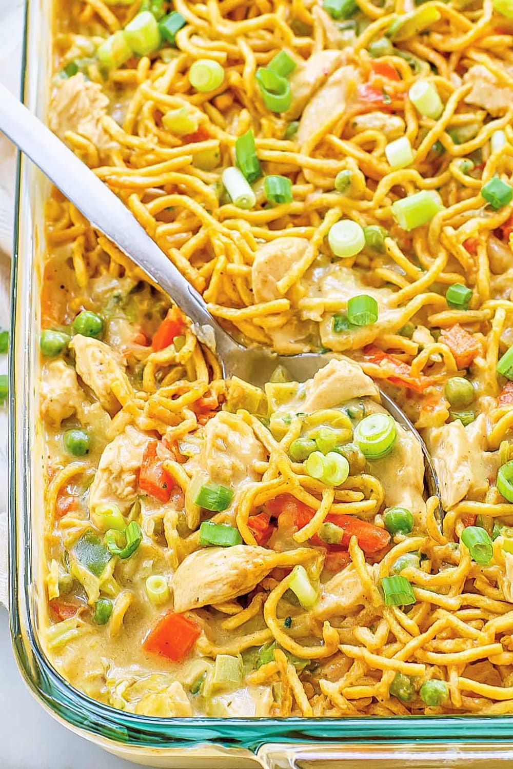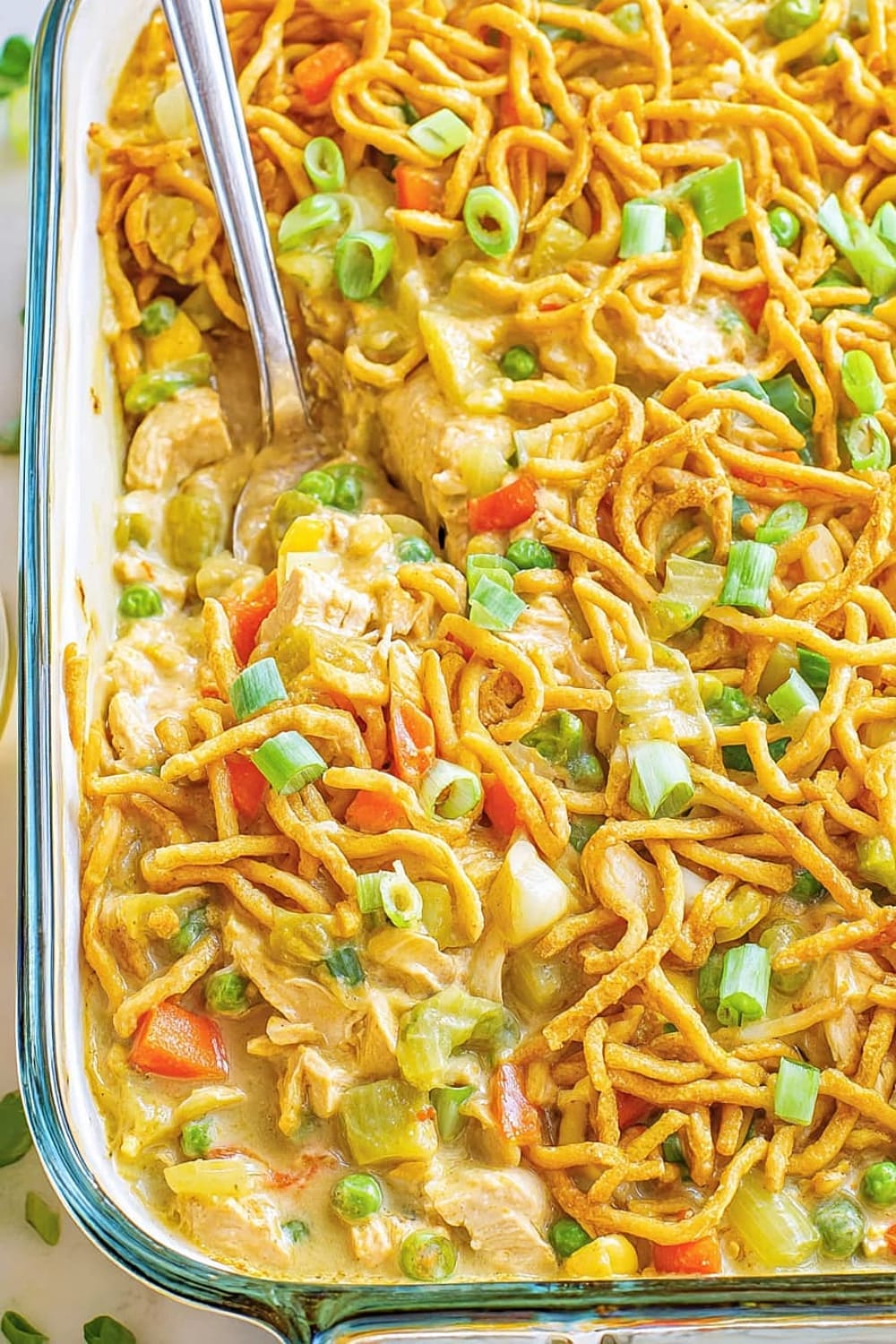 - 7 Transfer the entire mixture to your prepared casserole dish, spreading it evenly with a spatula. Top evenly with the remaining 1 cup chow mein noodles, ensuring good coverage for maximum crunch in every bite.