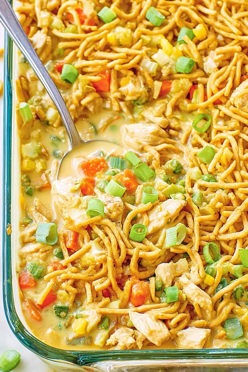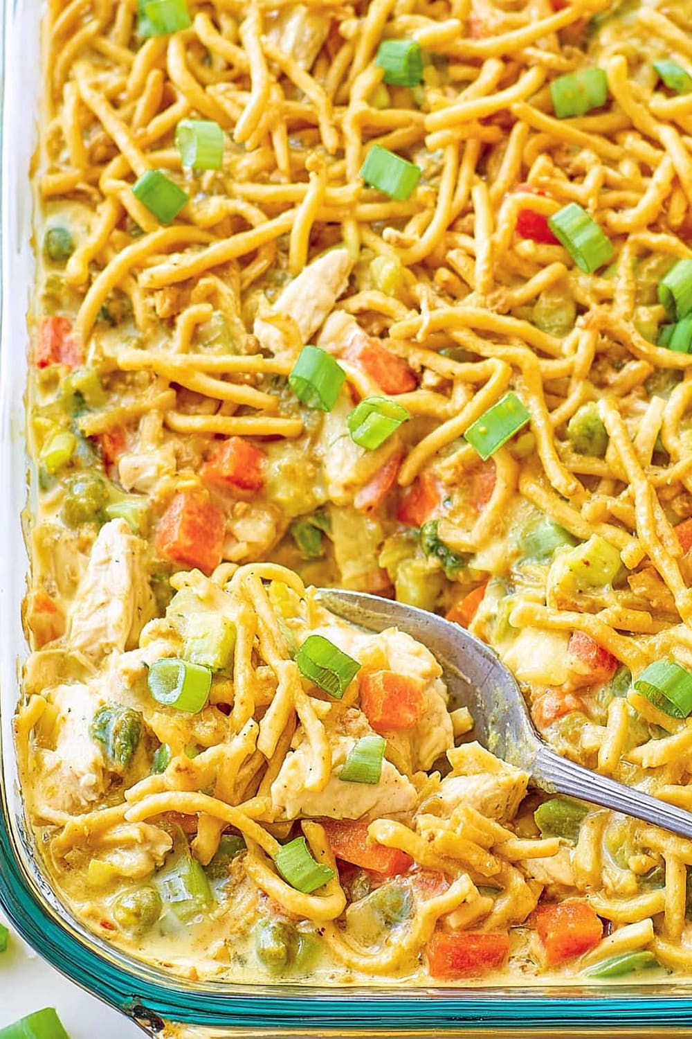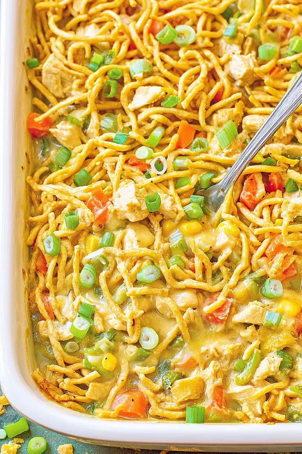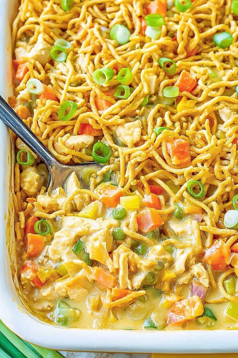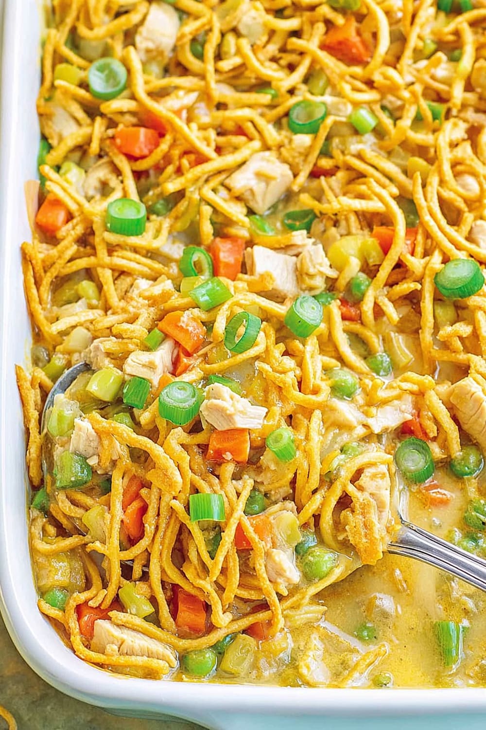 - 7 Transfer the entire mixture to your prepared casserole dish, spreading it evenly with a spatula. Top evenly with the remaining 1 cup chow mein noodles, ensuring good coverage for maximum crunch in every bite.