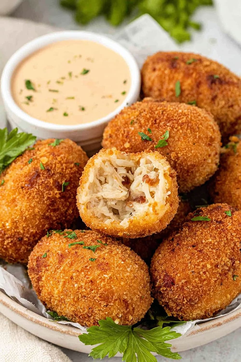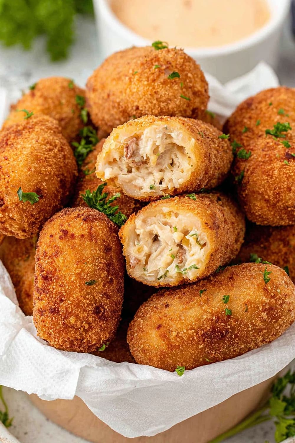 - Remove finished croquettes to a paper towel-lined plate to drain excess oil. Garnish immediately with fresh chopped parsley and serve hot alongside the chilled remoulade sauce for the perfect temperature contrast.