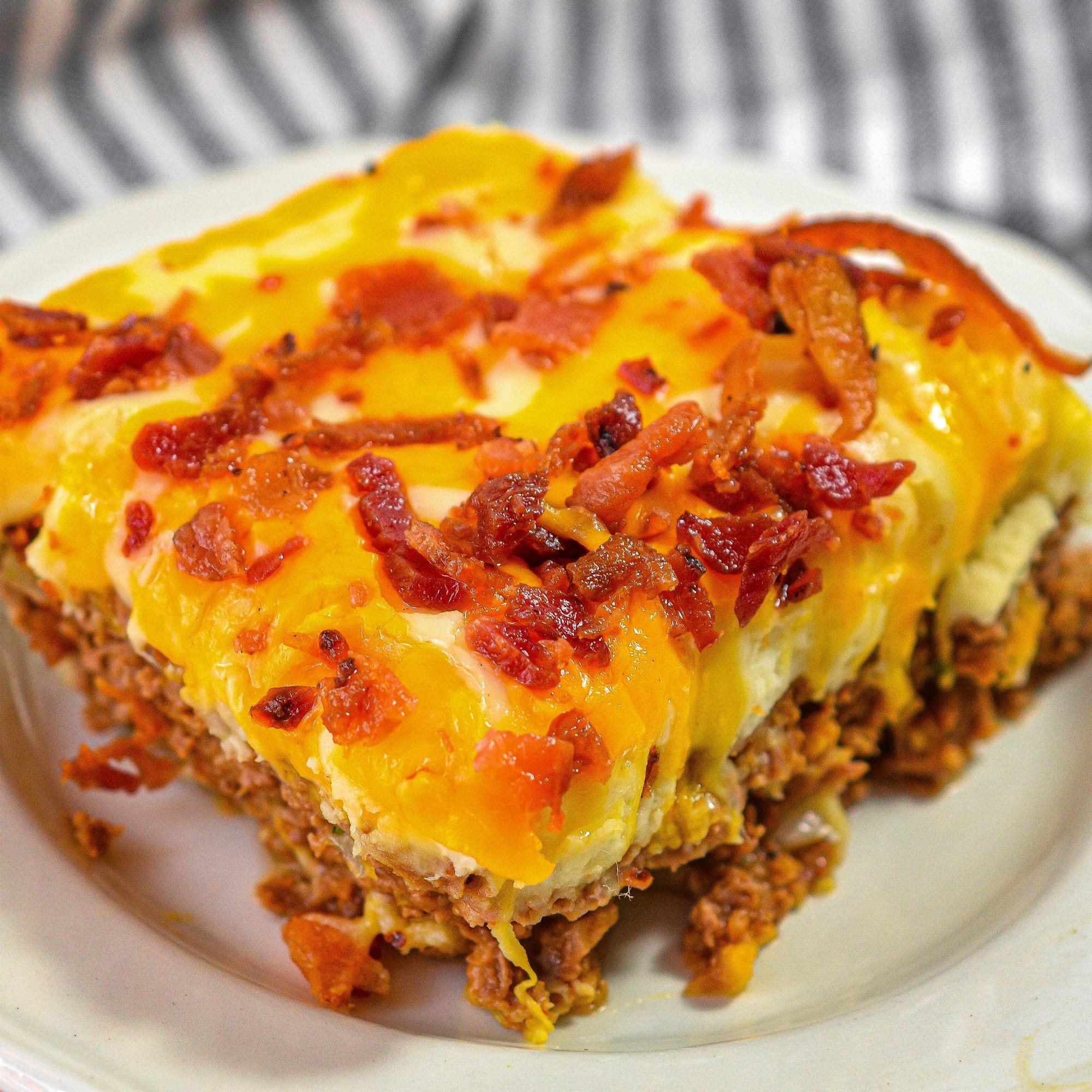 This meat and potato bake is topped with bacon, fried onions, and cheese.