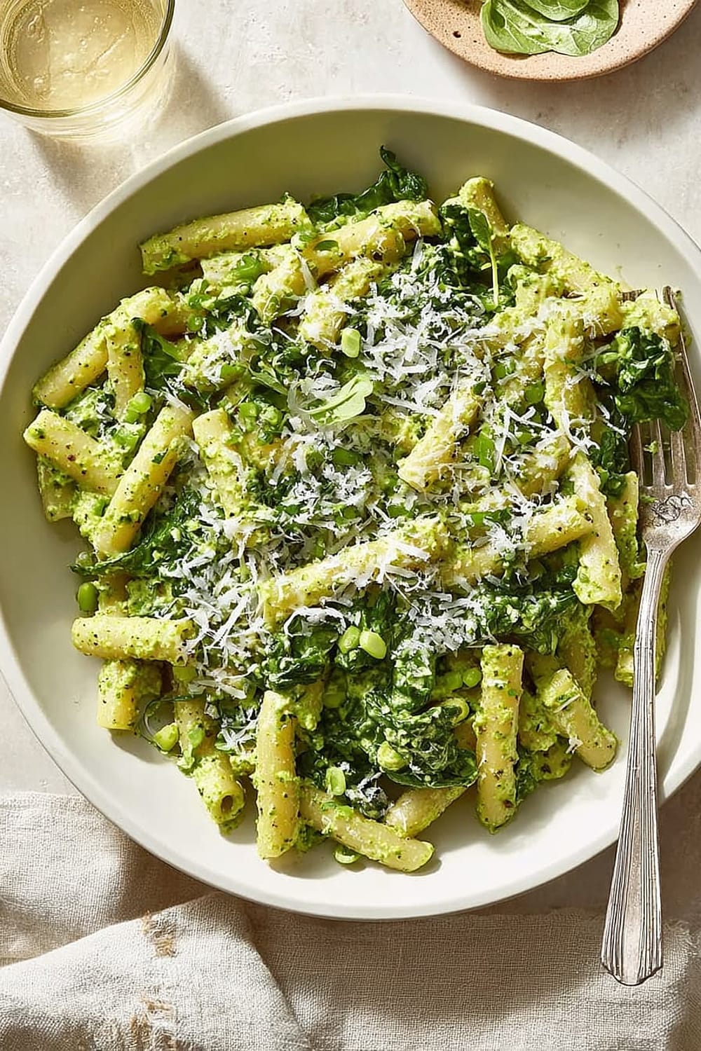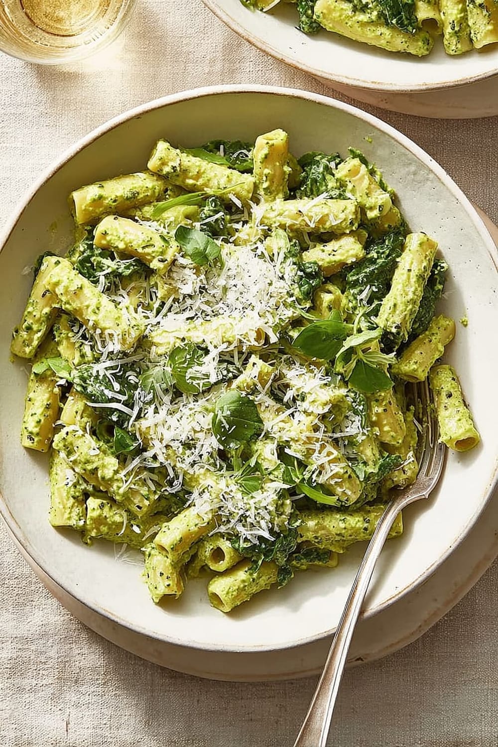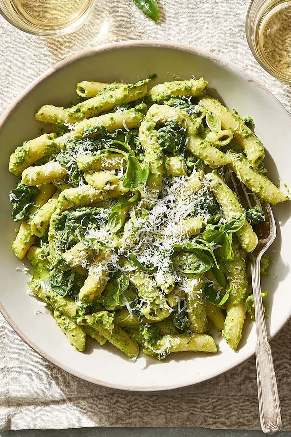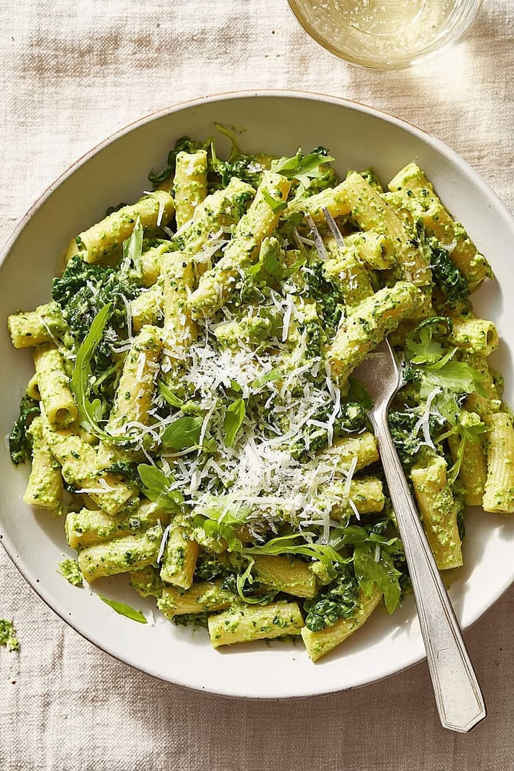 This creamy kale pasta delivers approximately 445 calories per serving, making it a satisfying yet reasonable meal option. The dish provides a balanced macronutrient profile with complex carbohydrates from the pasta, high-quality protein from cottage cheese and Parmesan, and healthy fats from olive oil. Each serving contains significant fiber from both the pasta and kale, supporting digestive health and satiety.