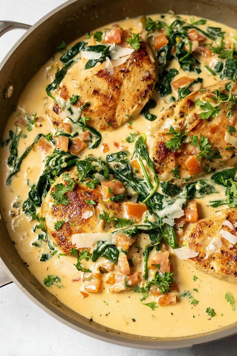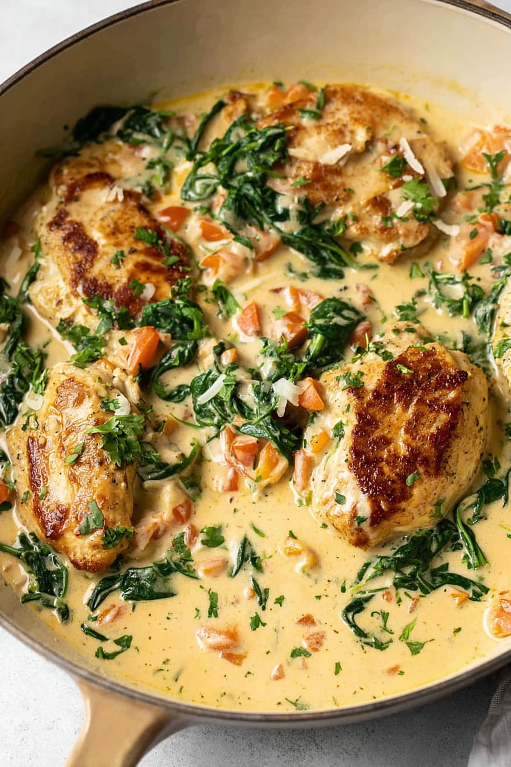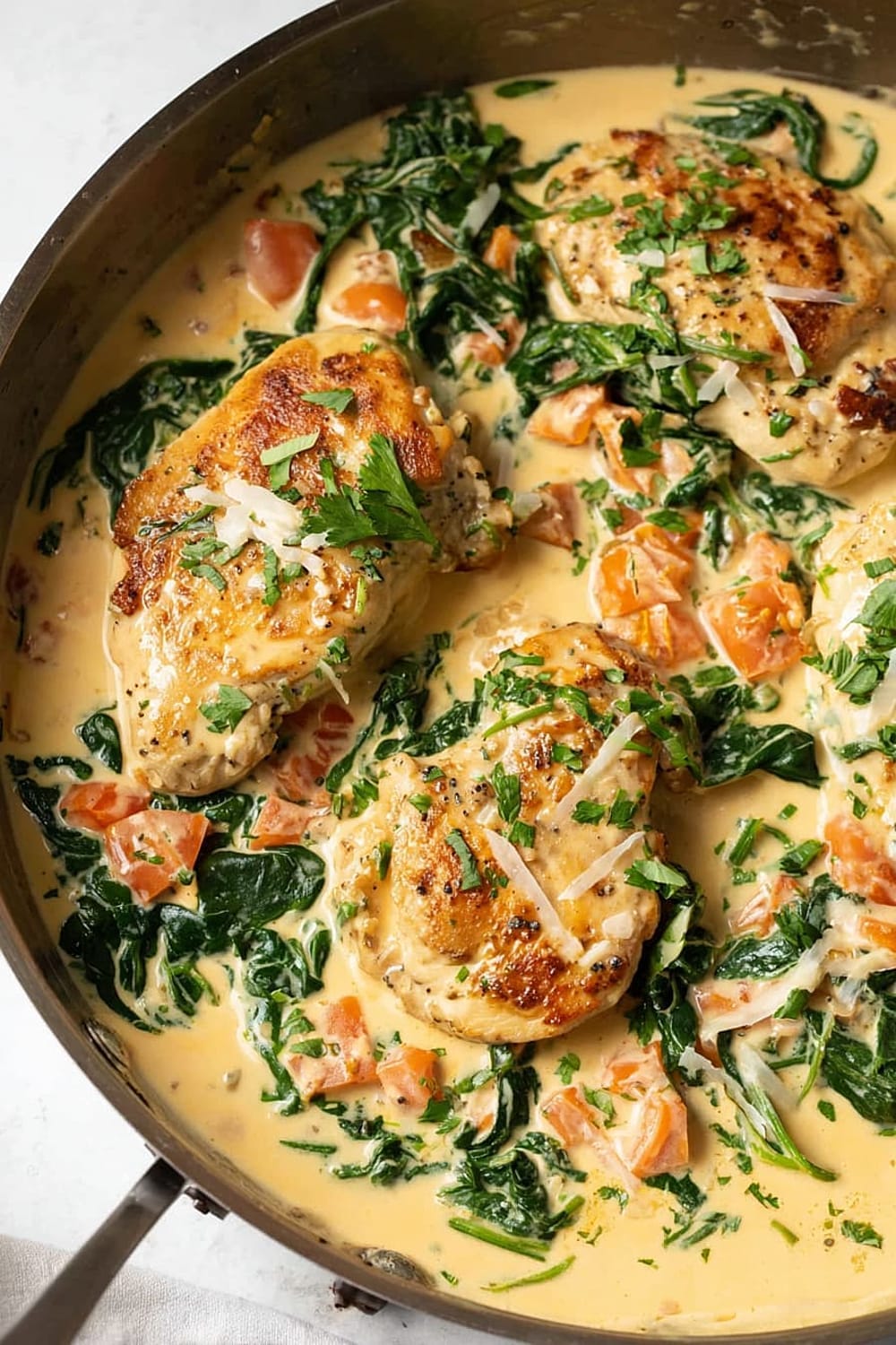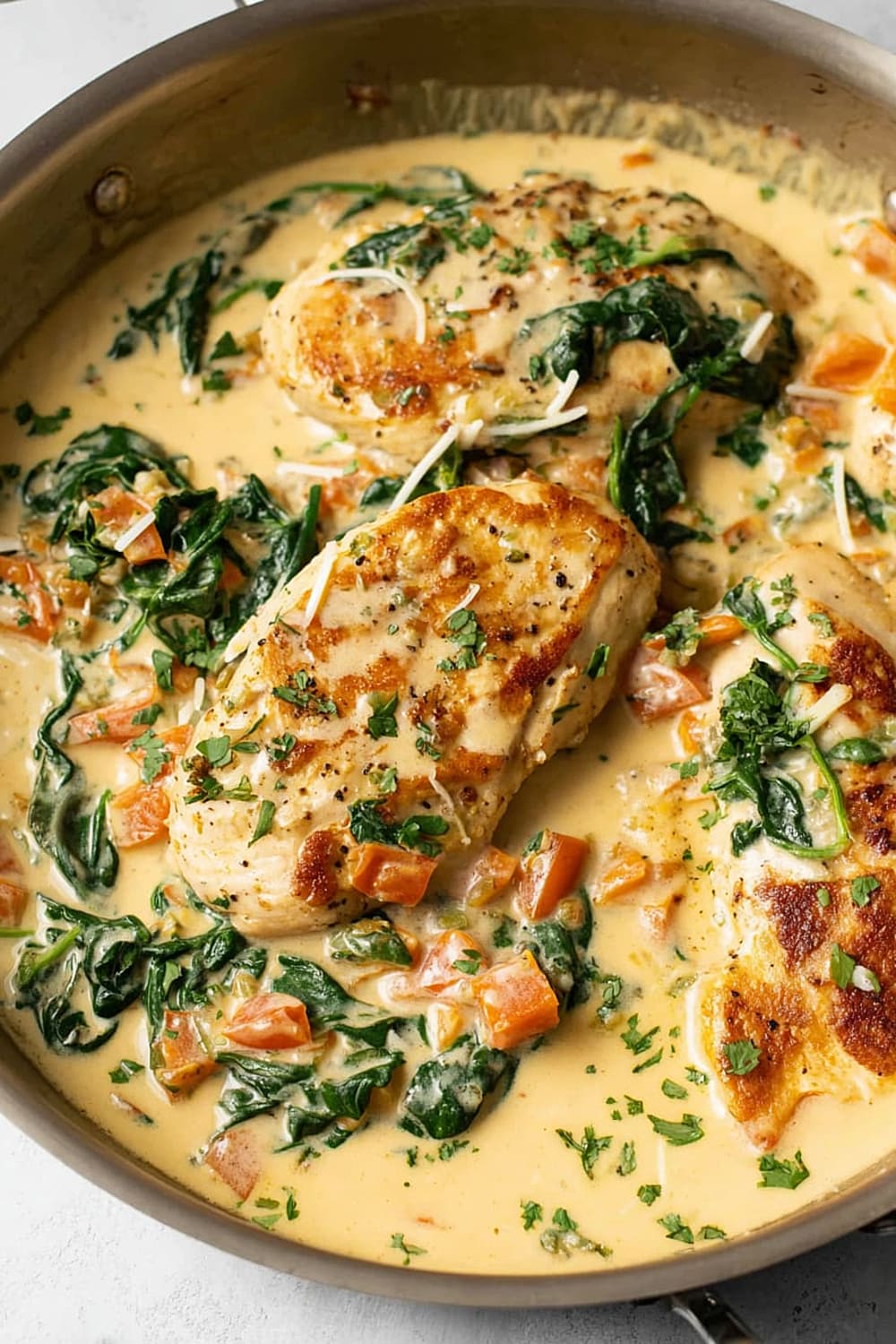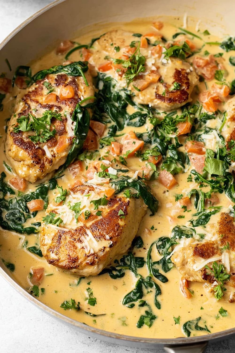 The combination of perfectly seared chicken, wilted spinach, and sun-kissed tomatoes swimming in a rich Parmesan cream sauce is basically a warm hug in skillet form.