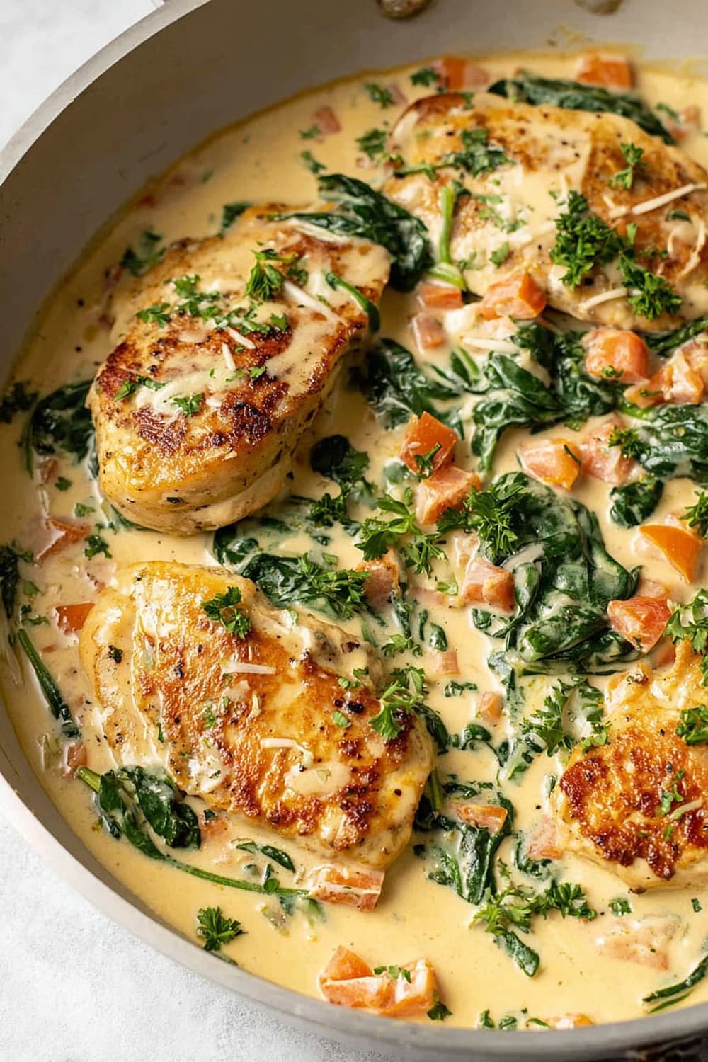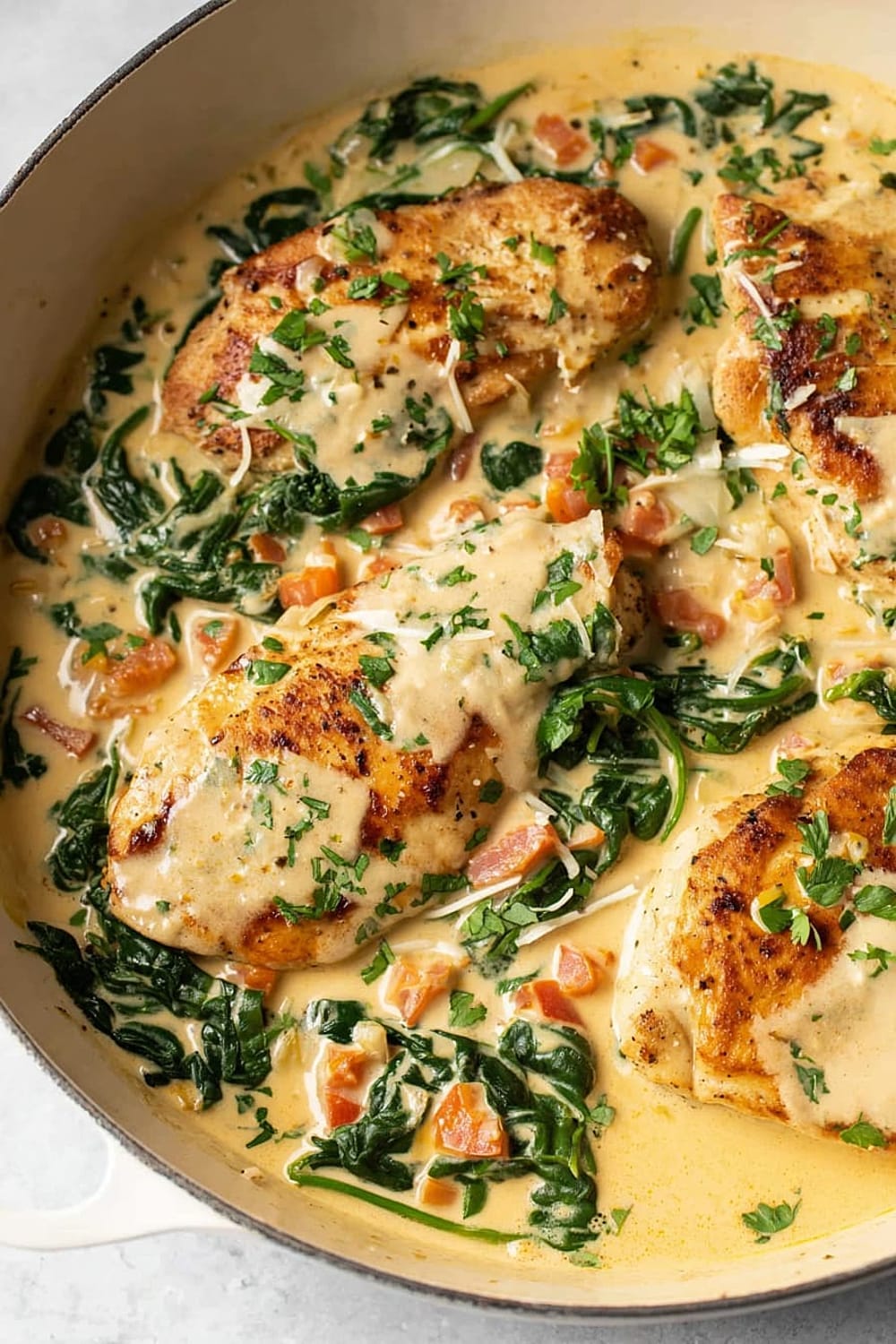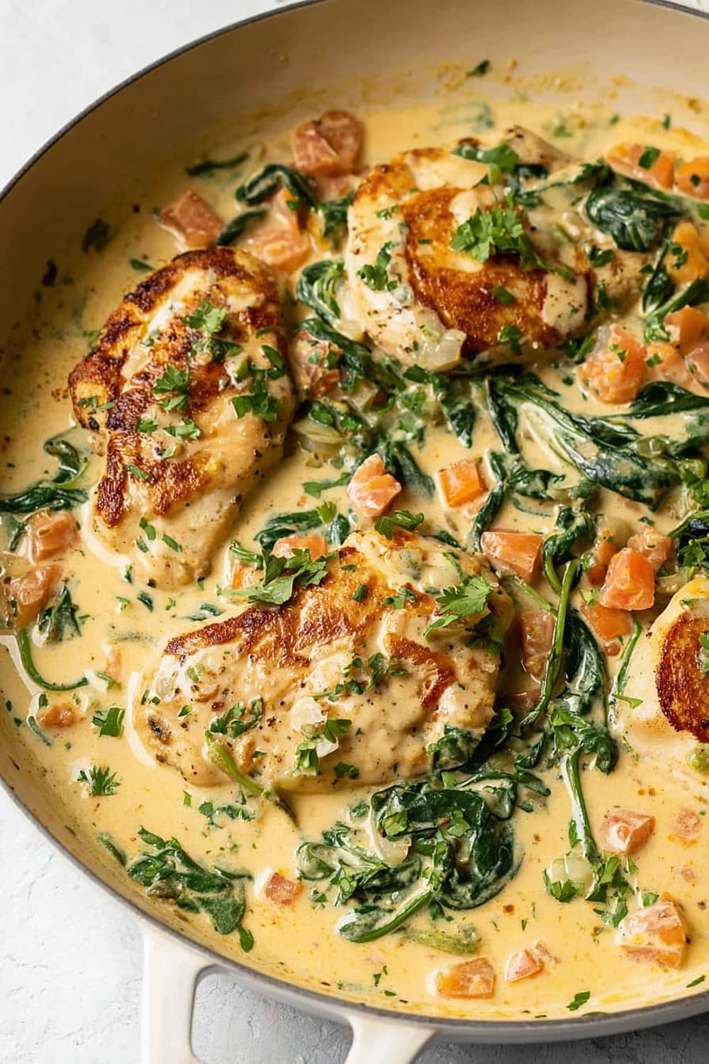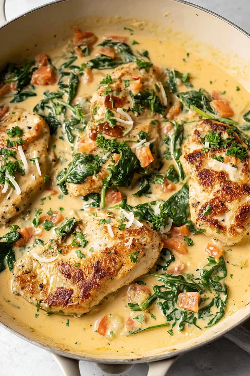 The combination of perfectly seared chicken, wilted spinach, and sun-kissed tomatoes swimming in a rich Parmesan cream sauce is basically a warm hug in skillet form.