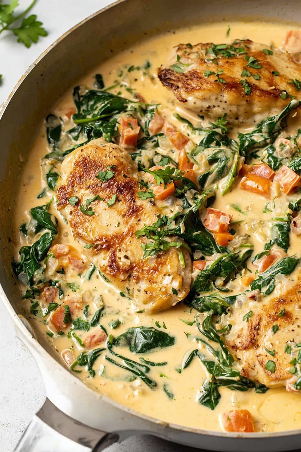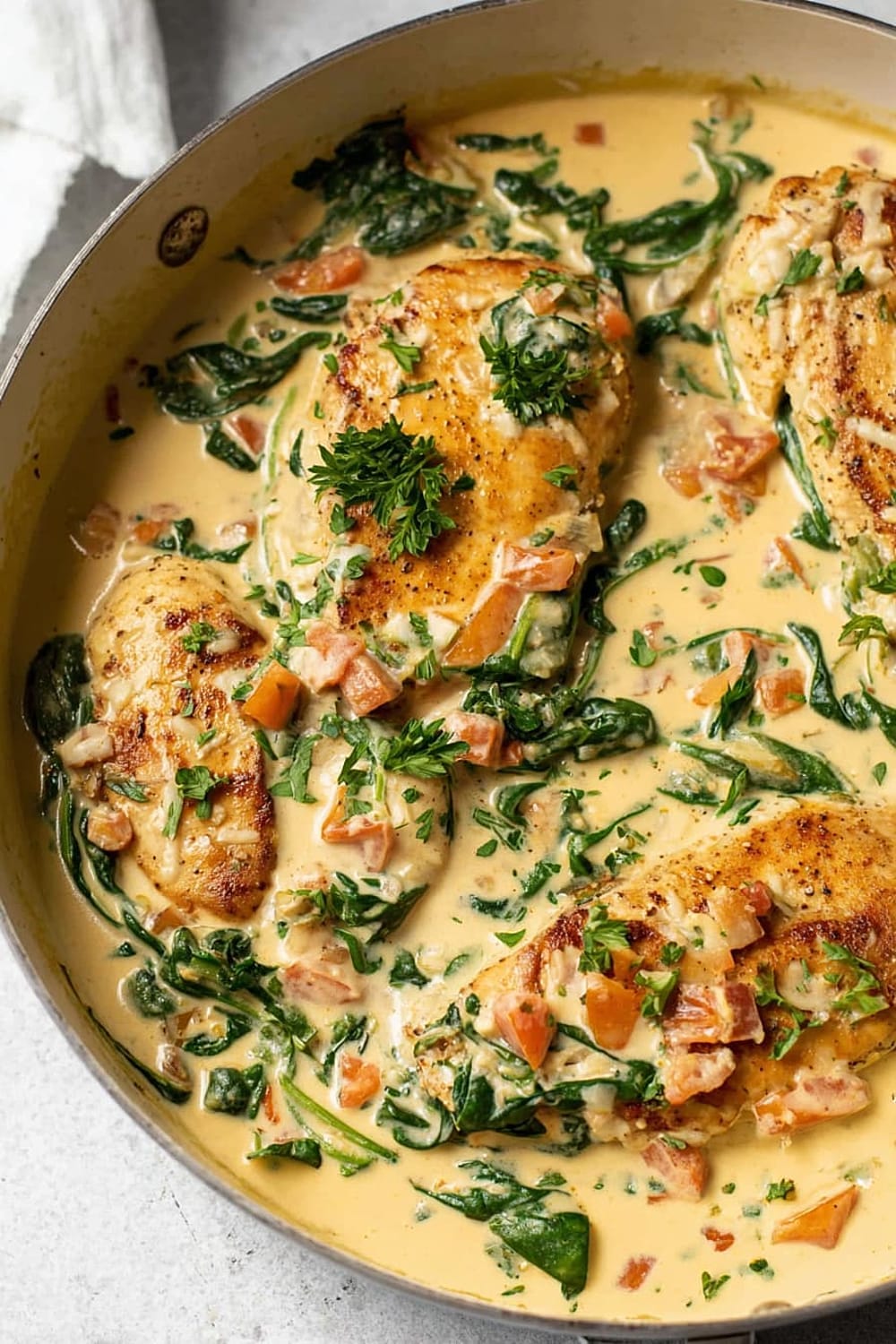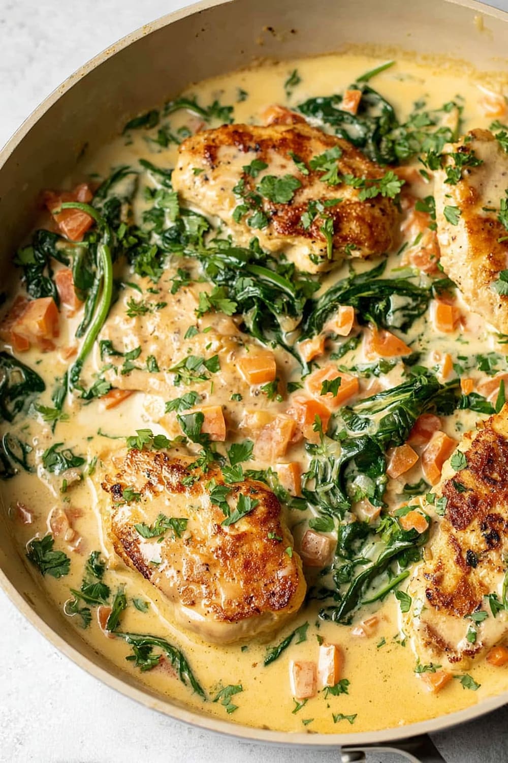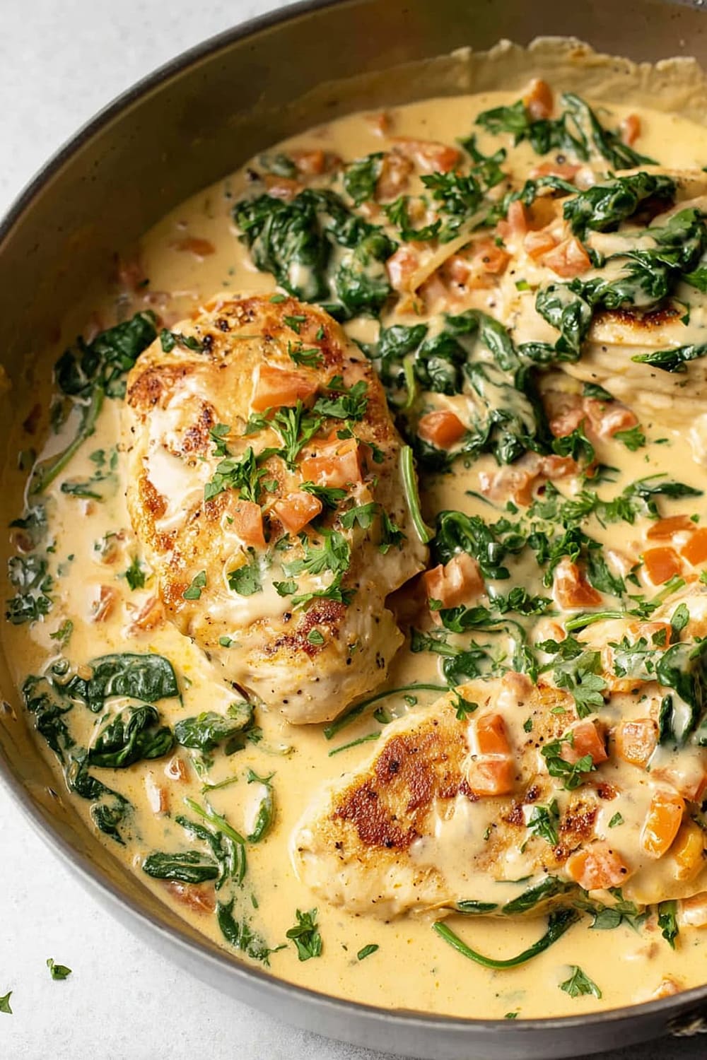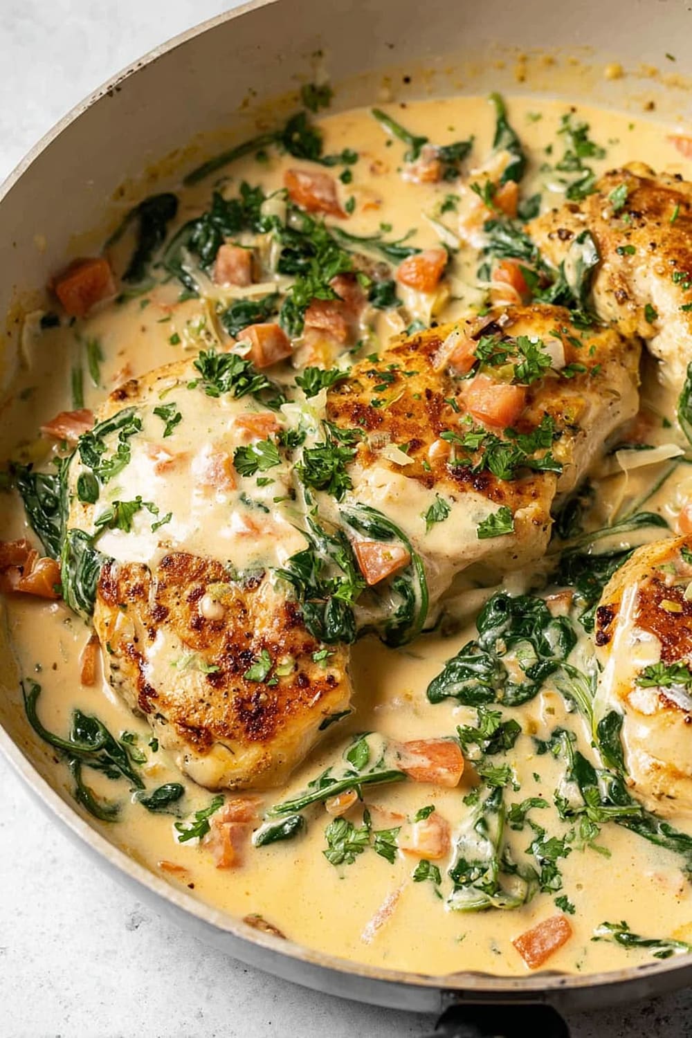 The combination of perfectly seared chicken, wilted spinach, and sun-kissed tomatoes swimming in a rich Parmesan cream sauce is basically a warm hug in skillet form.