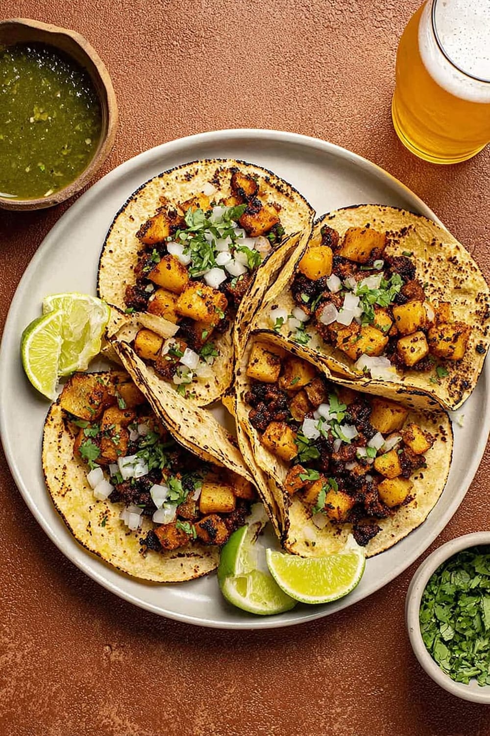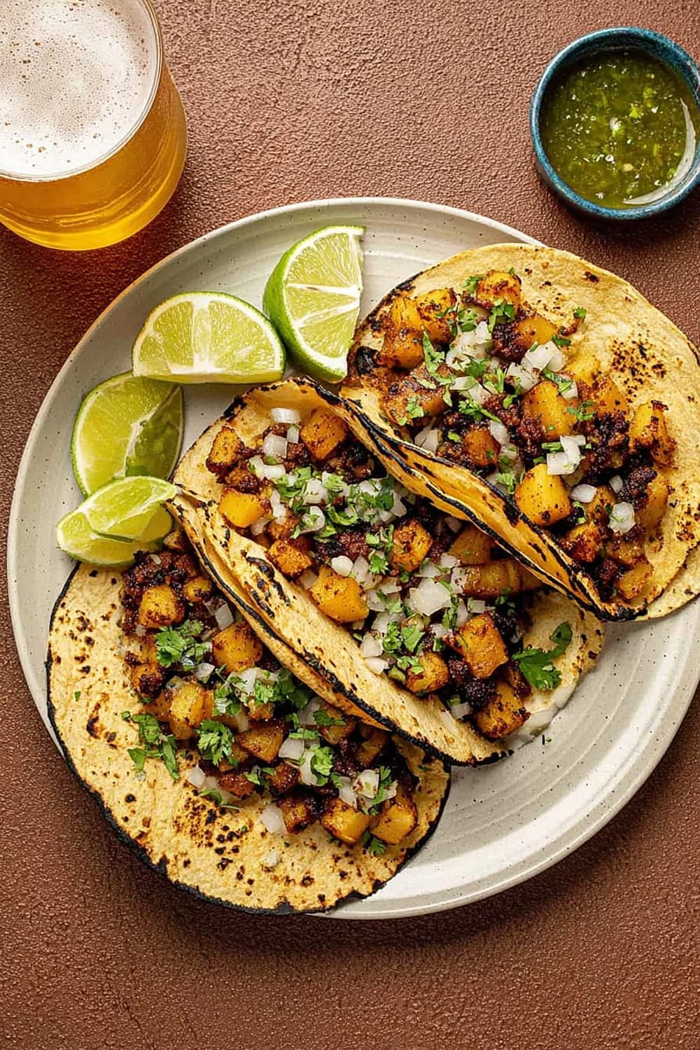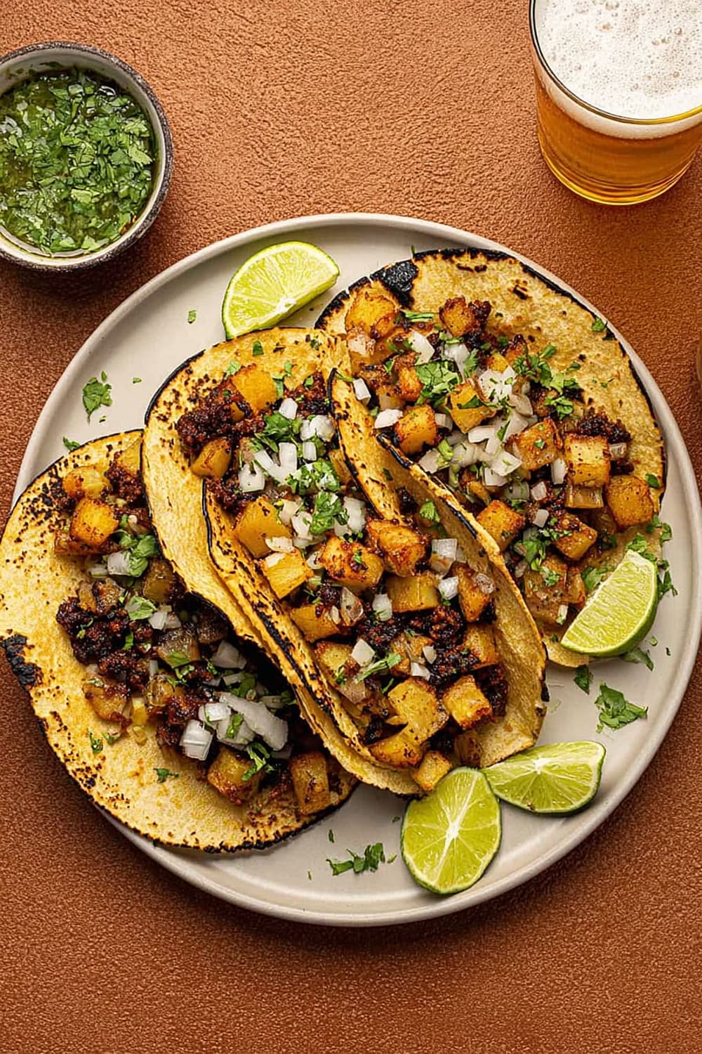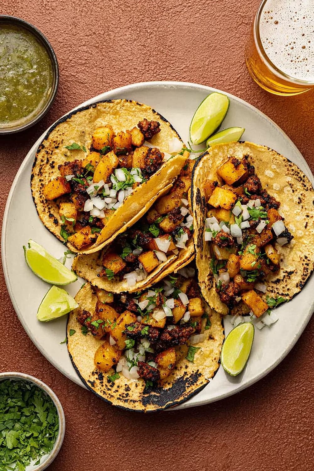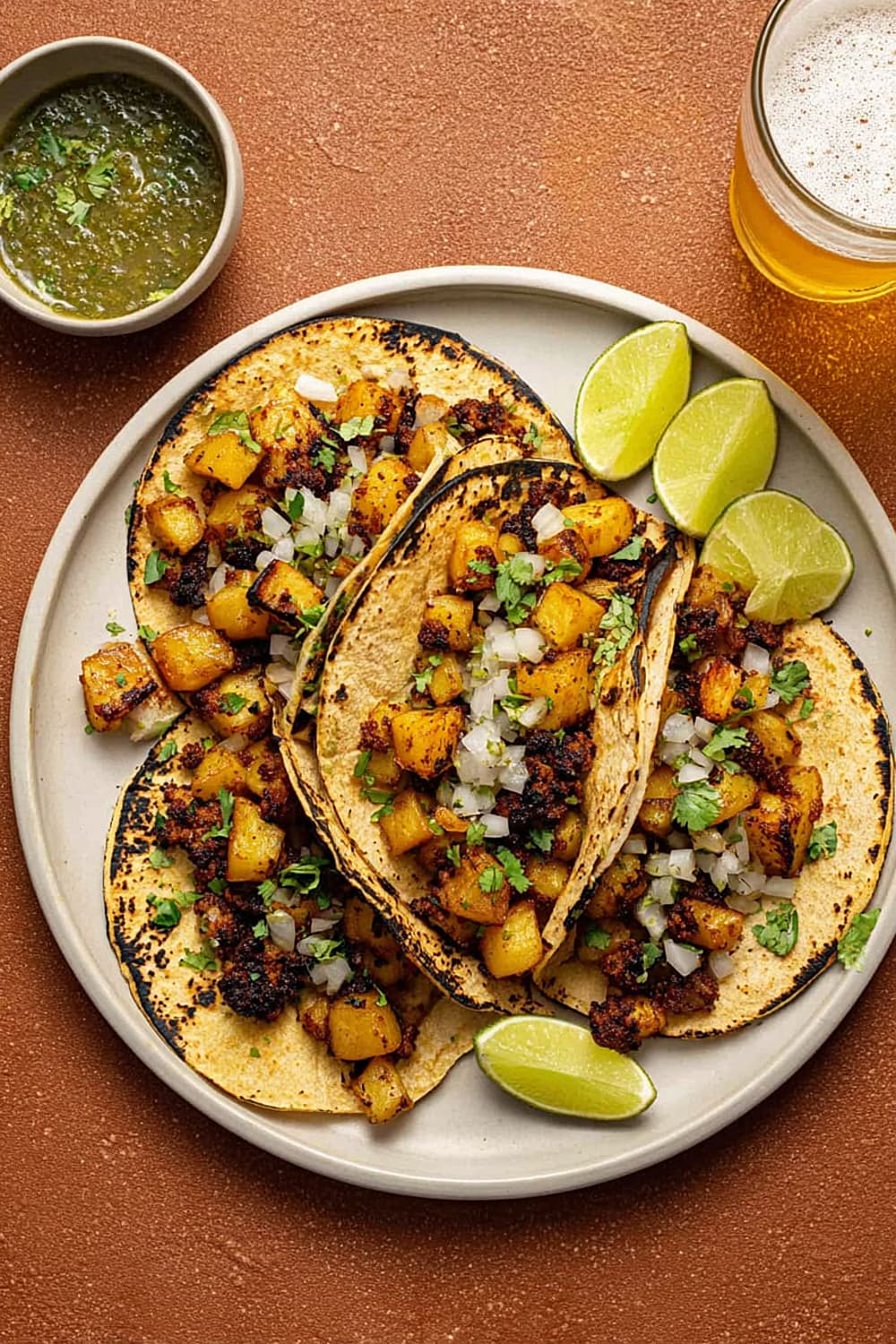 The secret to these incredible tacos lies in the technique – we’re parboiling the potatoes first to get them fluffy inside, then crisping them to golden perfection in a cast iron skillet until they’re absolutely irresistible.