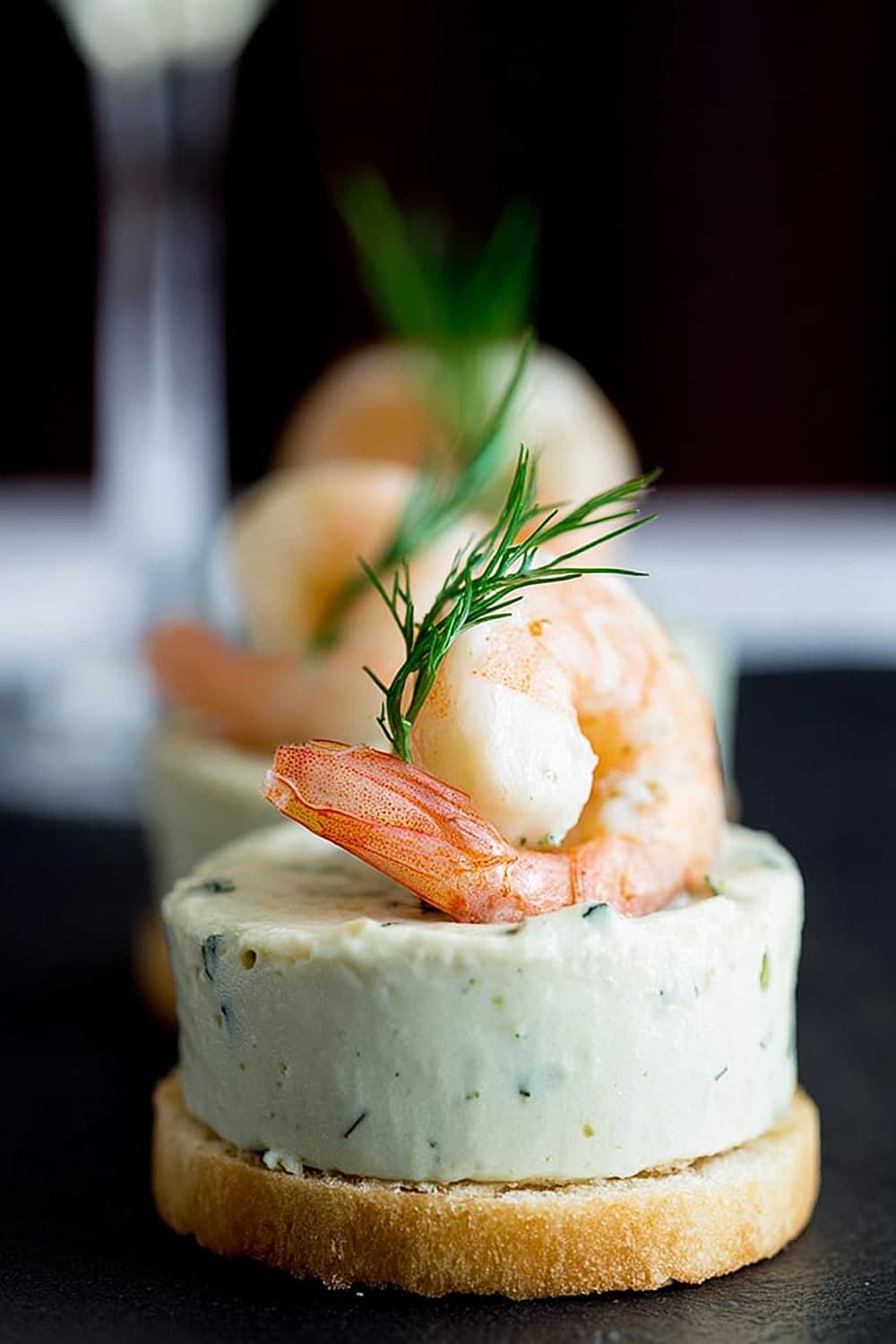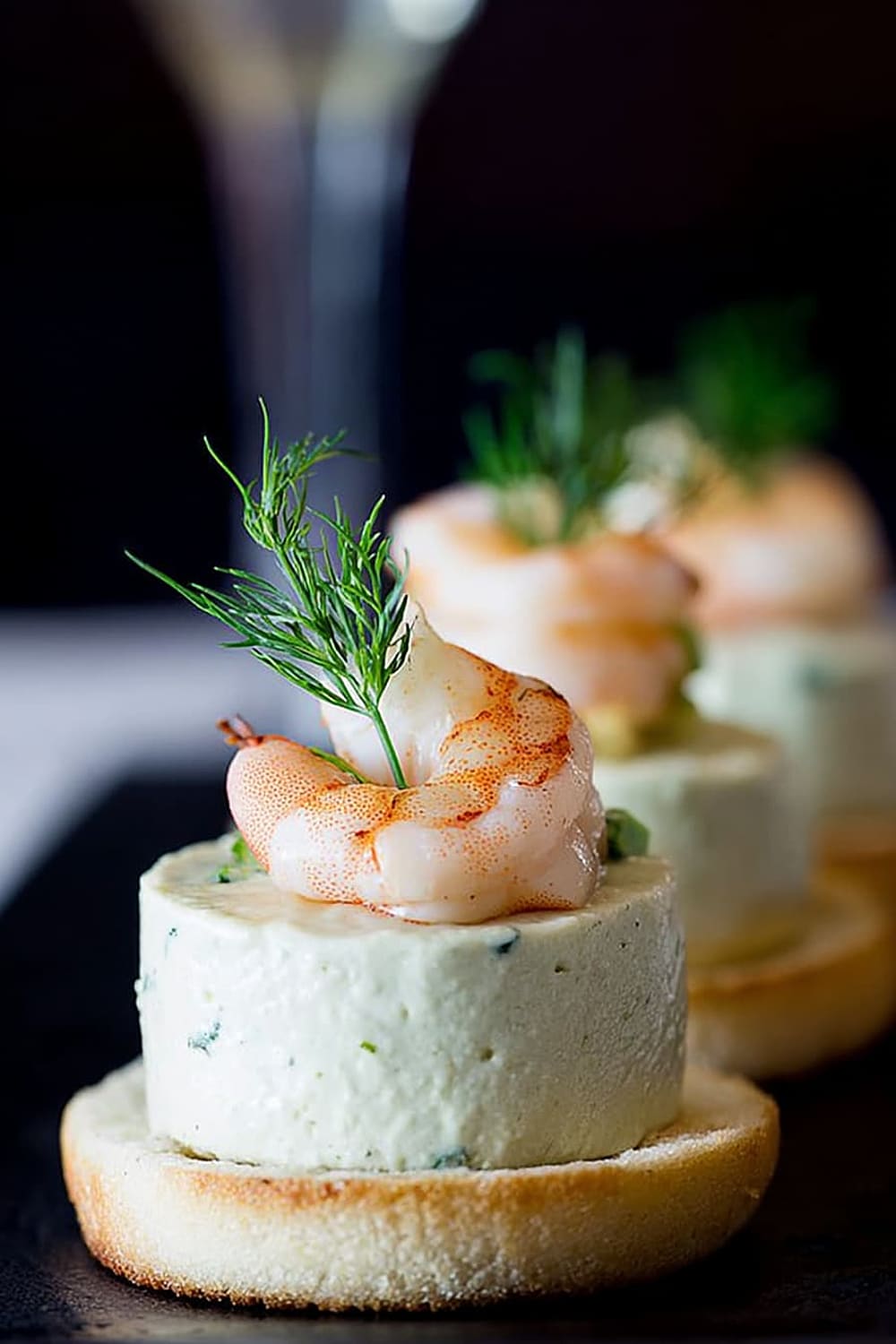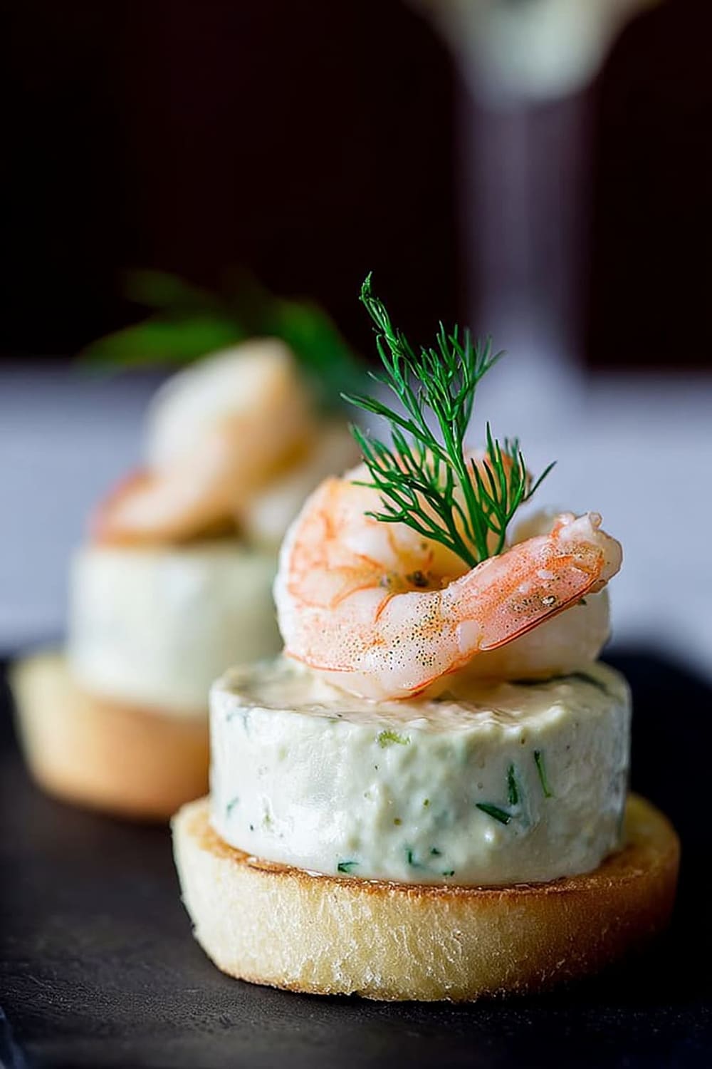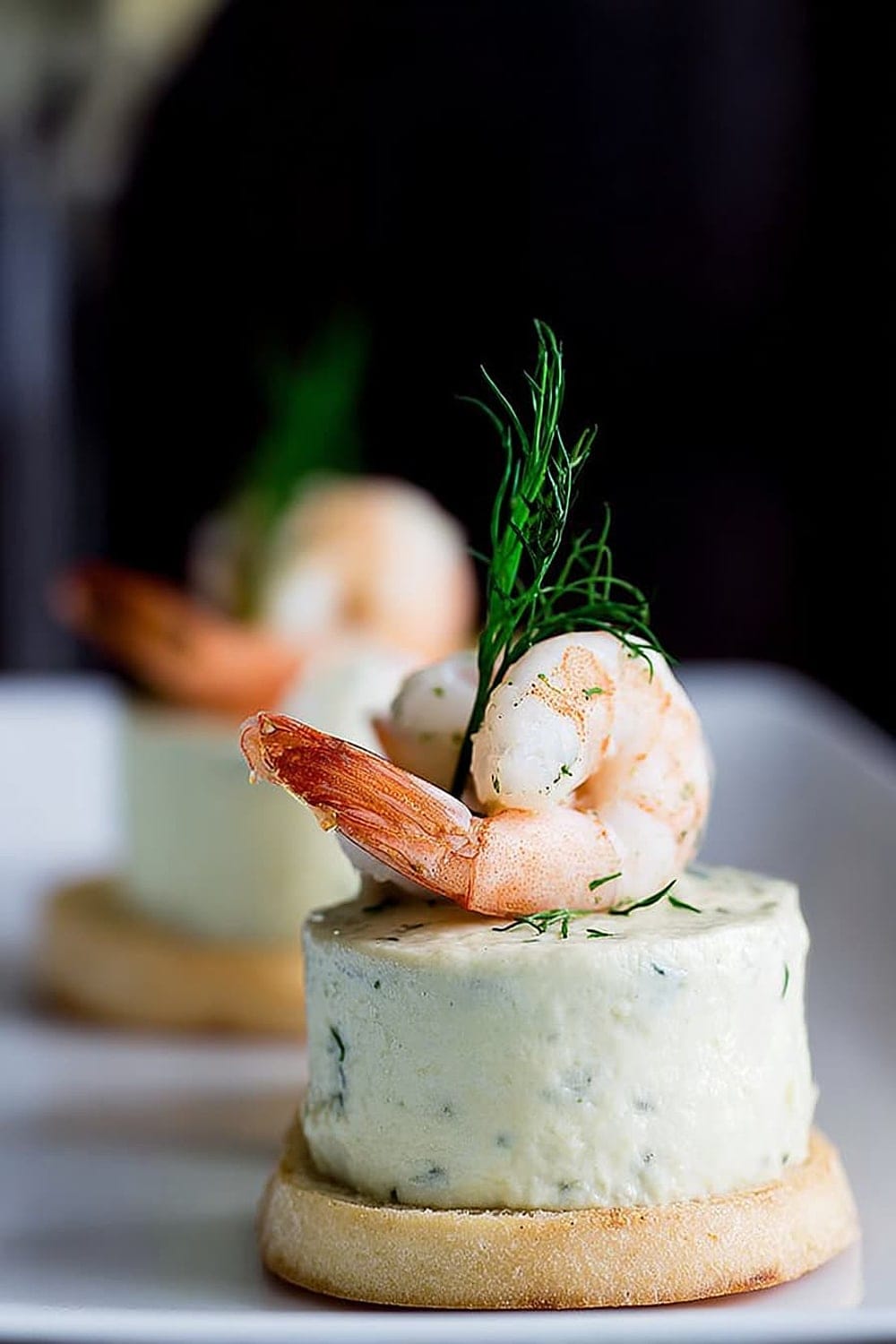 - Using a flat knife, carefully transfer each mousse bite onto a toast round, then crown with a shrimp and fresh dill sprig. Serve immediately for best texture contrast.