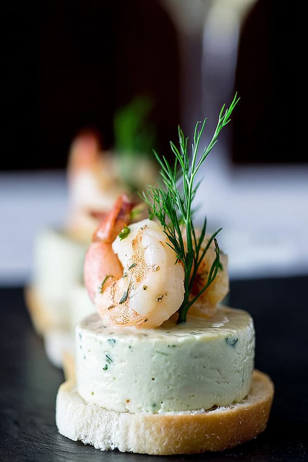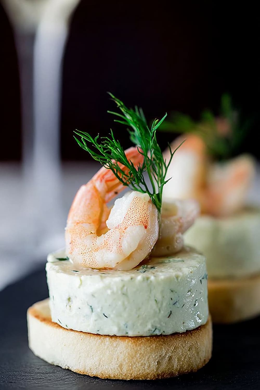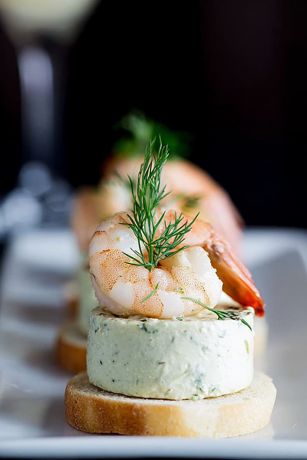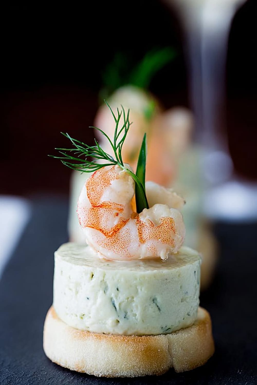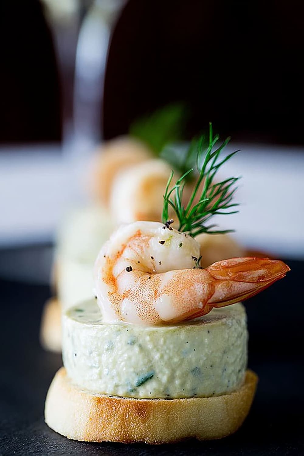 - Using a flat knife, carefully transfer each mousse bite onto a toast round, then crown with a shrimp and fresh dill sprig. Serve immediately for best texture contrast.