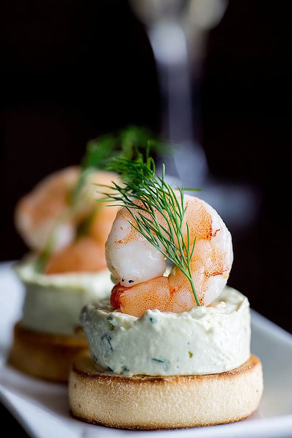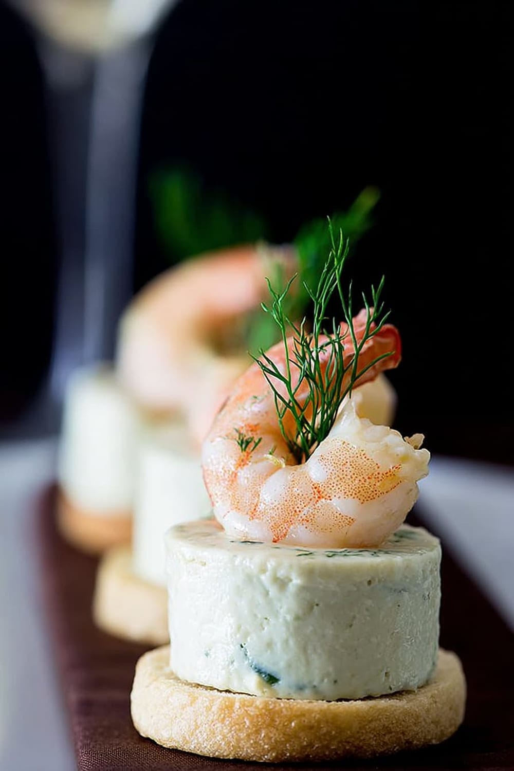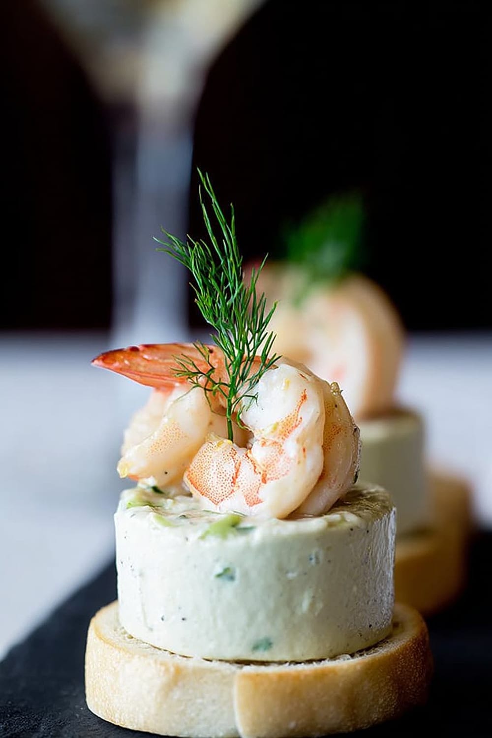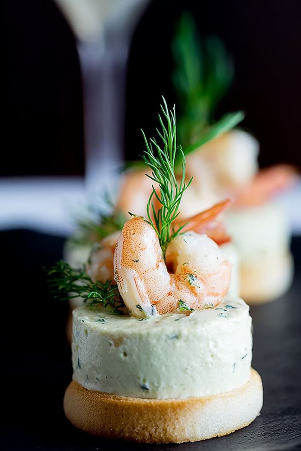 - Using a flat knife, carefully transfer each mousse bite onto a toast round, then crown with a shrimp and fresh dill sprig. Serve immediately for best texture contrast.