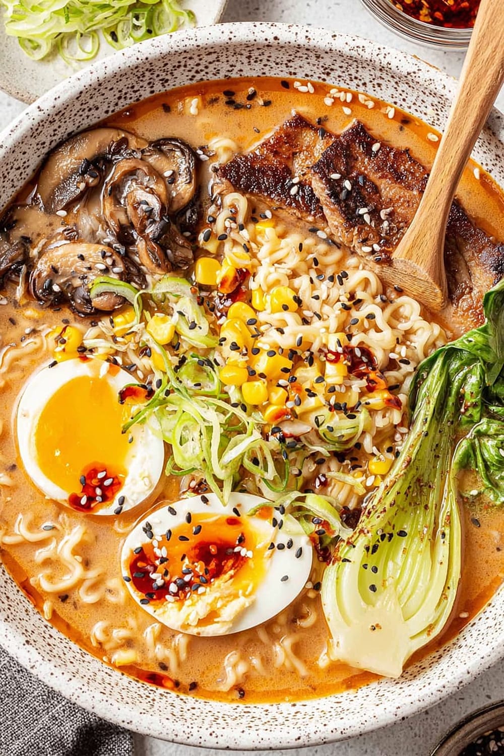 This hearty ramen is perfect for cold weather comfort food, especially during fall and winter months when the warming spices and rich broth provide satisfying nourishment. Serve for casual dinner parties where the interactive nature of customizing toppings creates a fun, social dining experience.