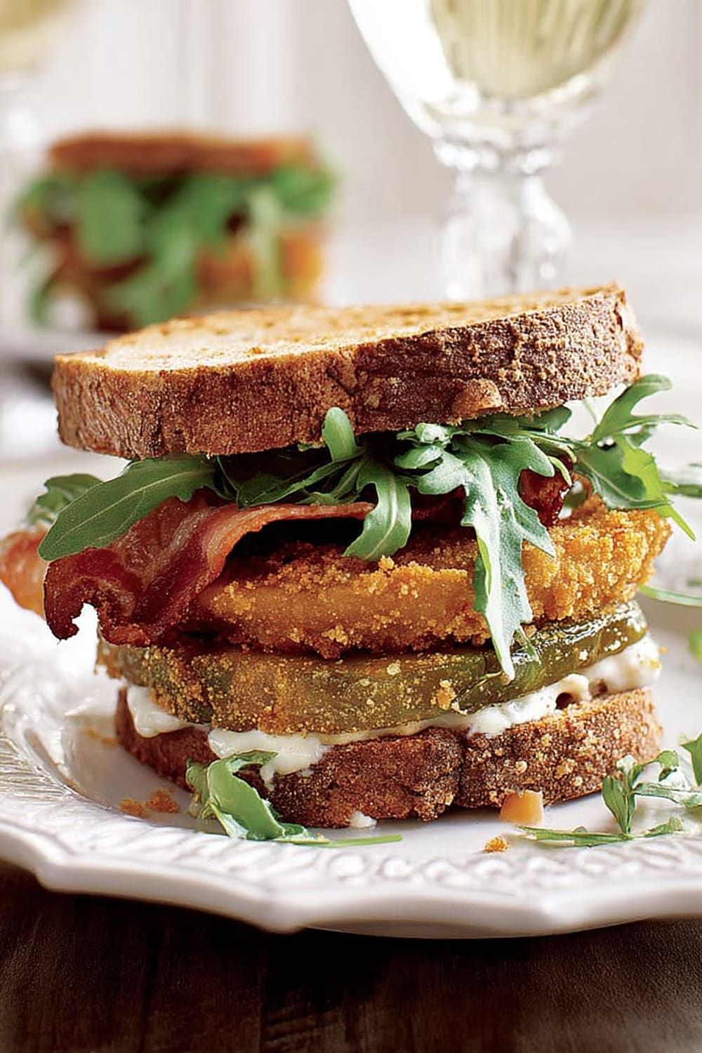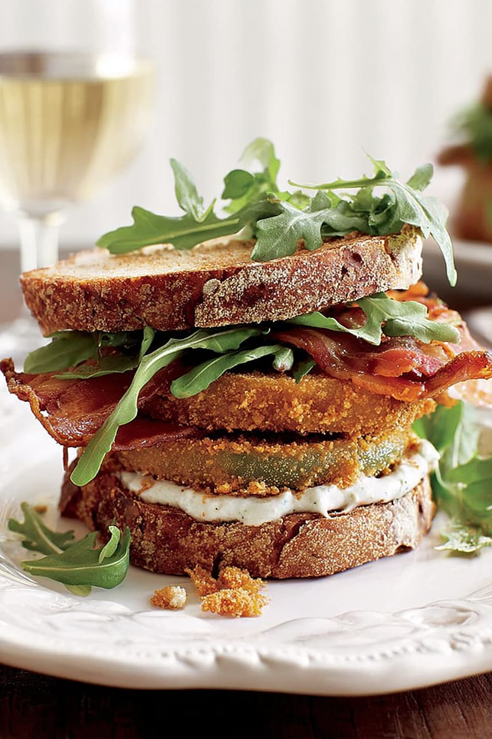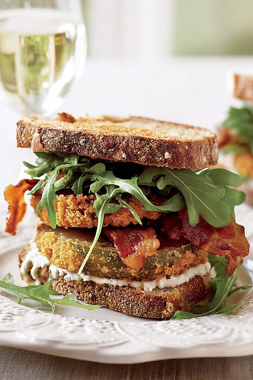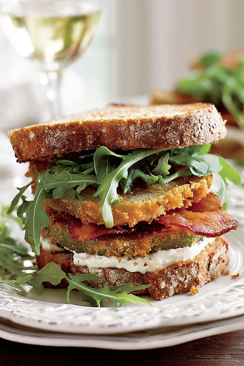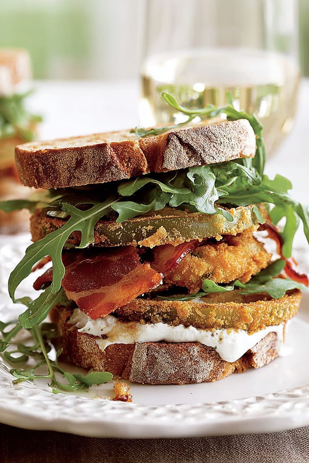 Picture this: tangy green tomatoes with a crispy exterior that gives way to a tender, slightly tart center, layered with smoky bacon and peppery arugula between thick slices of toasted multigrain bread.