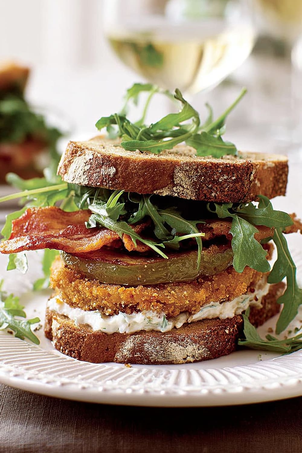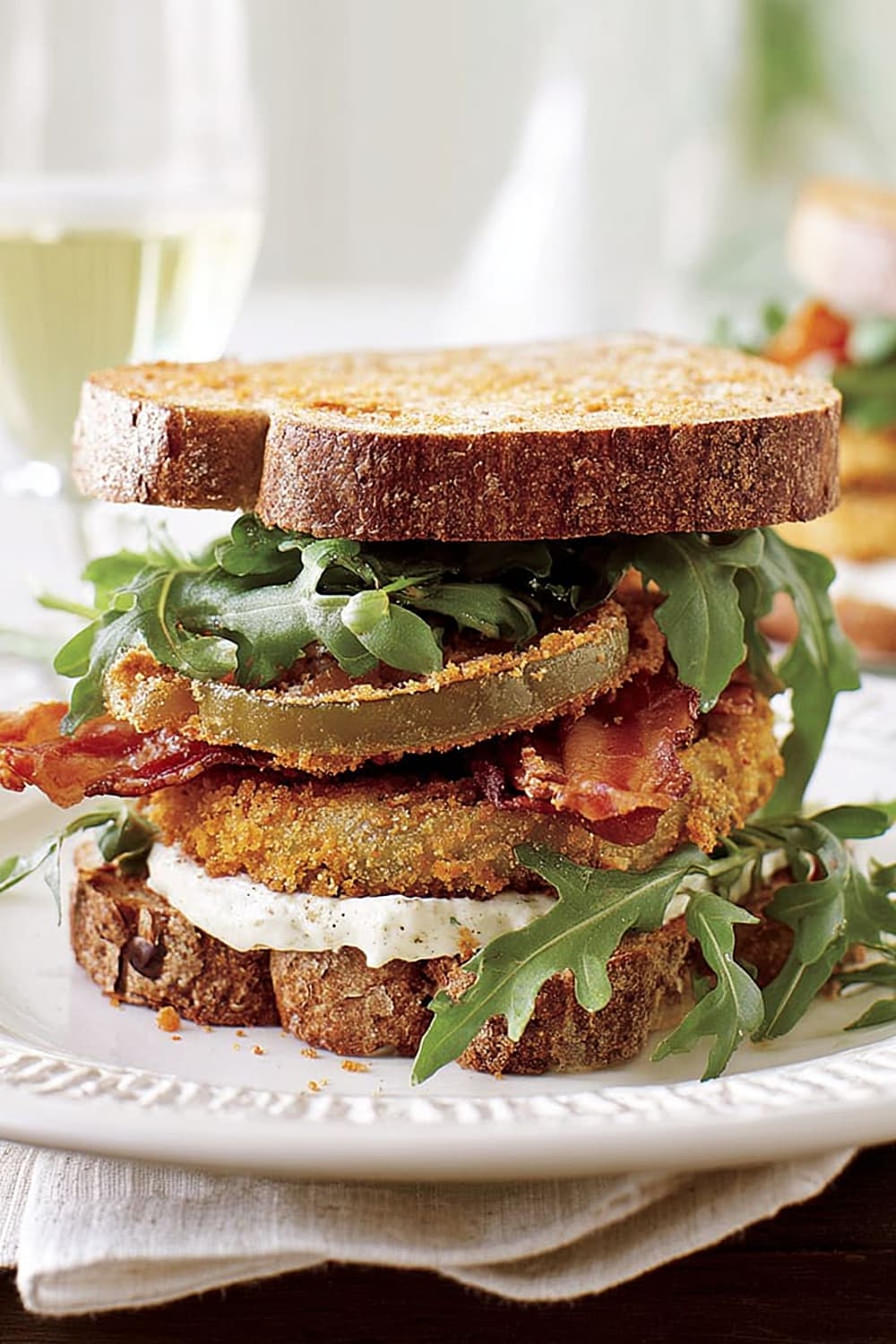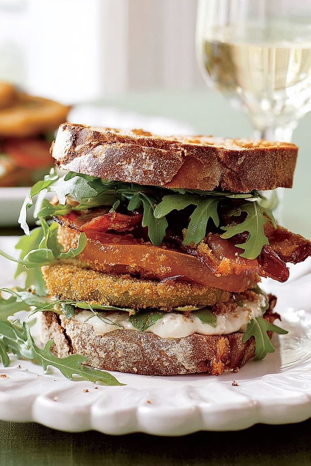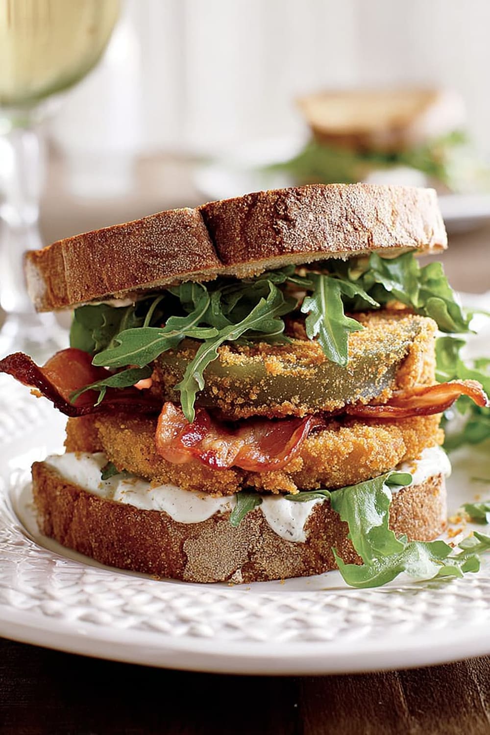 Picture this: tangy green tomatoes with a crispy exterior that gives way to a tender, slightly tart center, layered with smoky bacon and peppery arugula between thick slices of toasted multigrain bread.