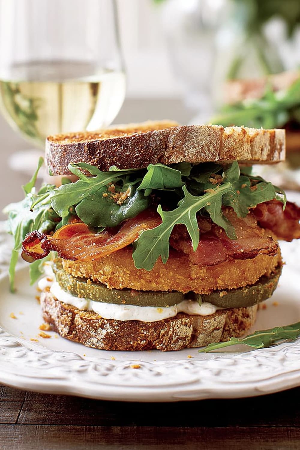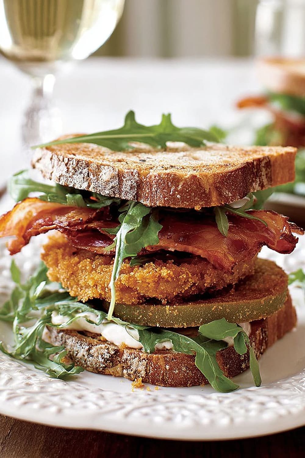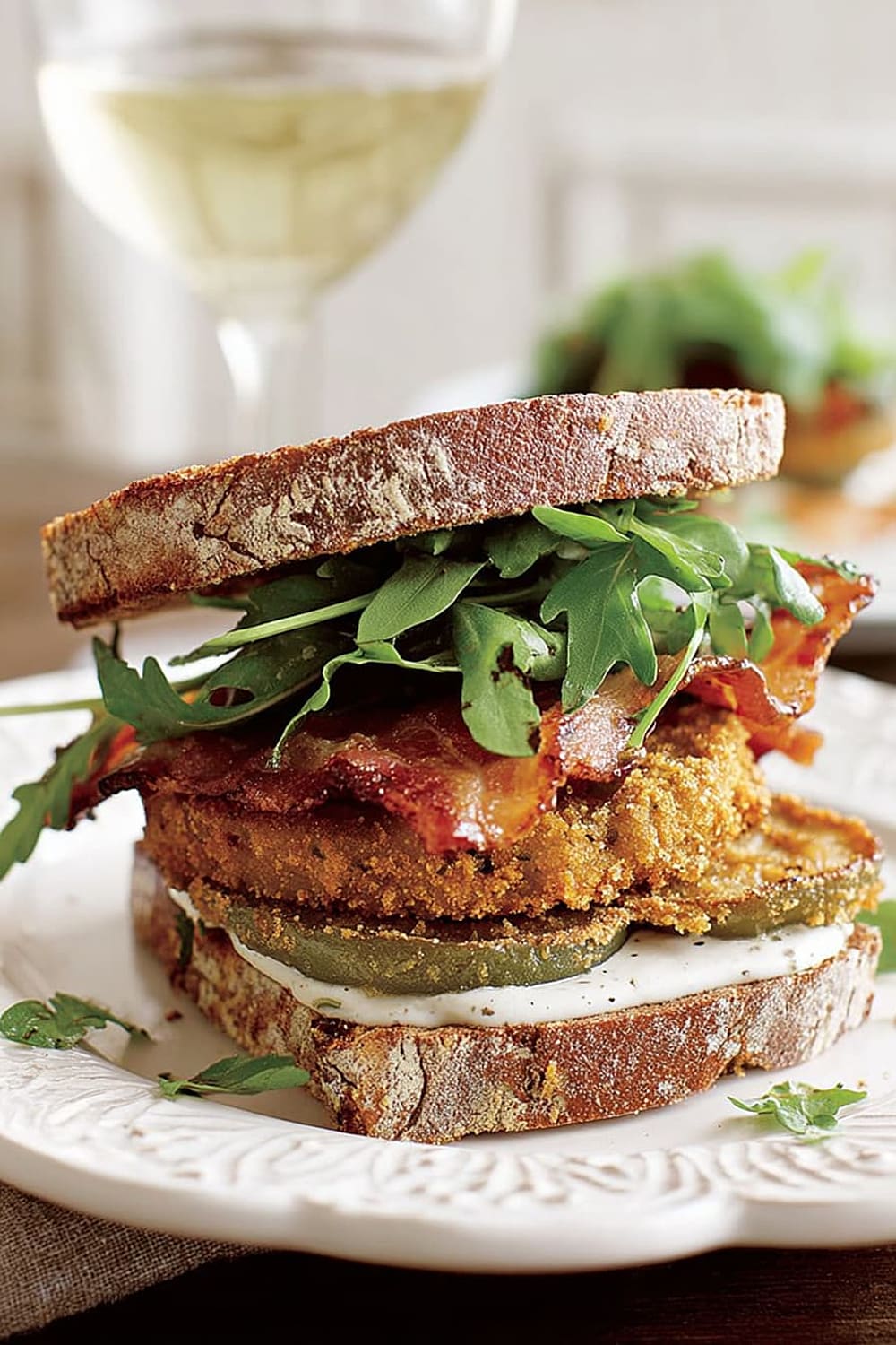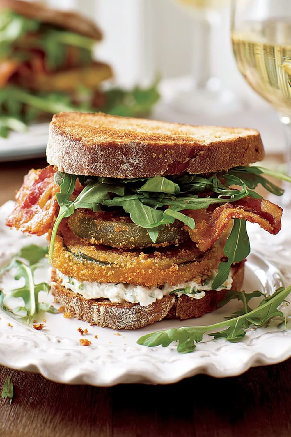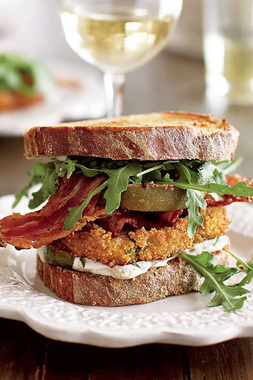 Picture this: tangy green tomatoes with a crispy exterior that gives way to a tender, slightly tart center, layered with smoky bacon and peppery arugula between thick slices of toasted multigrain bread.