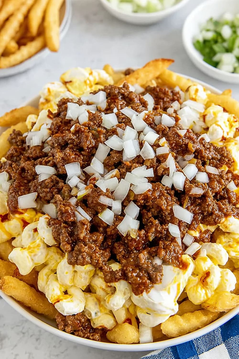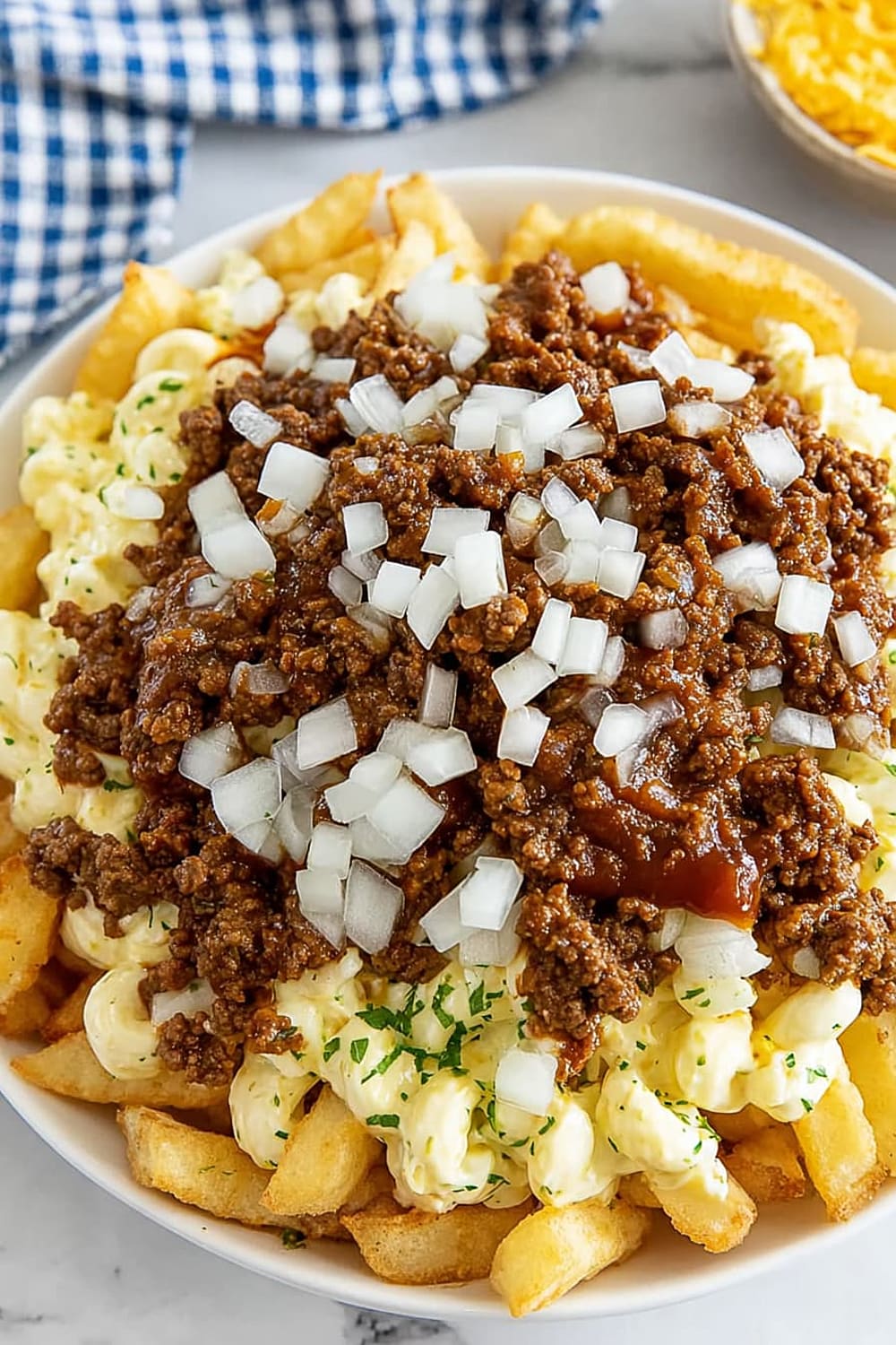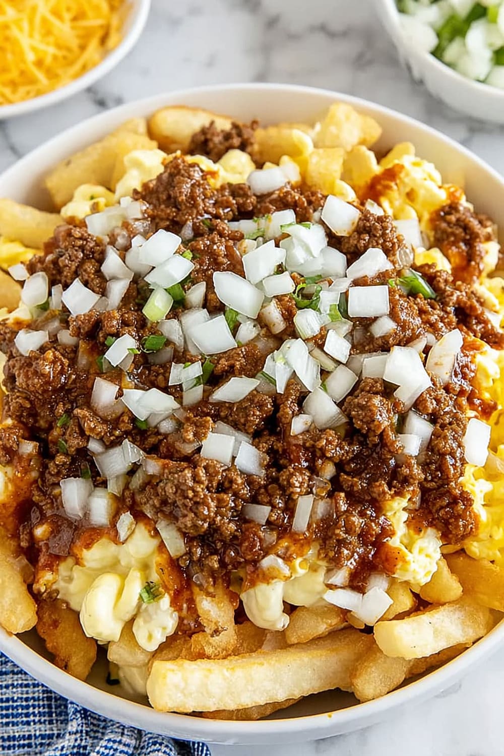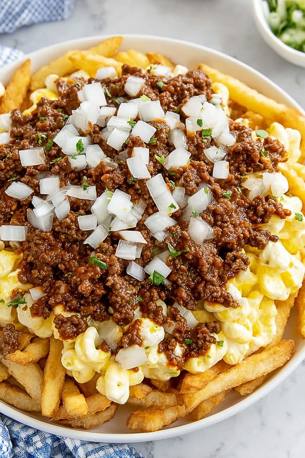 - 6 Sprinkle the ⅓ cup of fresh chopped raw onions evenly across the top, adding that sharp bite that cuts through all the rich flavors.