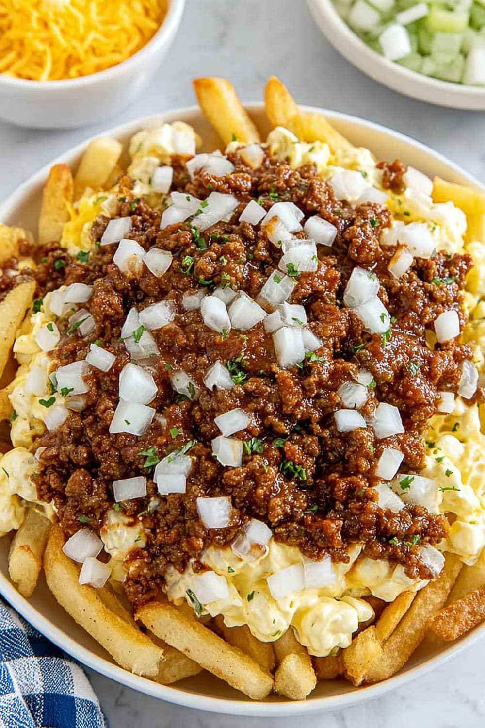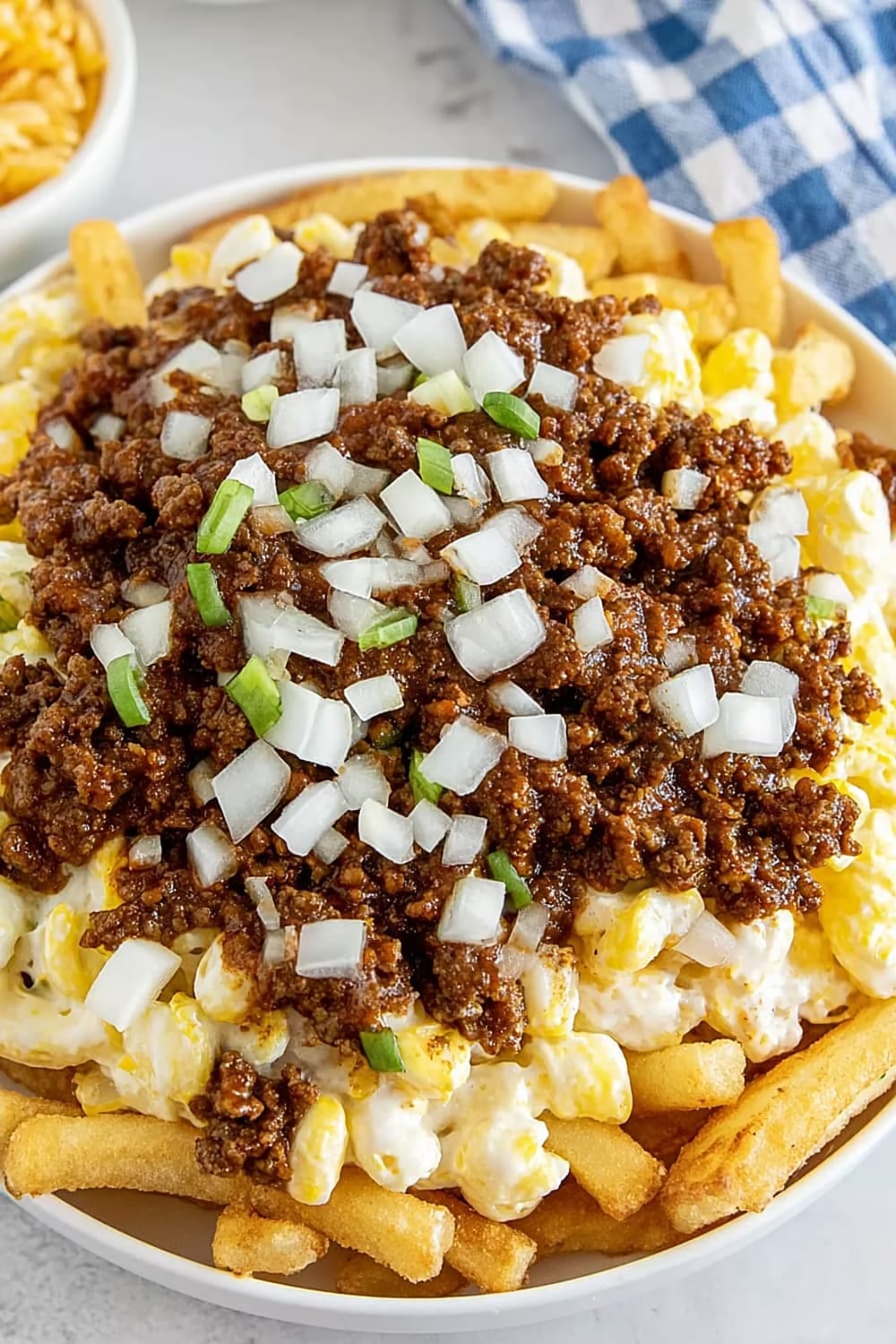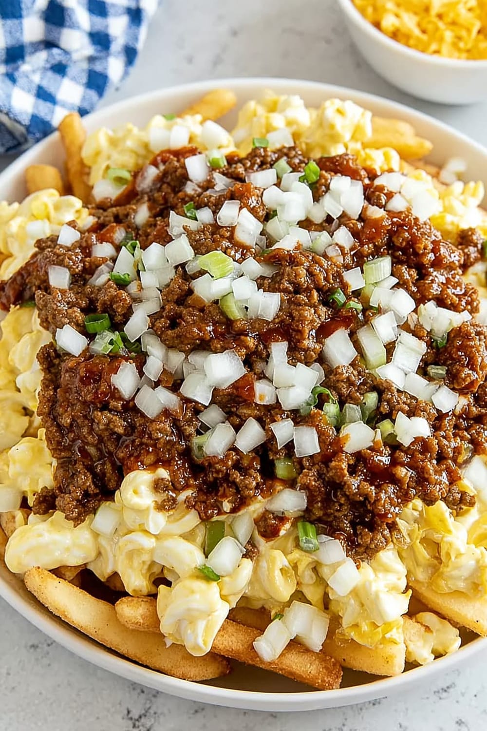 - 6 Sprinkle the ⅓ cup of fresh chopped raw onions evenly across the top, adding that sharp bite that cuts through all the rich flavors.