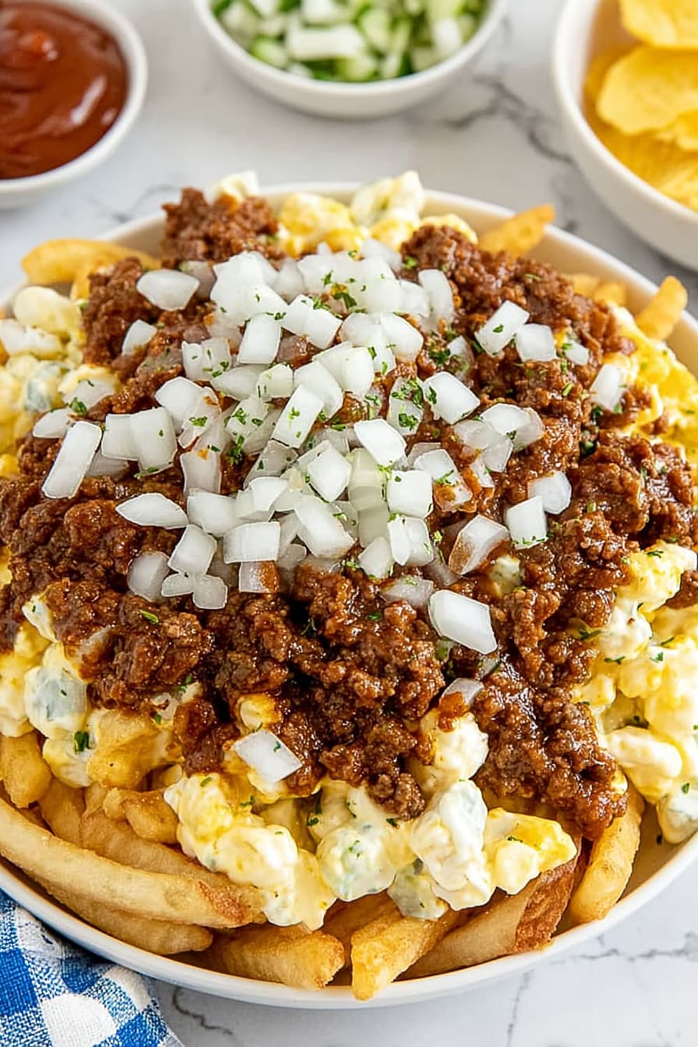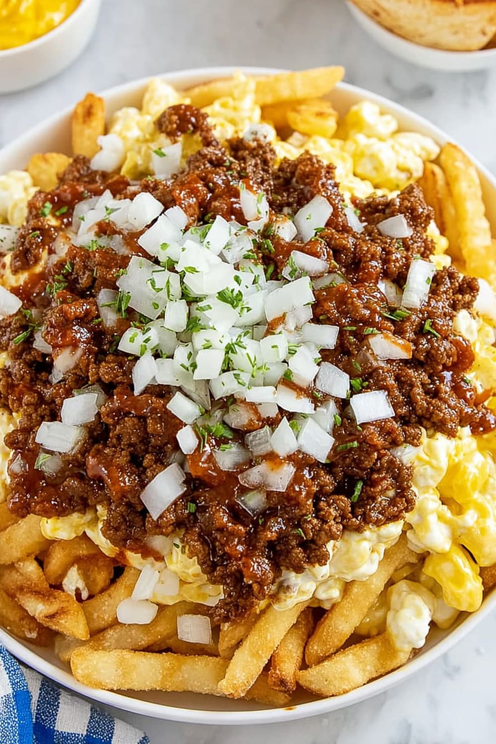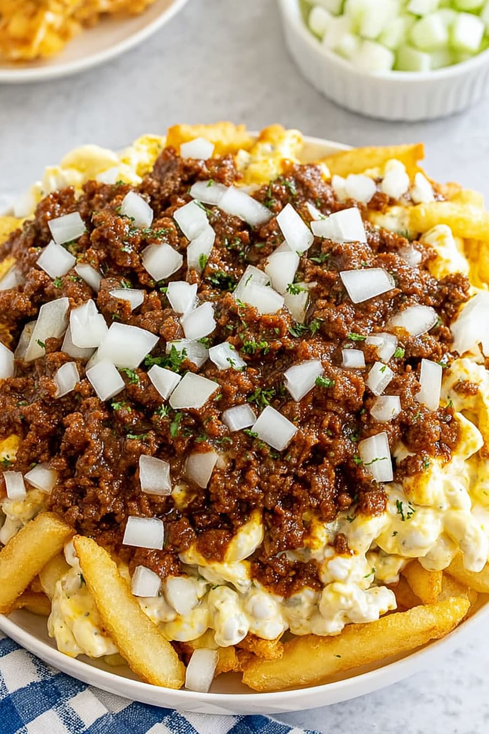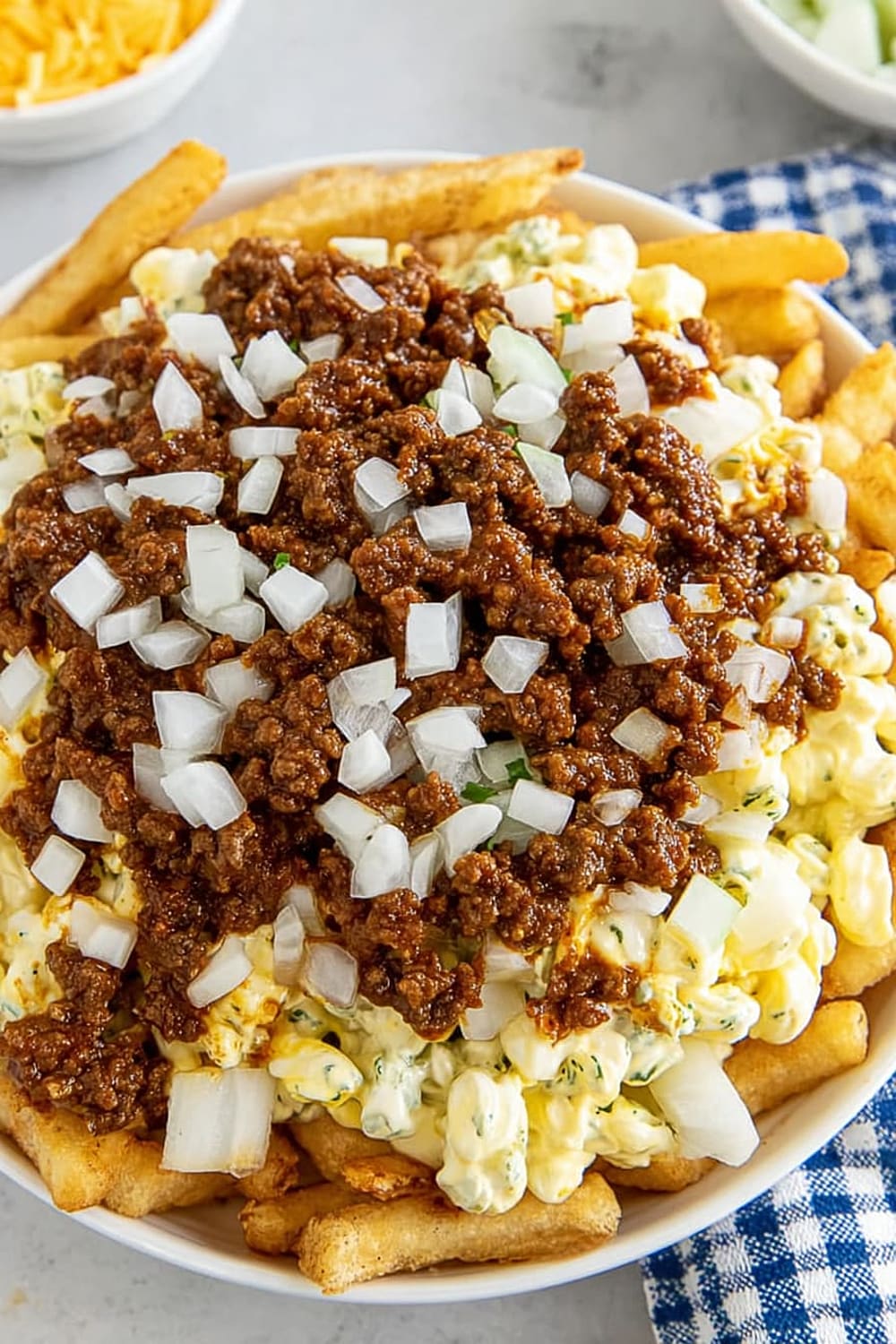- 6 Sprinkle the ⅓ cup of fresh chopped raw onions evenly across the top, adding that sharp bite that cuts through all the rich flavors.